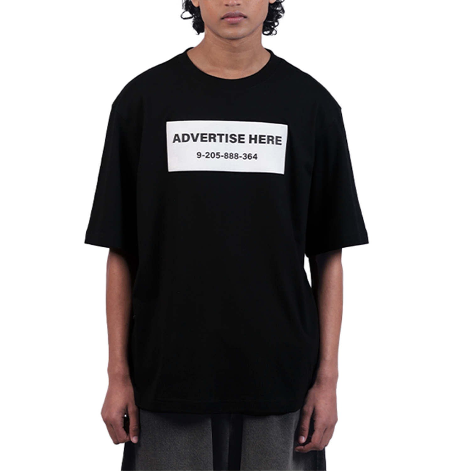 Product features water-based 3-D screen-printed and rubberized, 'Advertise here' graphic print on front and an 'Electricity pole' on the back.