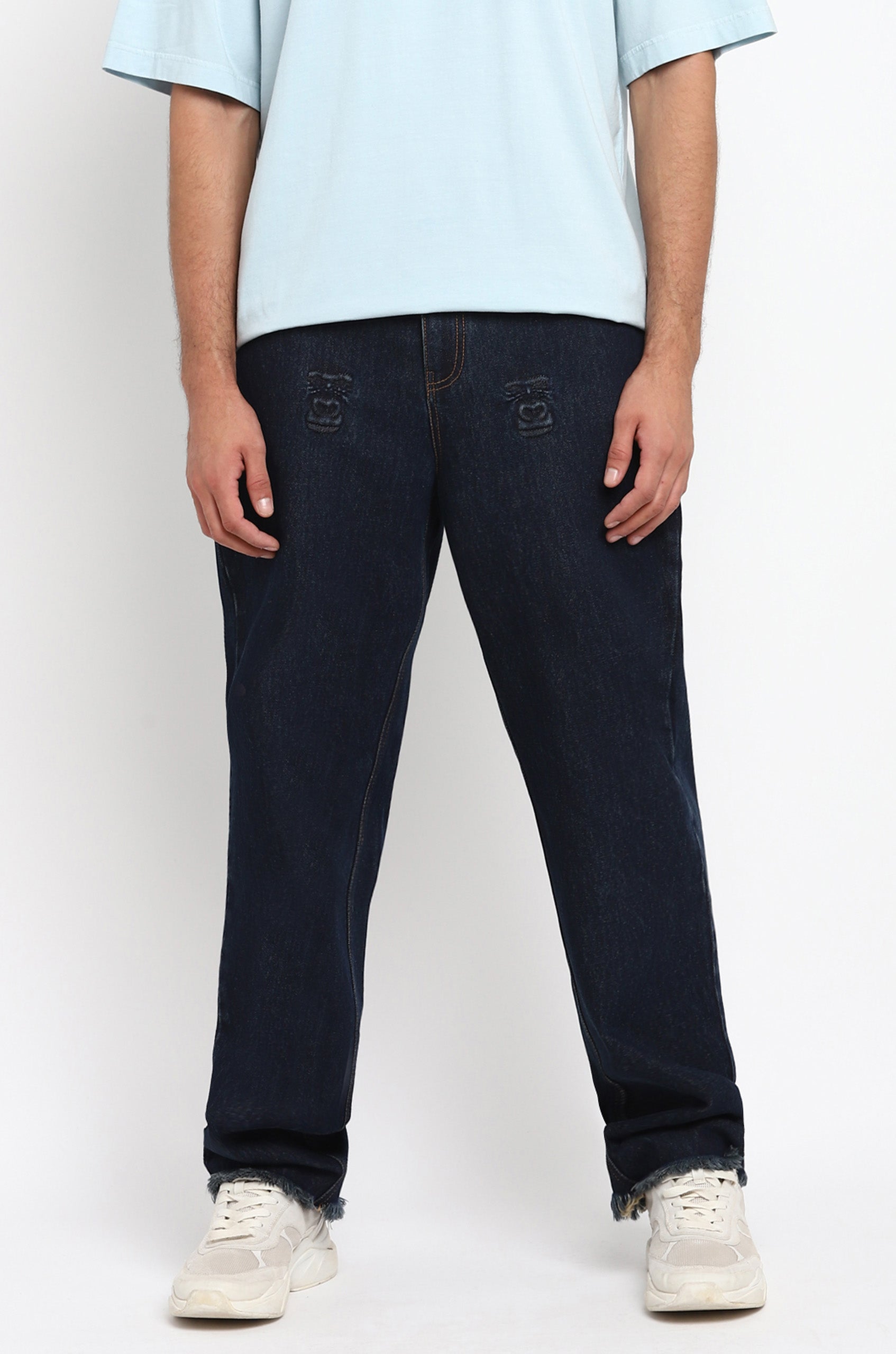 Constructed from 100% cotton, these jeans feature two distinct handcrafted 3D embossed effect HUEMN gorilla face insignias on each side, on front, finished with contrast beige thread detailing and raw hemline details.