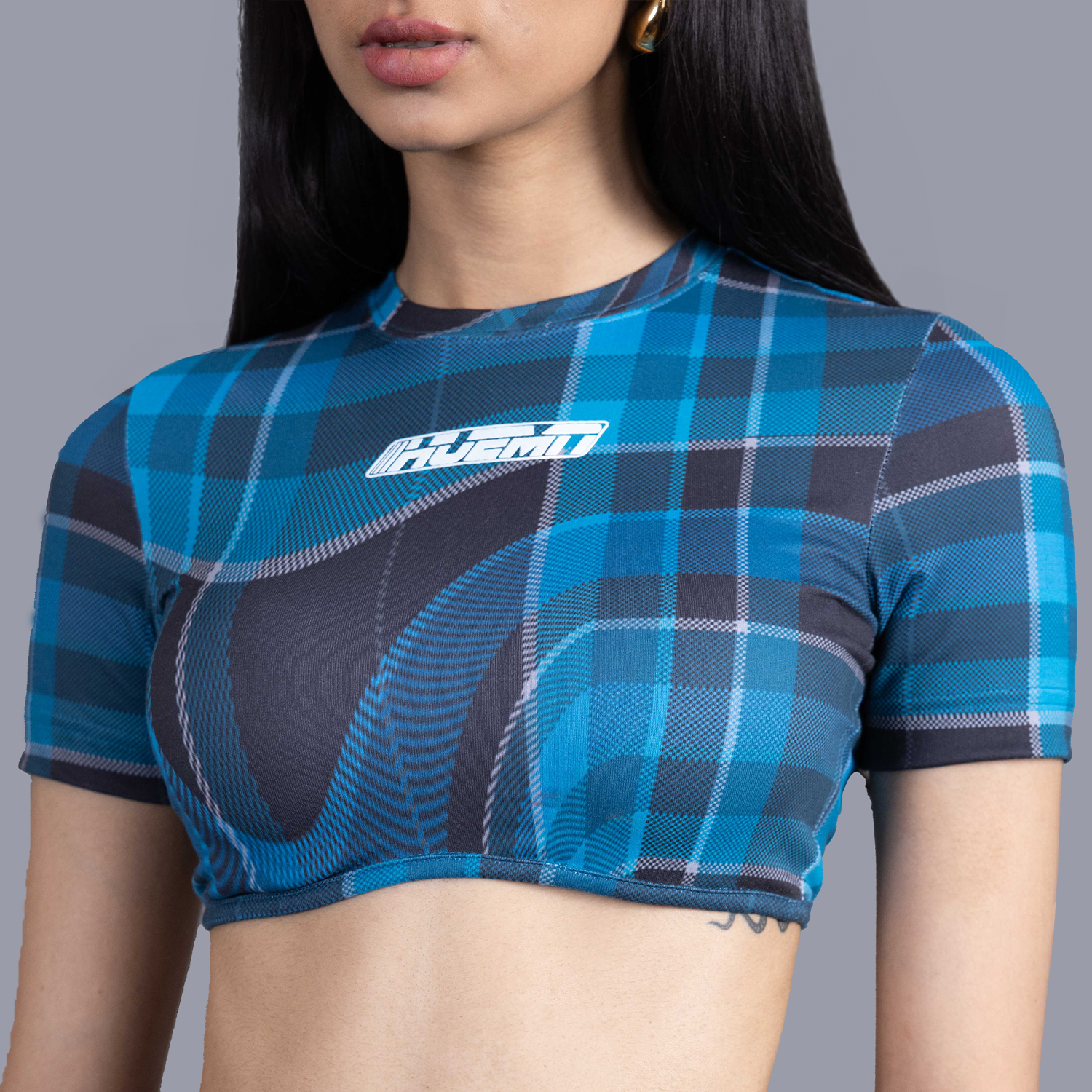 Cropped t-shirt featuring a digitally printed madras check pattern.