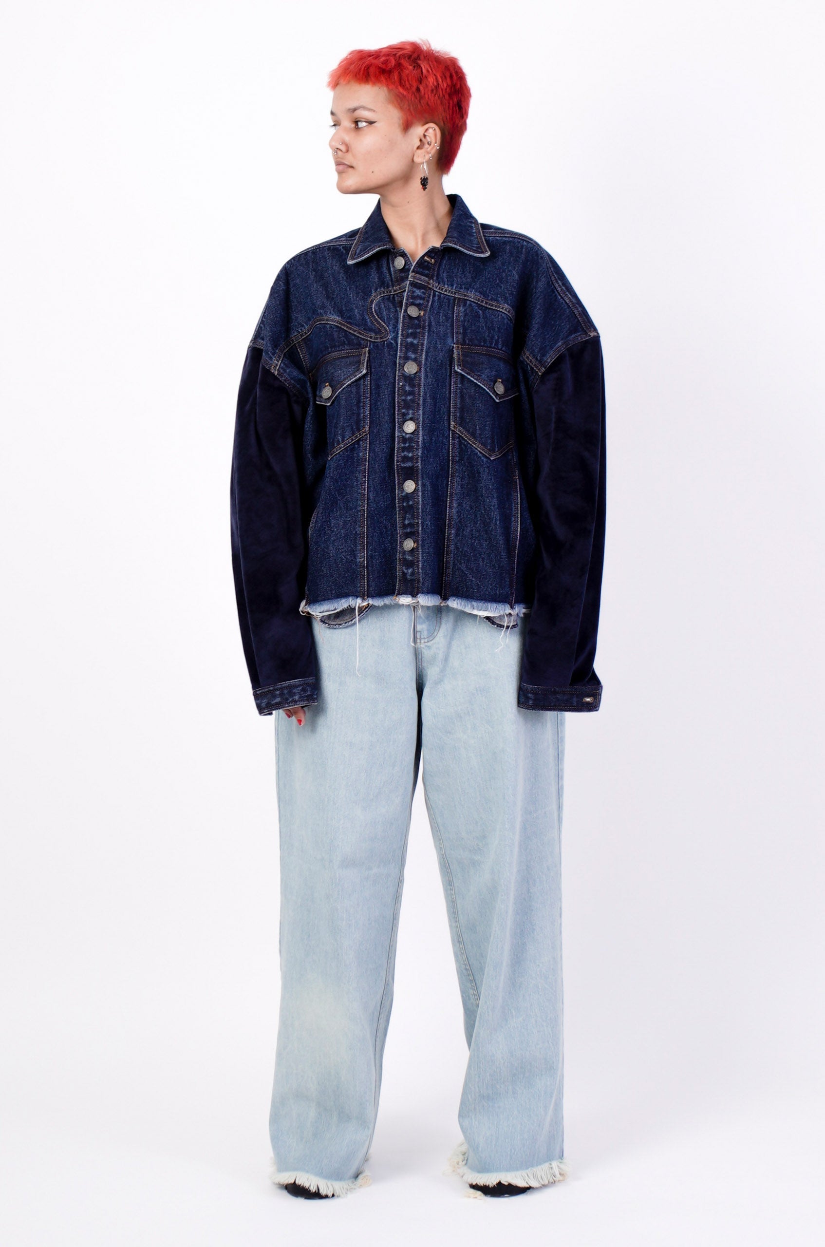 100% cotton denim, unisex, cropped jacket in signature HUEMN shape with 100% silk velvet sleeves.