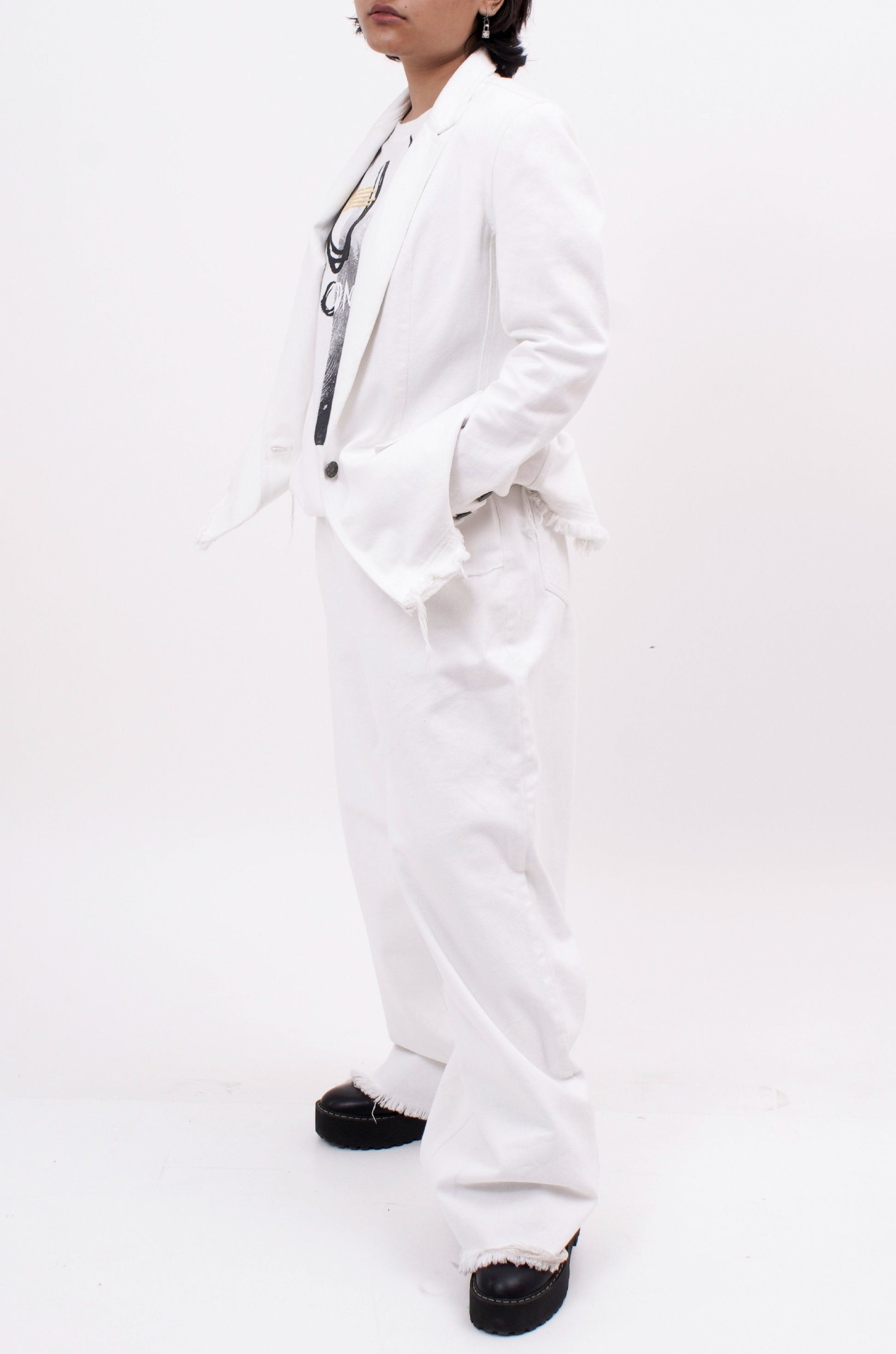 100% cotton, unisex, single-breasted, Denim blazer with frayed, raw edge detail. The denim has been given a soft-wash for a finer feel.