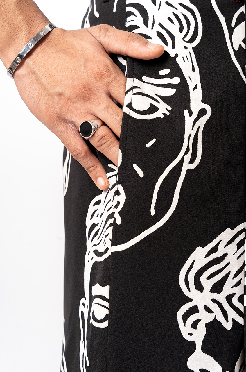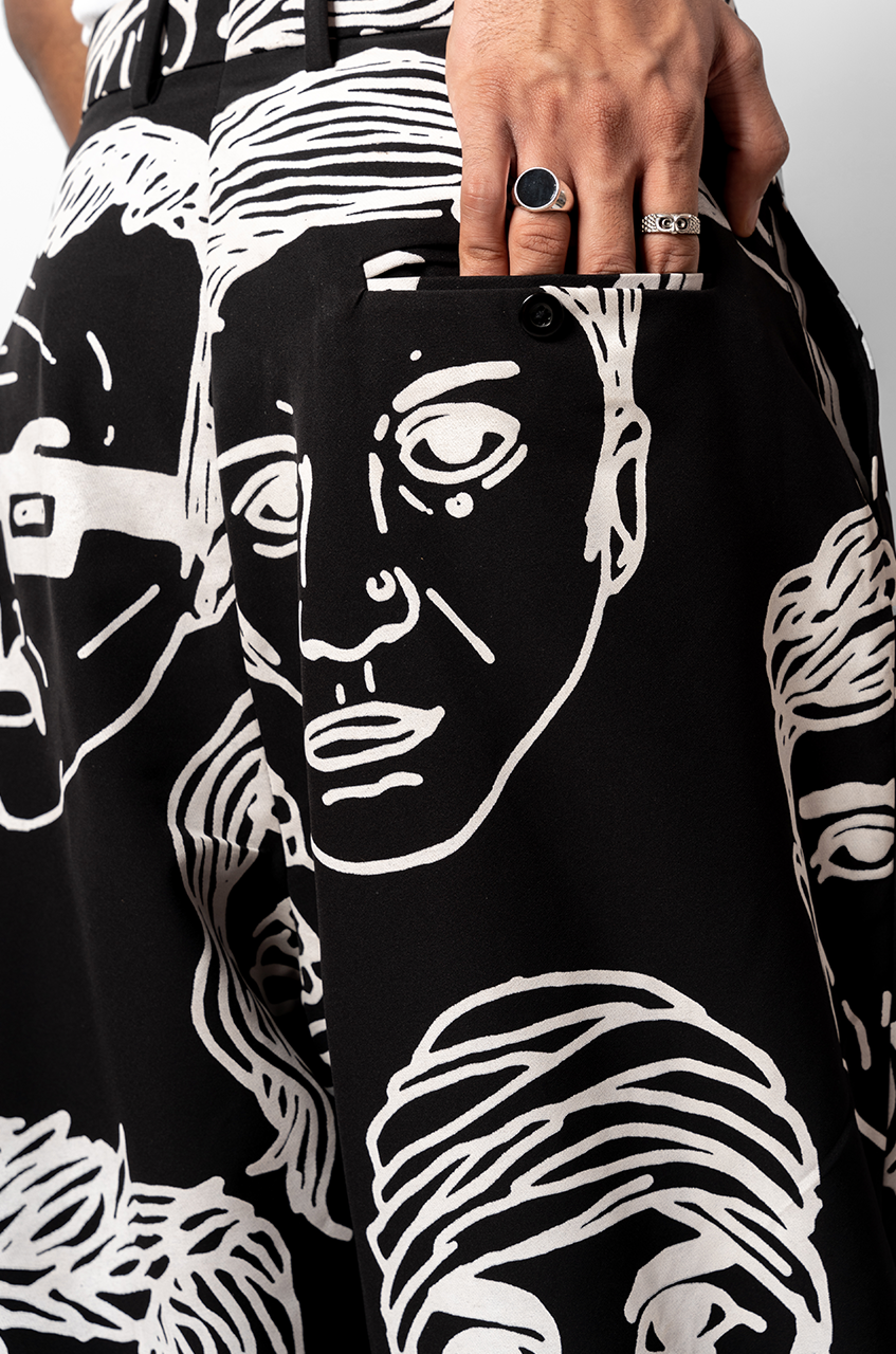 This product features an oversized faces screen print in a white overall print.