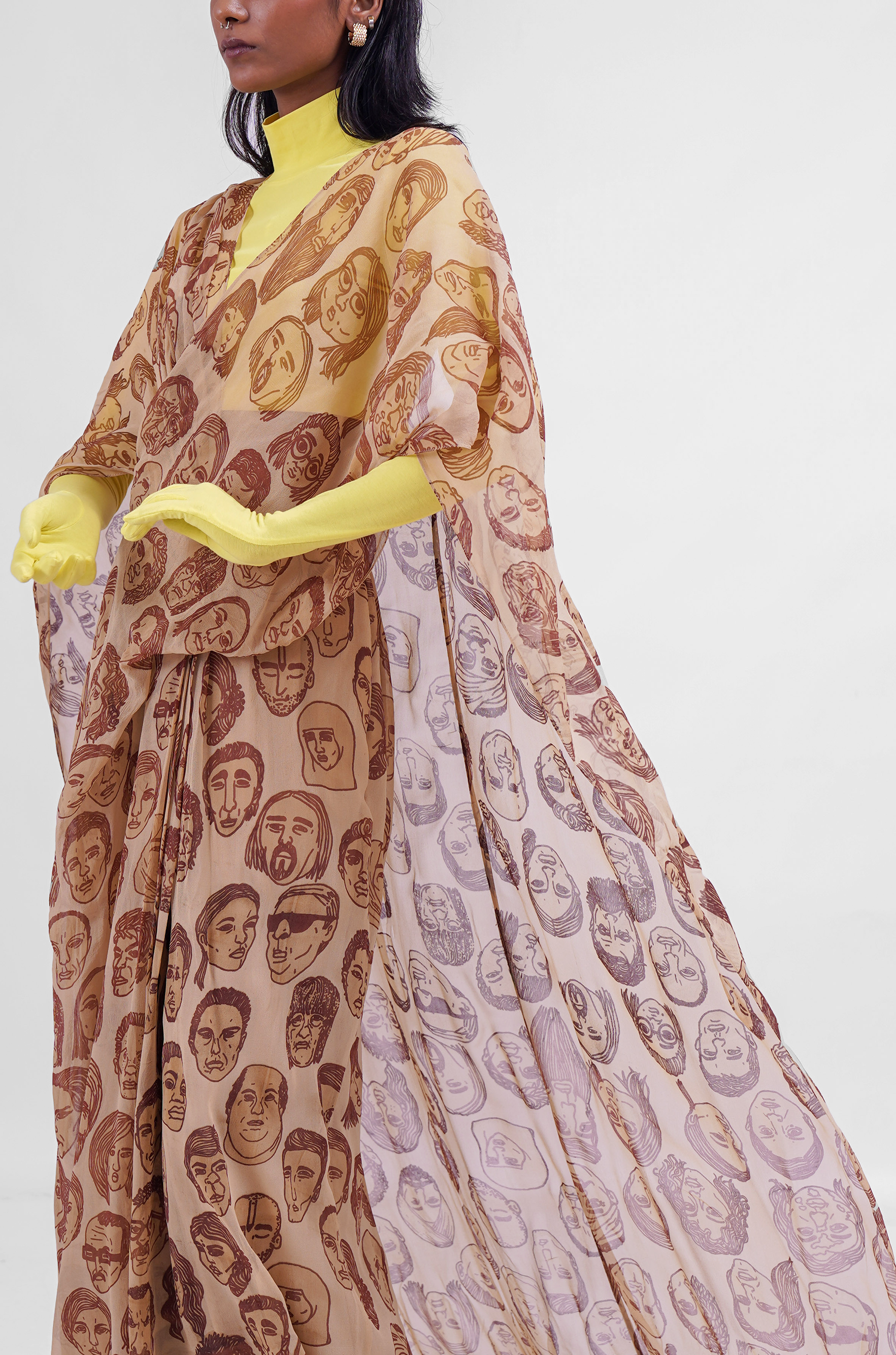 The world's first Dual-Pallu Sari-Pants. This is a one of a kind HUEMN's silhouette innovation in a beige palette with the classic diversity screen print.