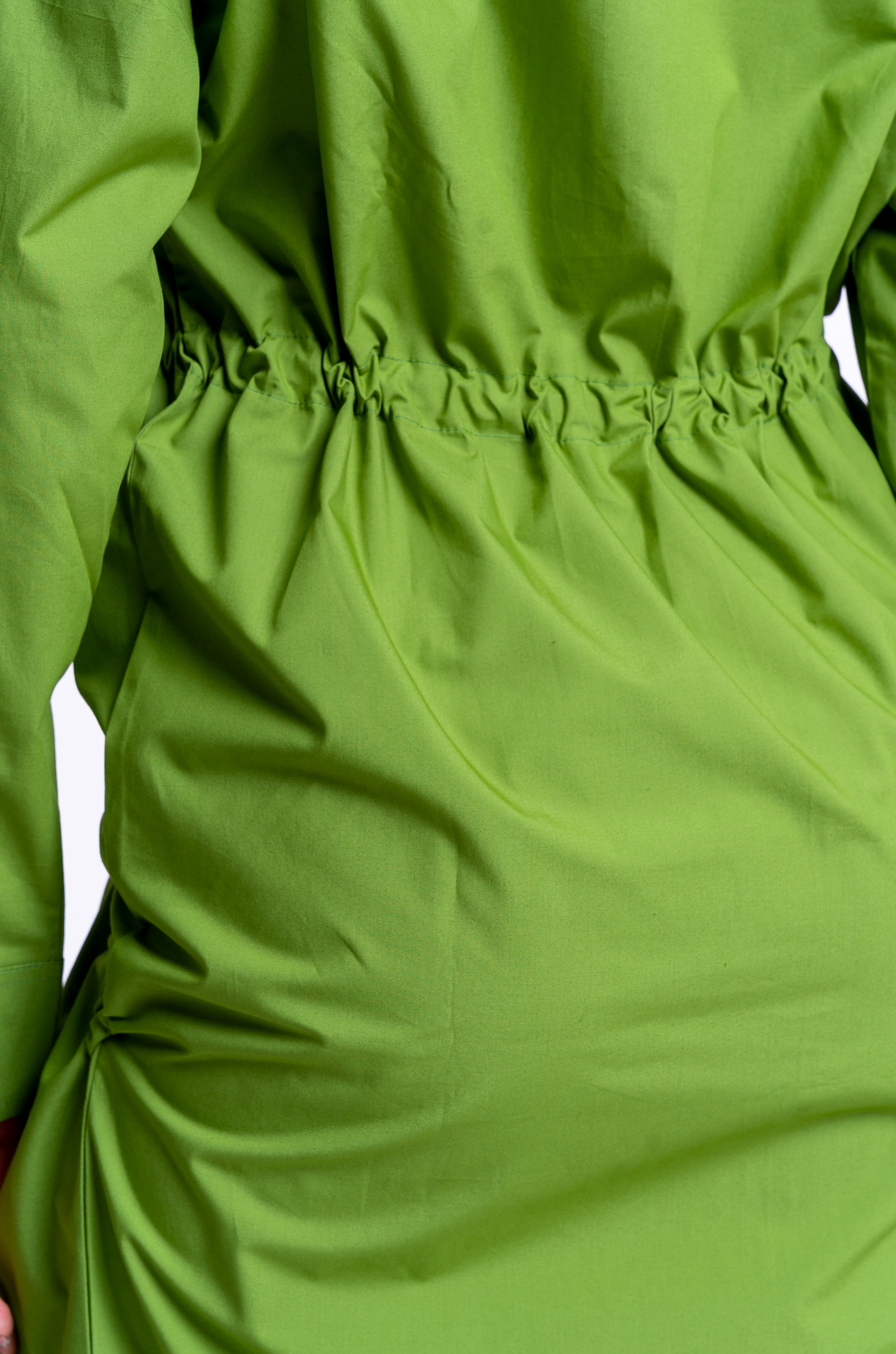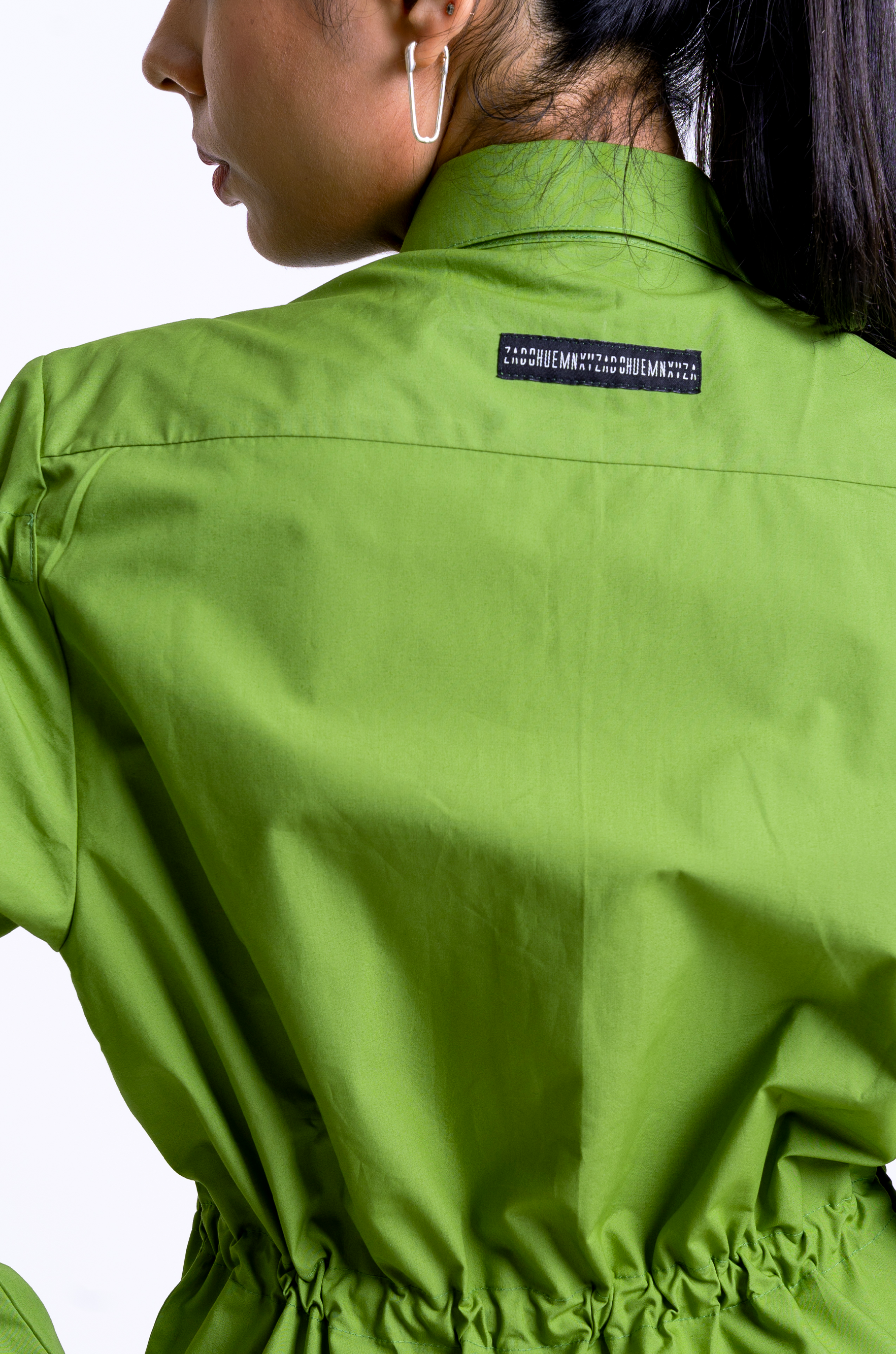 100% cotton button-down shirt dress in an olive palette - featuring multiple drawstrings detail.