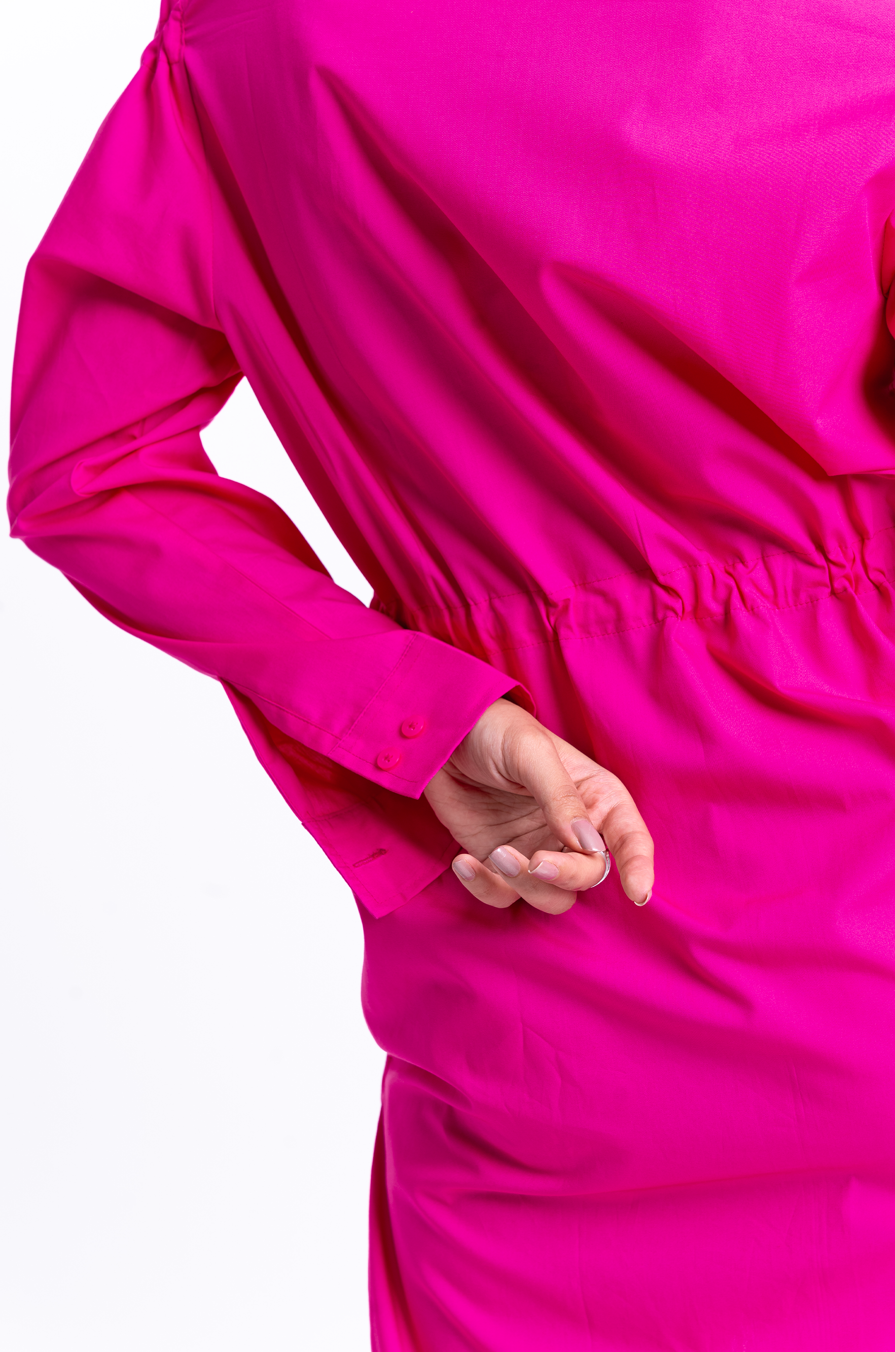 100% cotton button-down shirt dress in a Hot Pink palette - featuring multiple drawstrings detail.