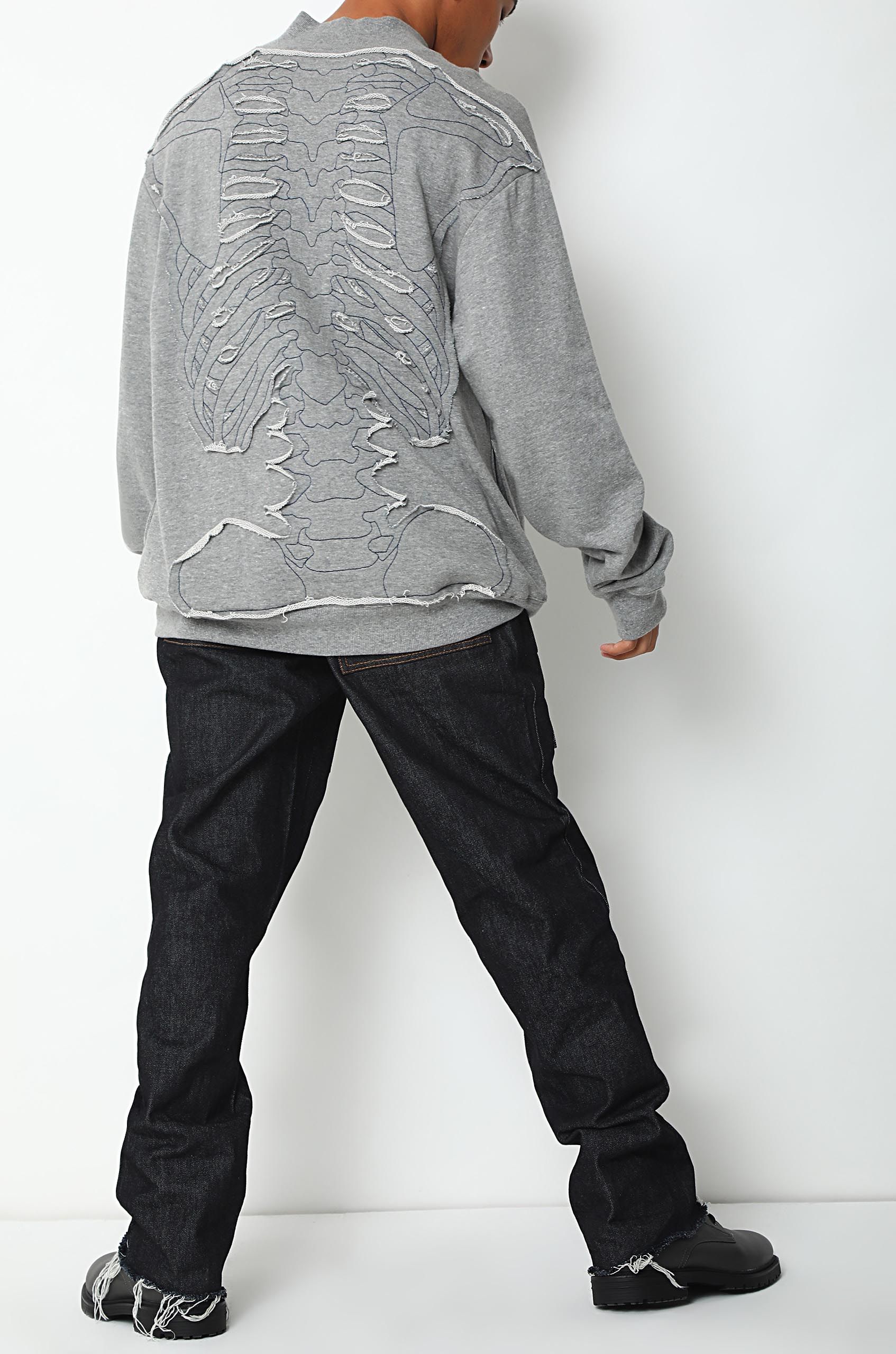 The technique is a signature Huemn handcraft in which an artwork of the human spine is re-created by our embroidery artists in contrast thread on a tonal fabric. This panel is then hand-cut and treated with a raw edged finish and basted impeccably on the entire back of the sweatshirt.