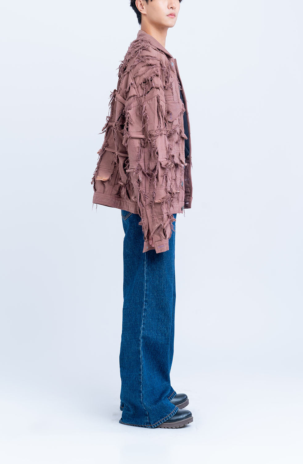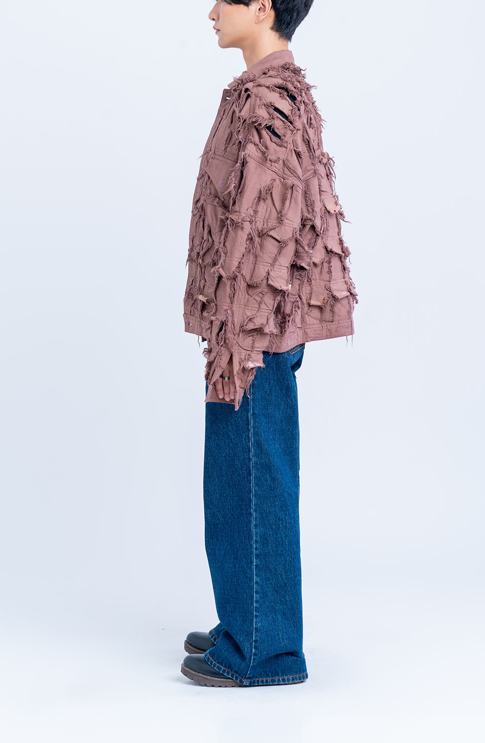 This HUEMN jacket features a uniquely handcrafted surface. A long sleeve denim jacket, with surface made from a 1000 denim panels juxtaposed together.
