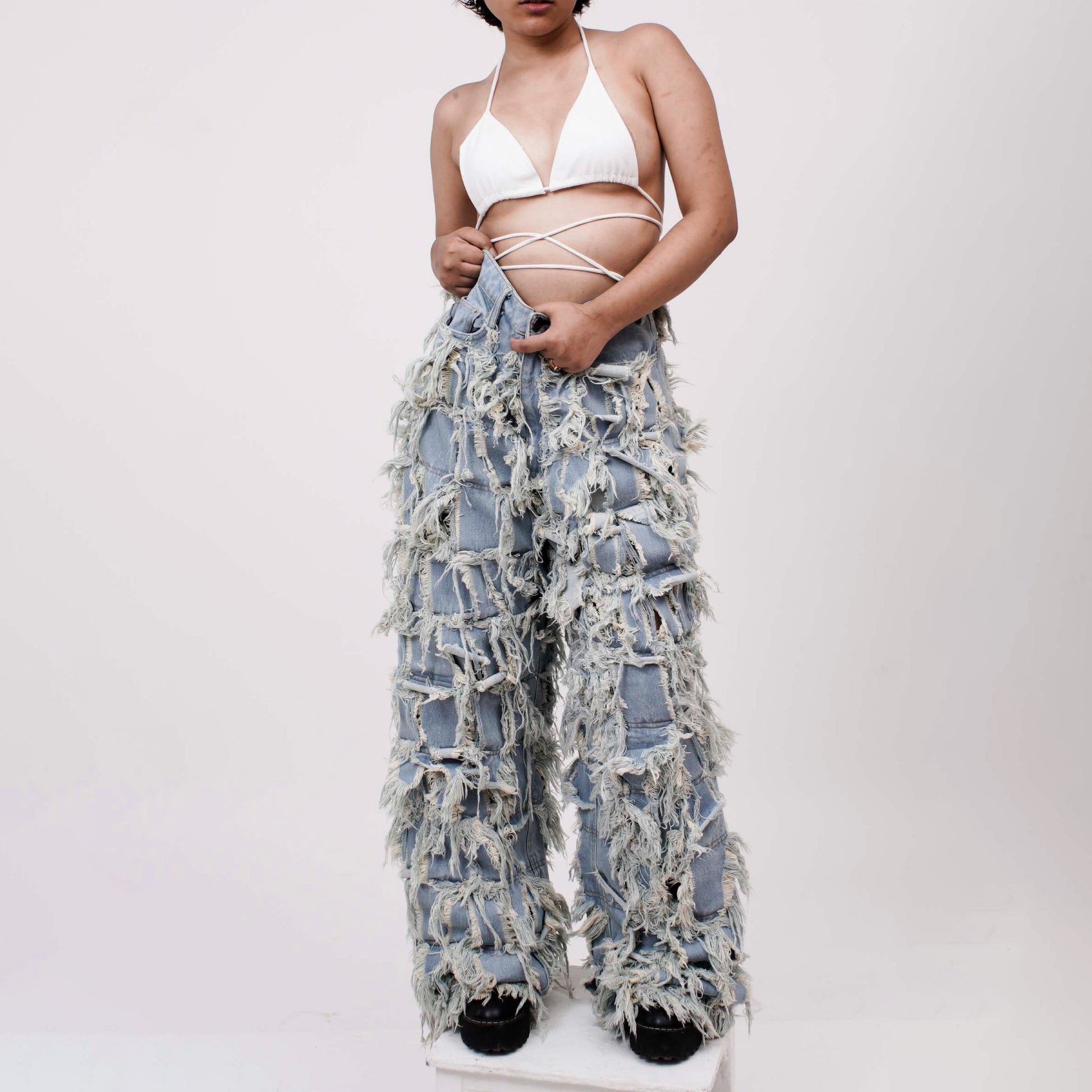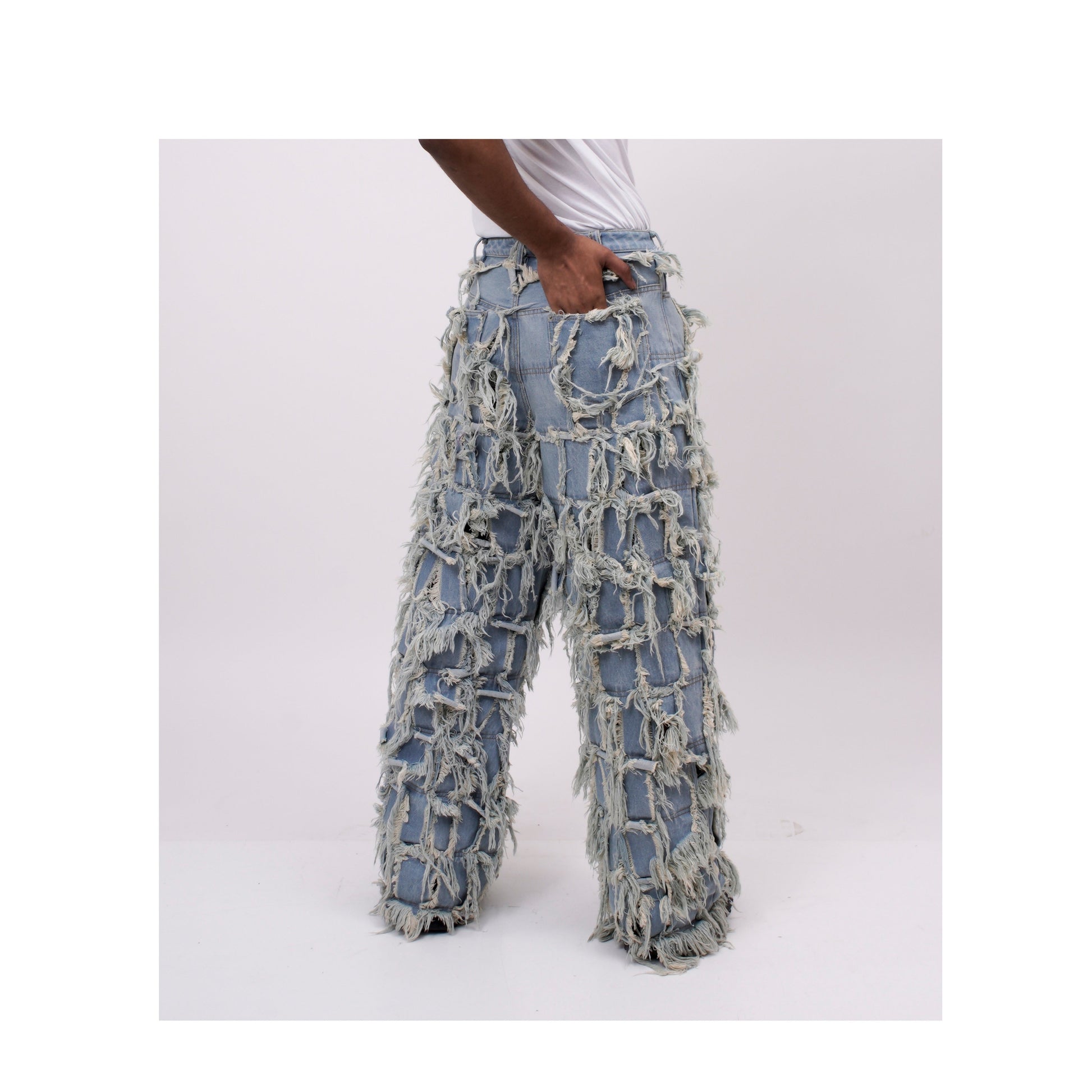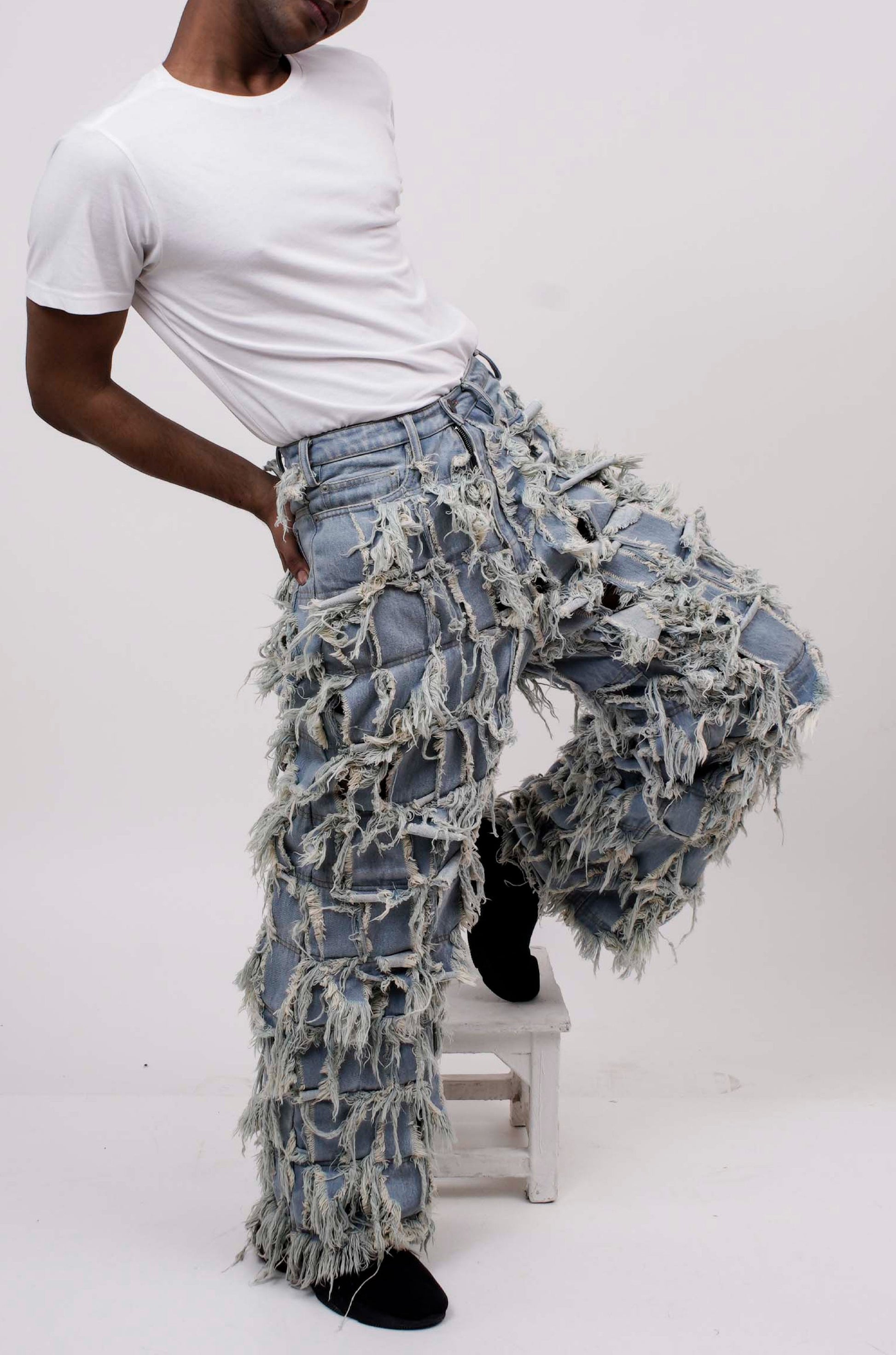 This pair of limited edition jeans is meticulously crafted by artisans of HUEMN to be uniquely distressed with multiple denim panels.