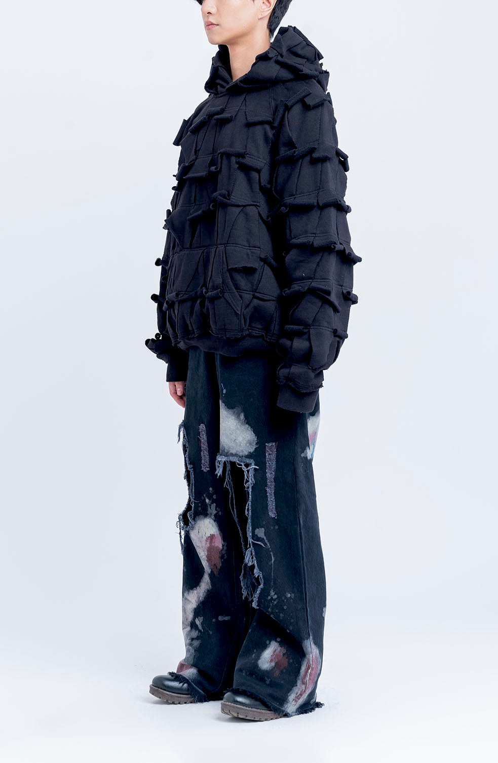 100% cotton-terry, unisex hoodie with handcrafted, in over a hundred man hours with multiple panels juxtaposed together.