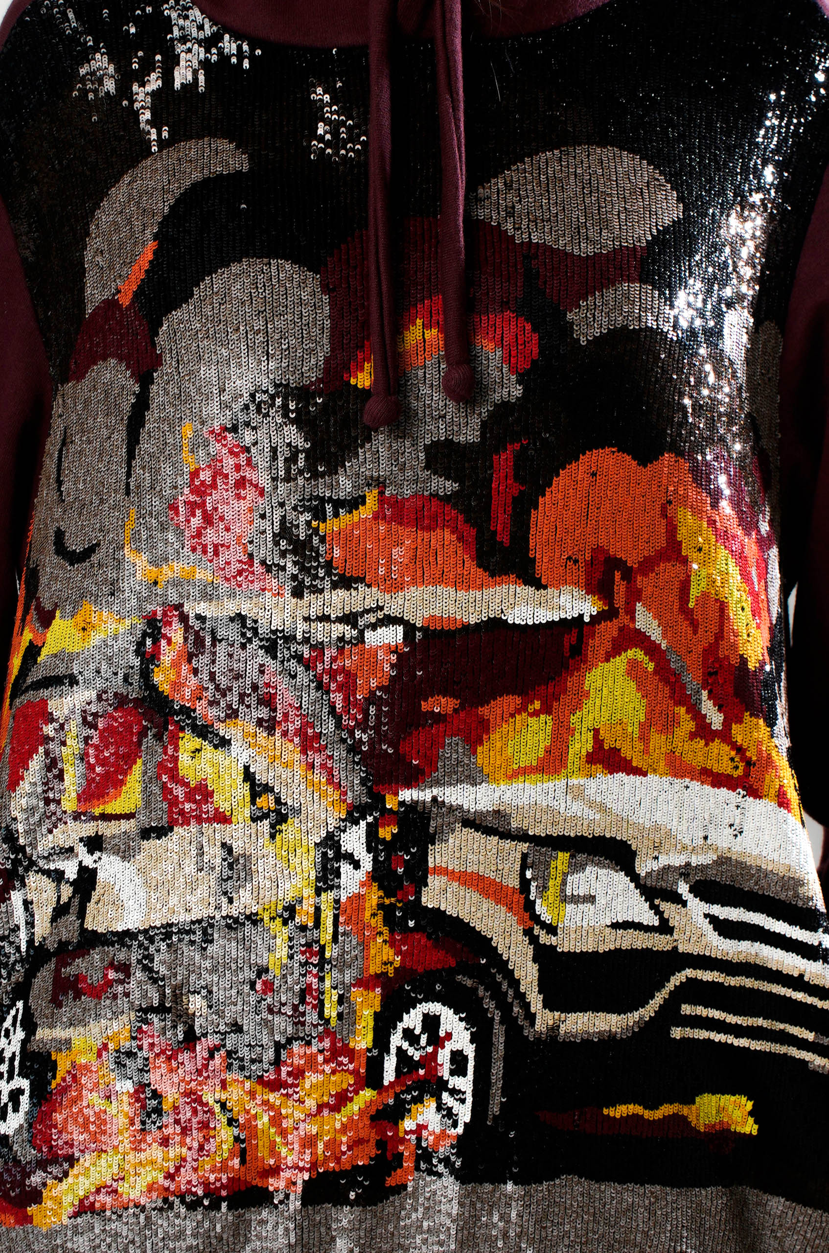 100% cotton-terry, unisex hoodie with handcrafted, embroidered front panel created with thousands of minute hand-embroidered stitches with multi colored sequins made in over 200 man-hours, inset in soft cotton fleece.