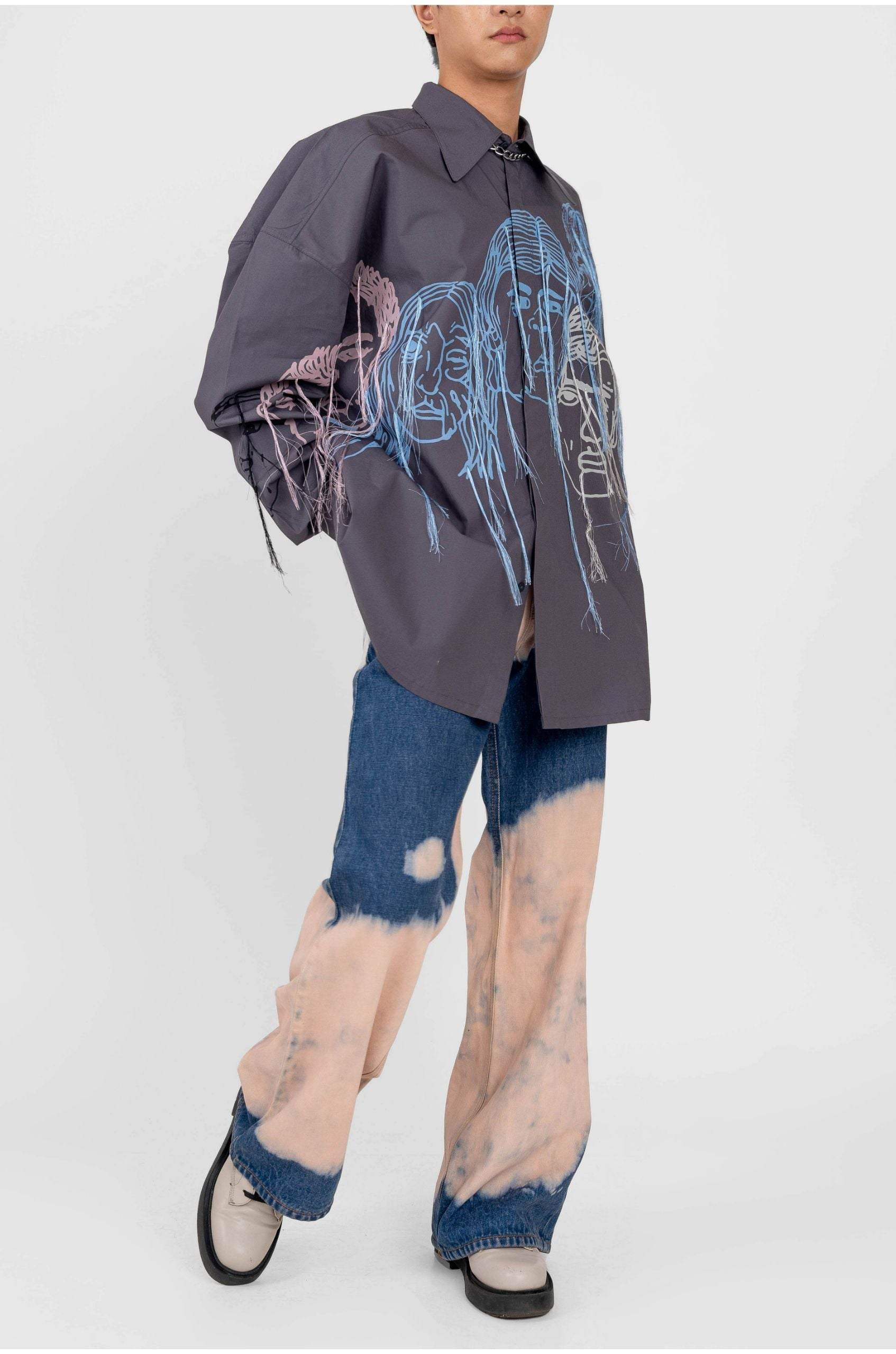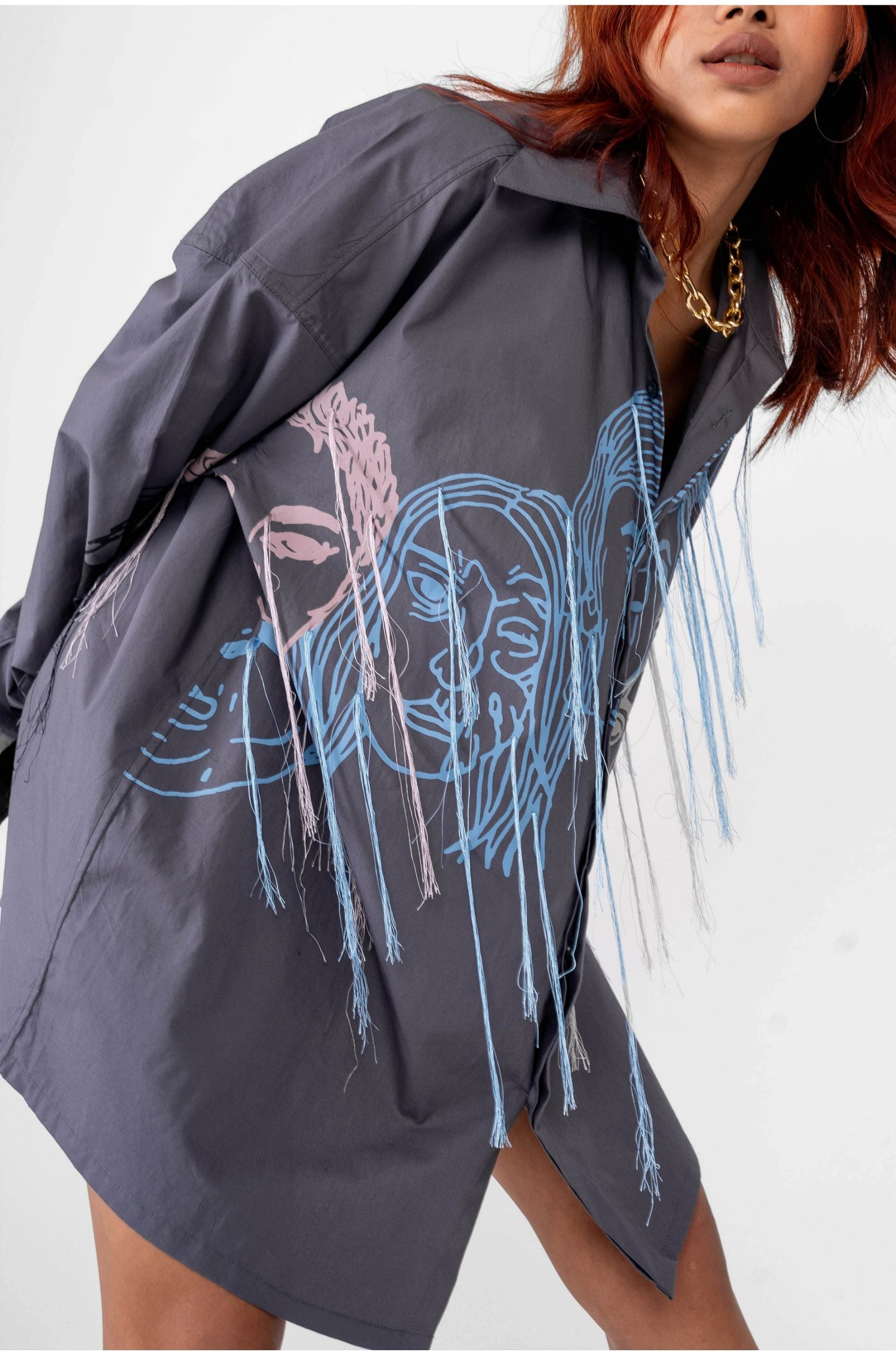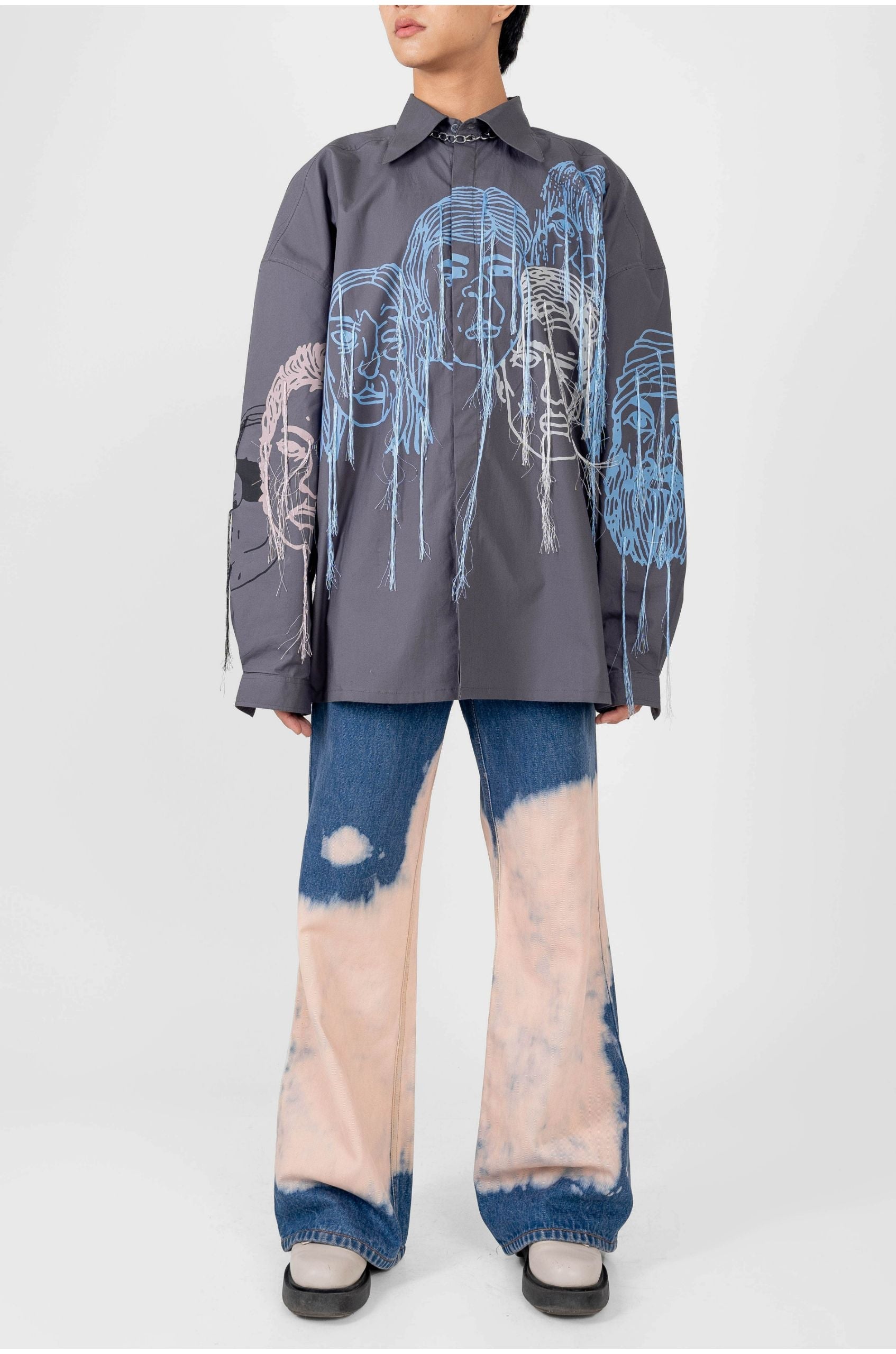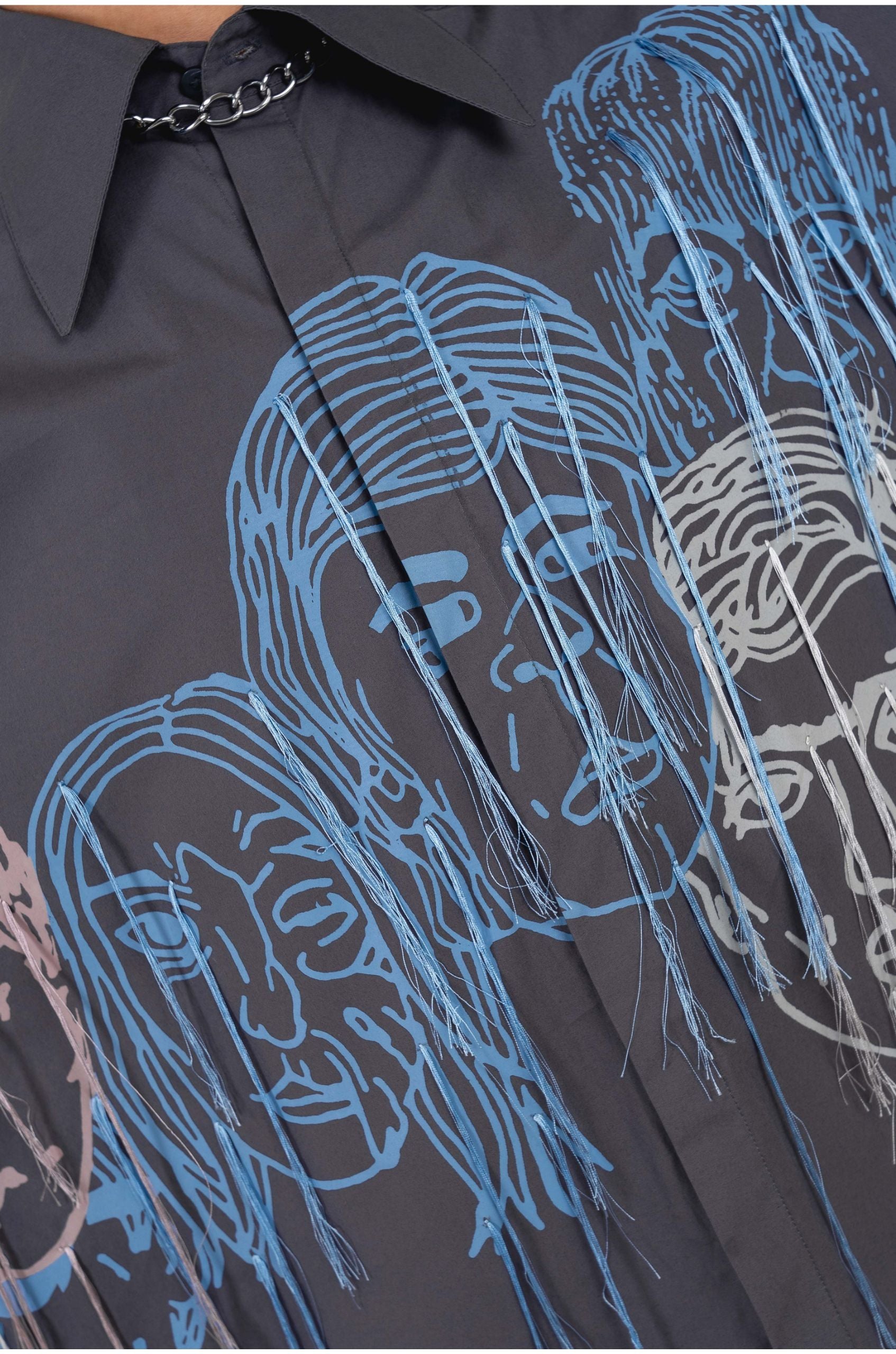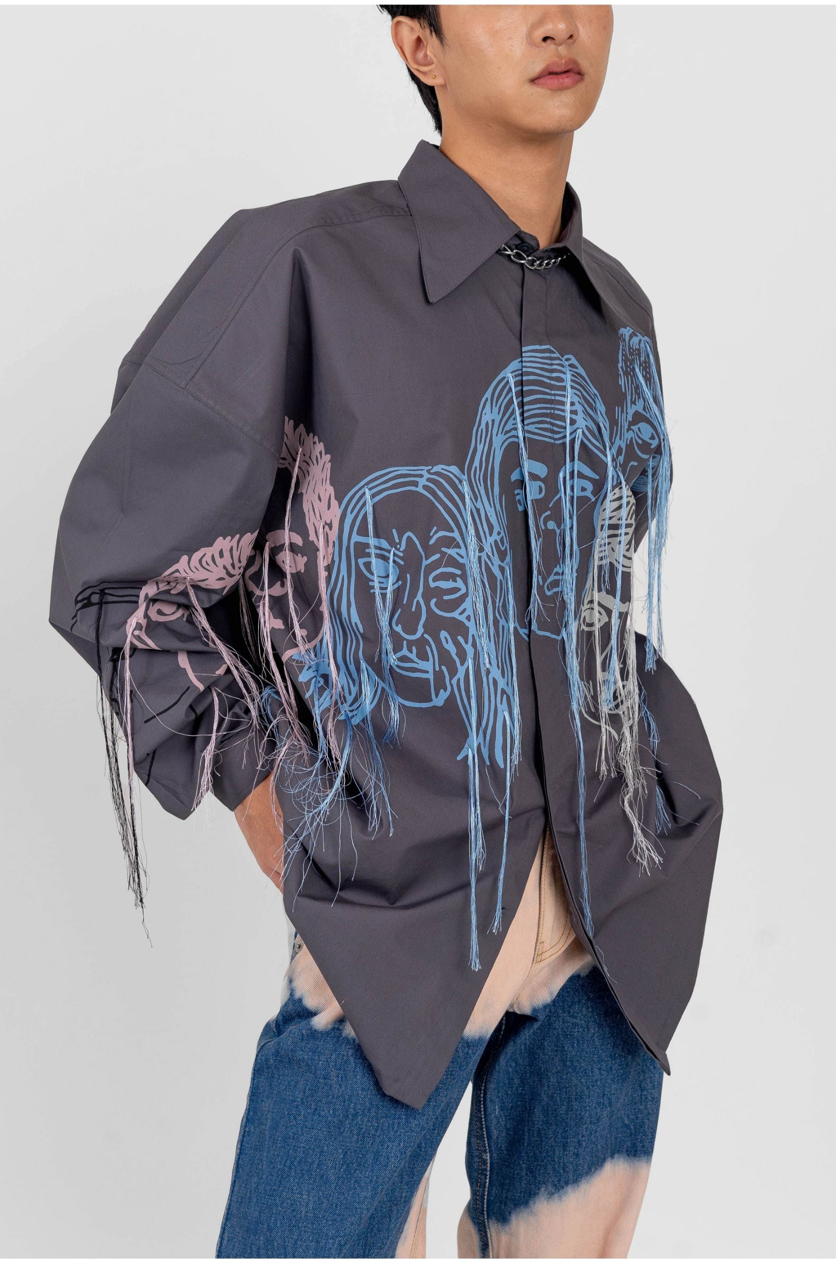 The product features a faces screen print in multiple colours with embroidered silk threads streaming out from the print.