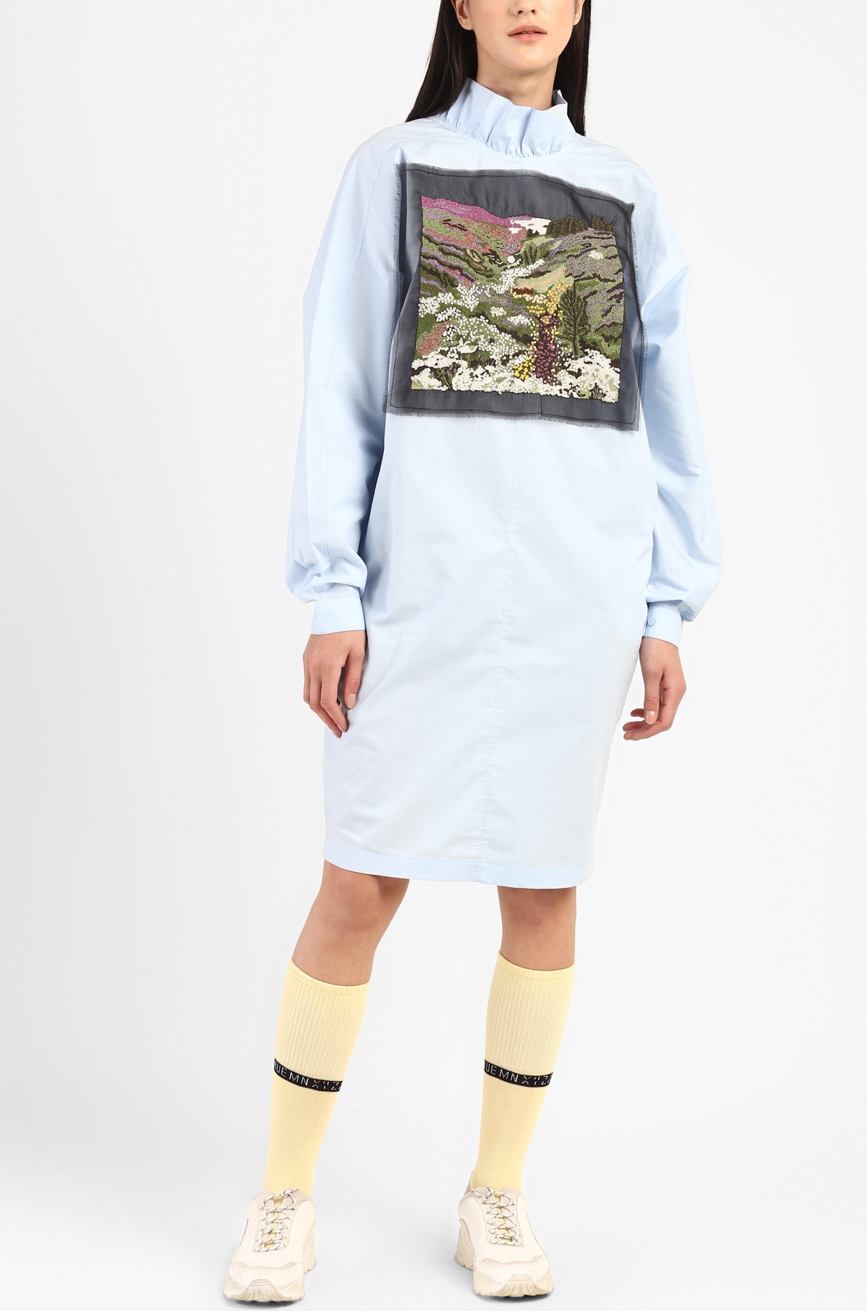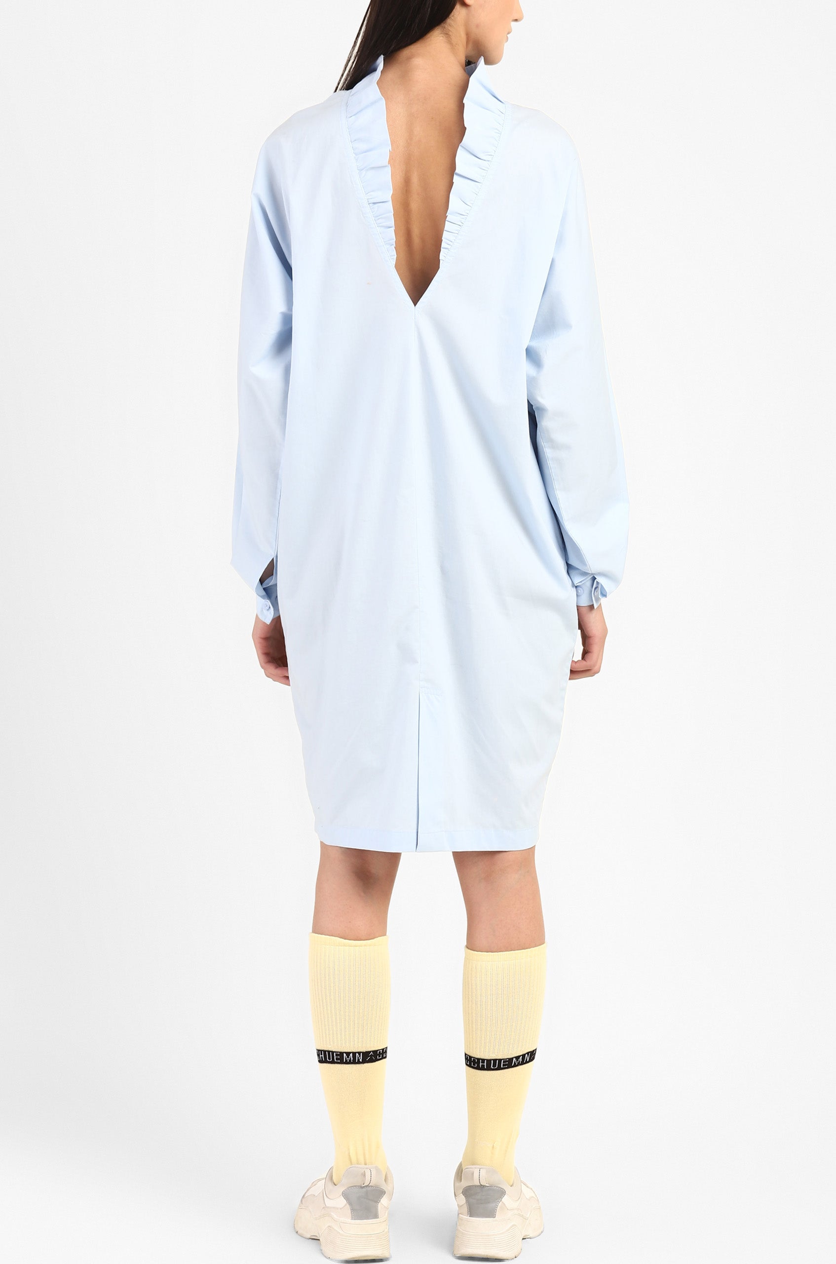 100% cotton poplin dress in soft powder blue with a plunging V neck ruffled back, back slit for ease of movement and side pockets.