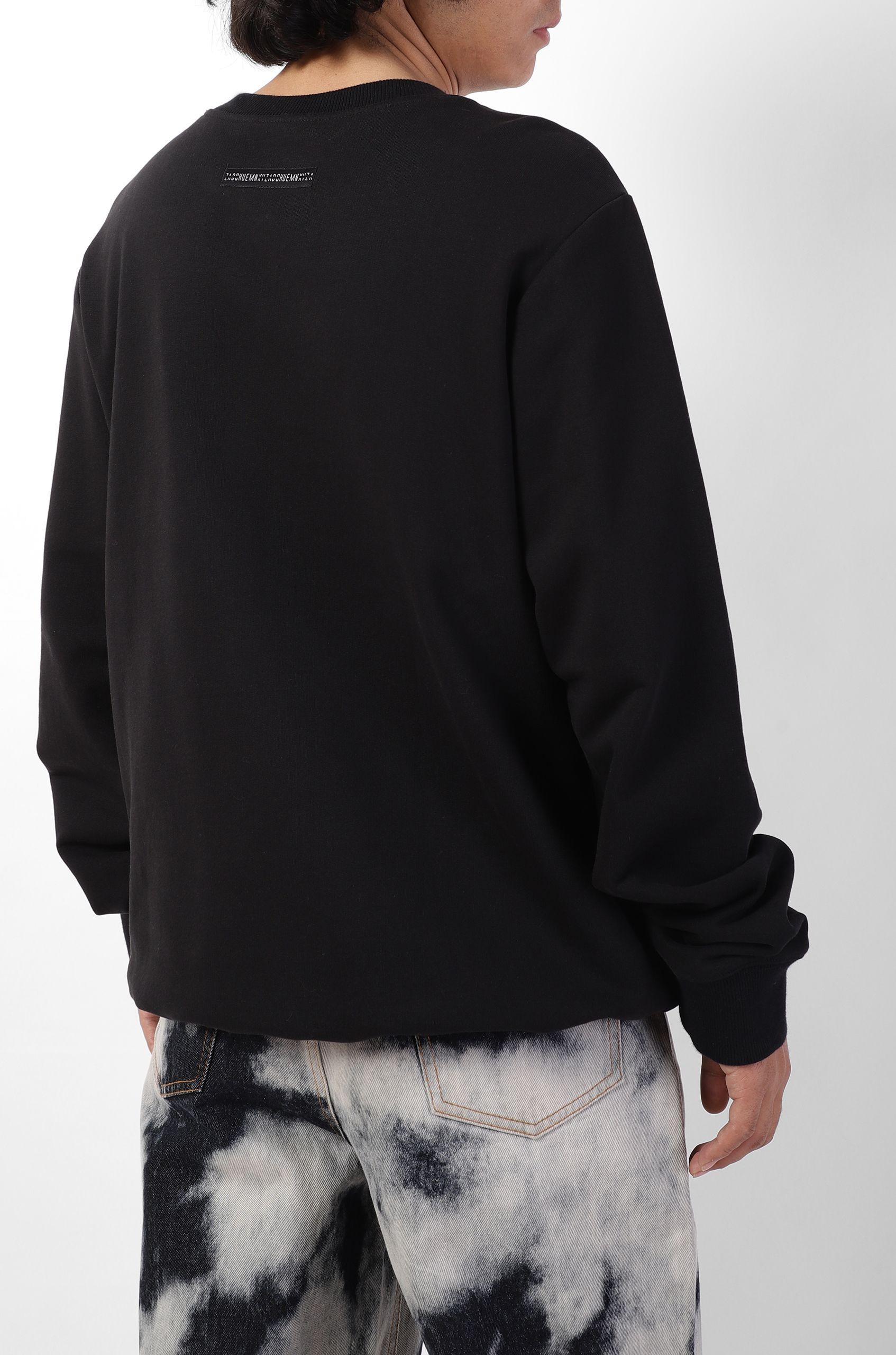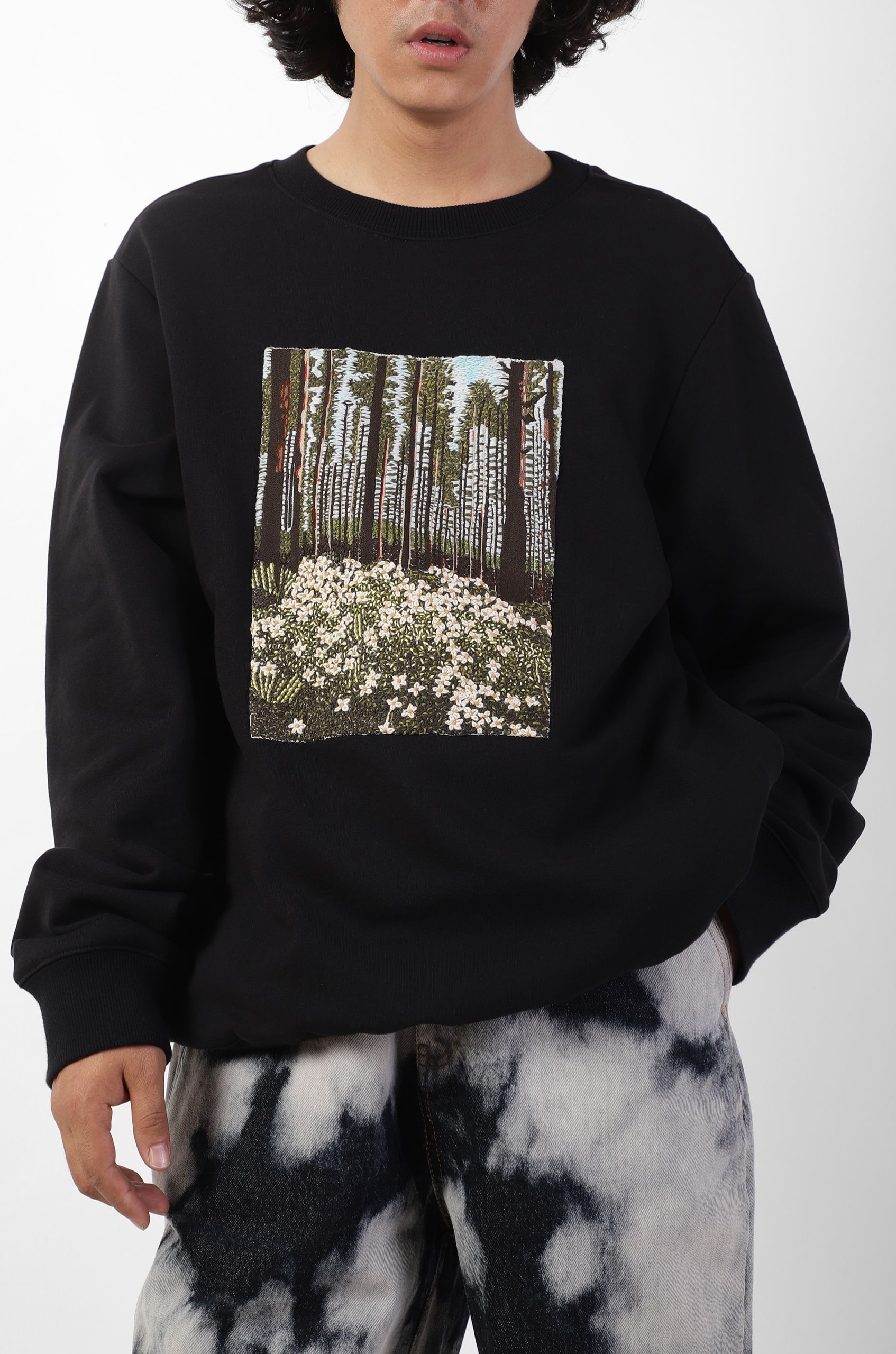 100% cotton-terry sweatshirt with handcrafted, embroidered patch on front of forest clearing. Features side pockets.