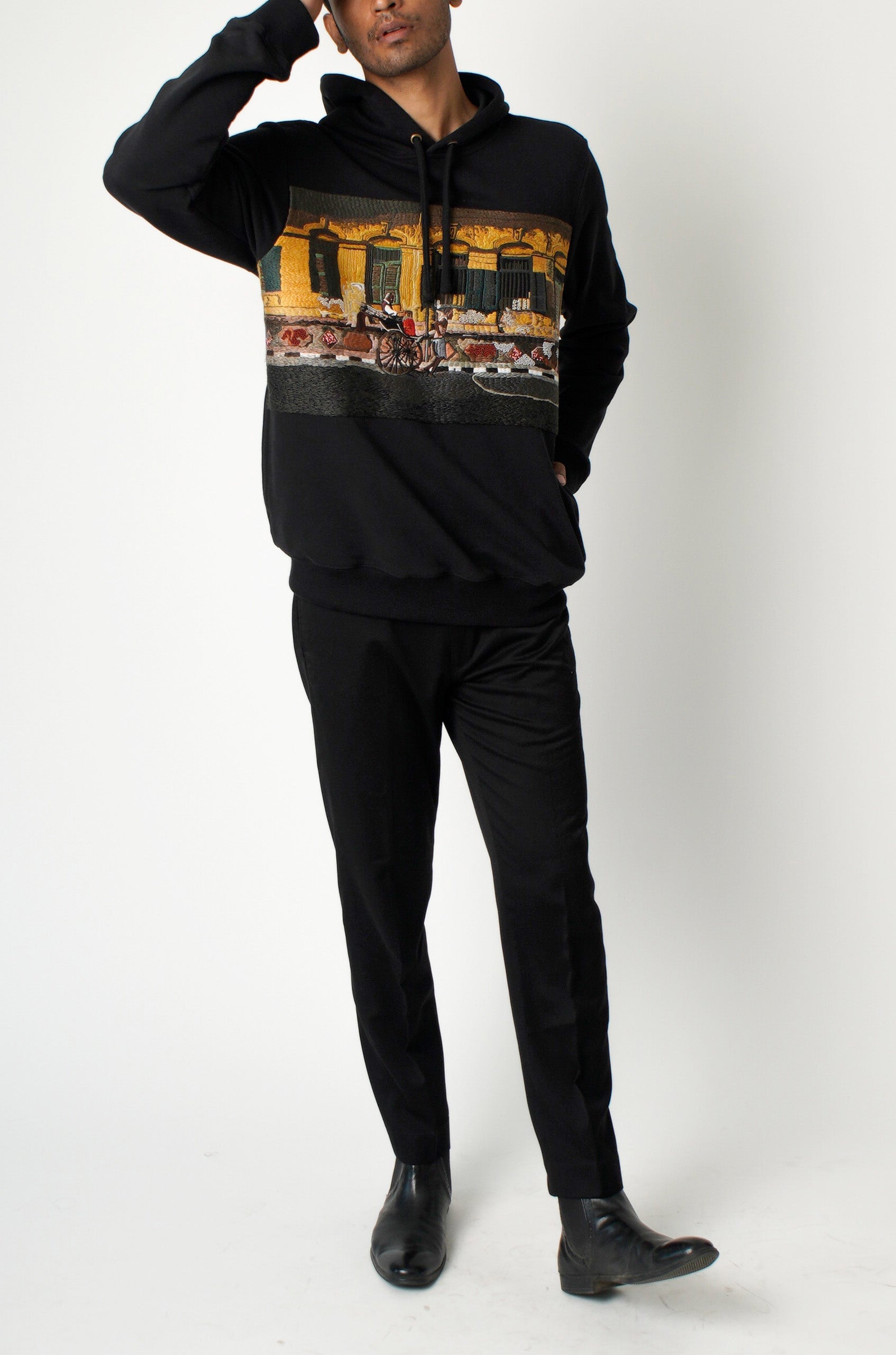 100% cotton-terry, unisex hoodie with handcrafted, embroidered front panel created with thousands of minute hand-embroidered stitches made in over 150 man-hours, inset in soft cotton fleece, to re-create a street photograph of a 'hand- cart' or 'Haathgaadi' in Bengal.