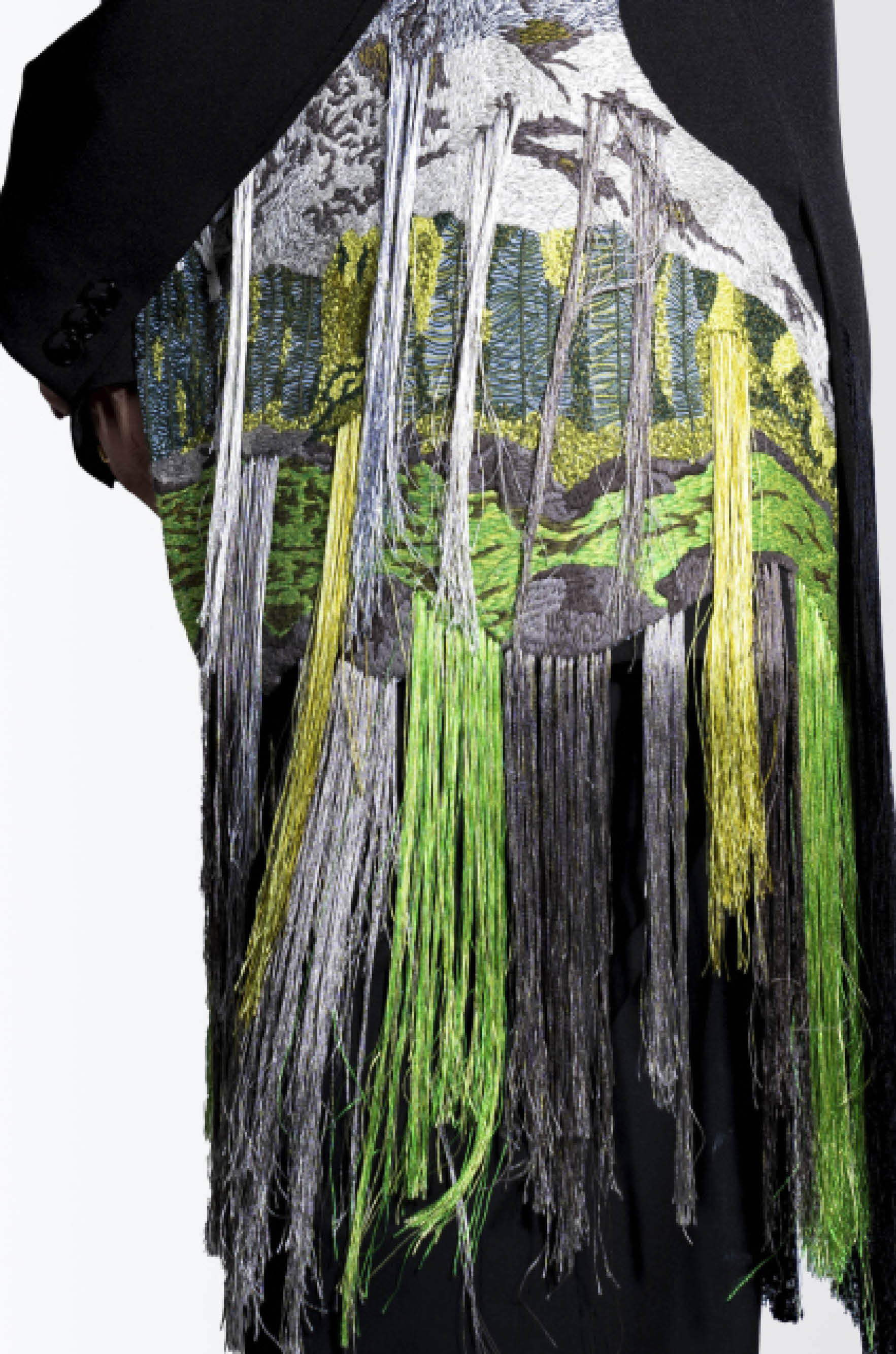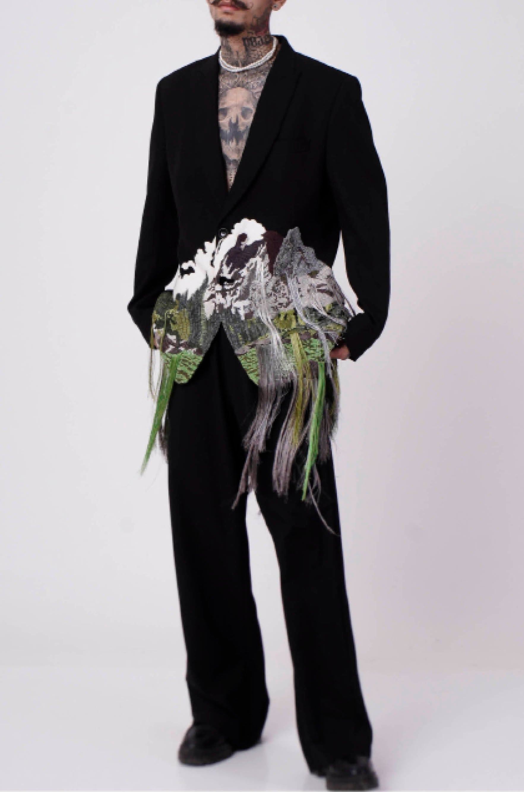 The Blazer features 'mountains' embroidery on front and back panel painstakingly done with thousands of hand-embroidered stitches with multi colored threads topped with dangling threads, made in over 180 man-hours.