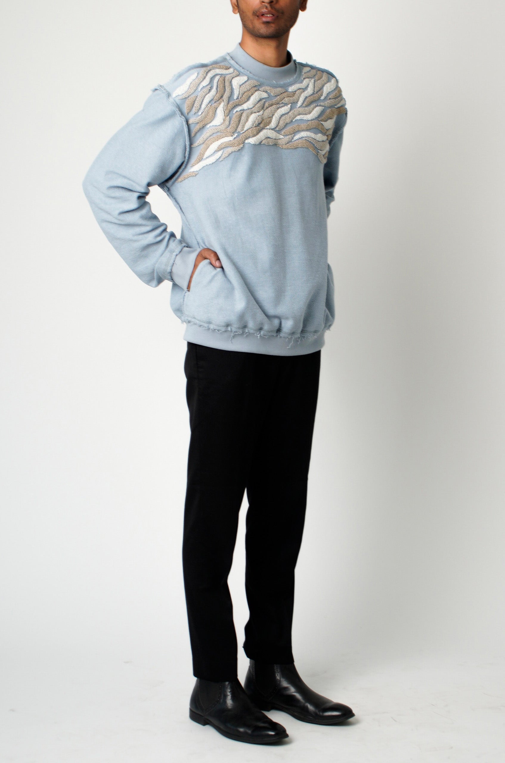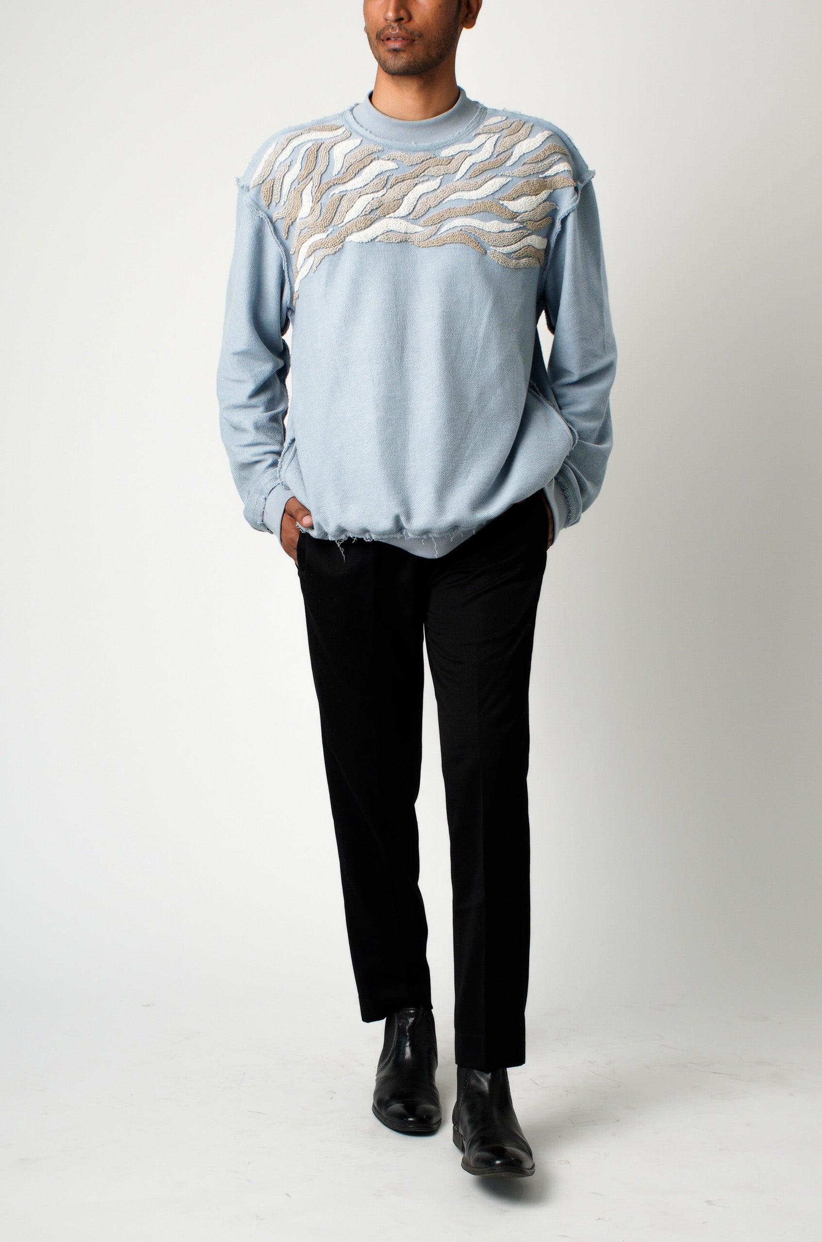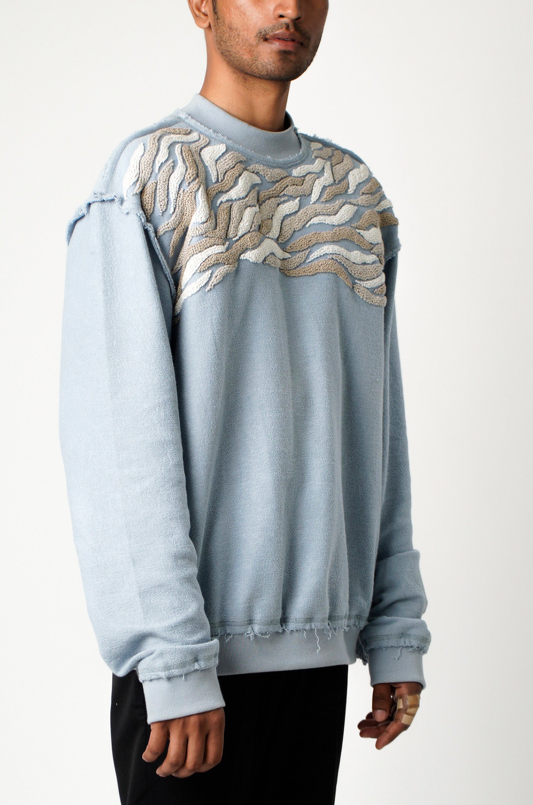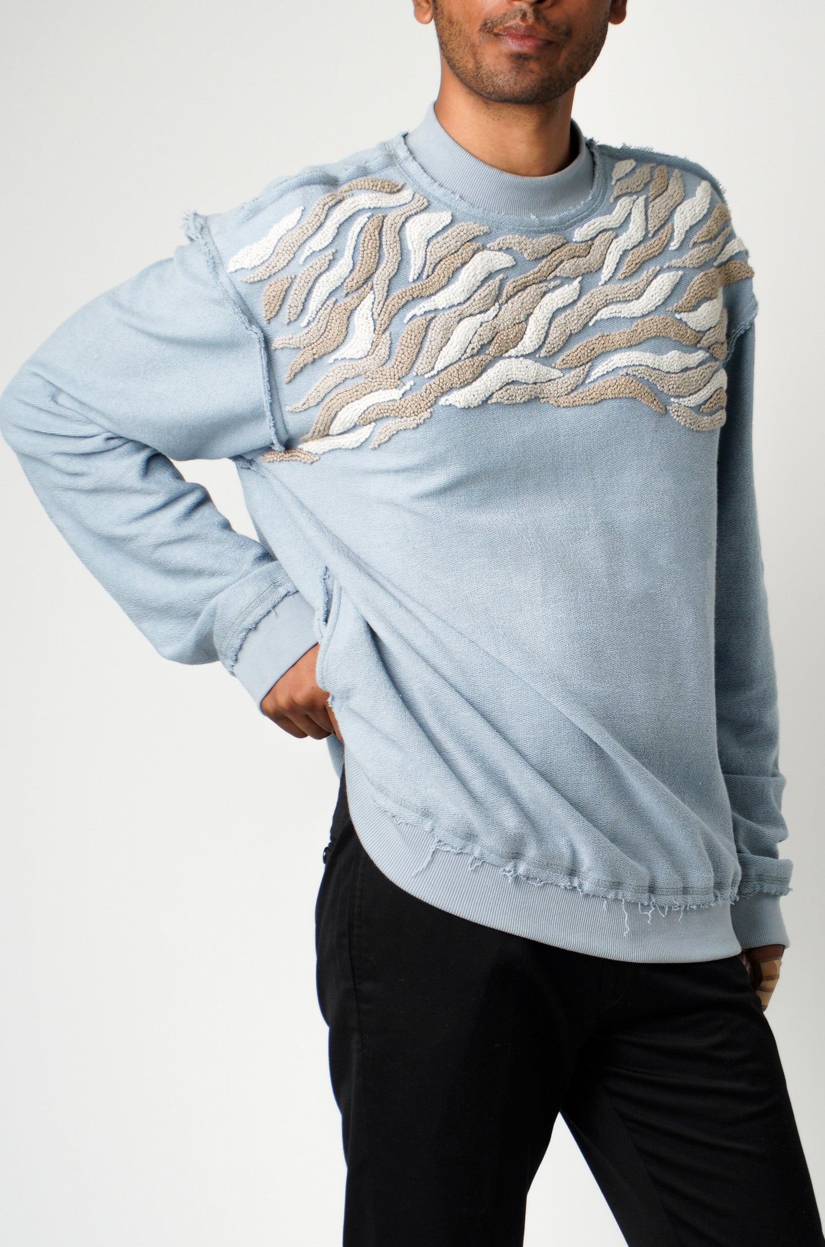 100% cotton-terry sweatshirt with handcrafted, embroidered mutant motifs created with individual french knots across the chest, placed on the brushed side of a french terry panel. Sweatshirt seam lines are finished with raw edge detailing.