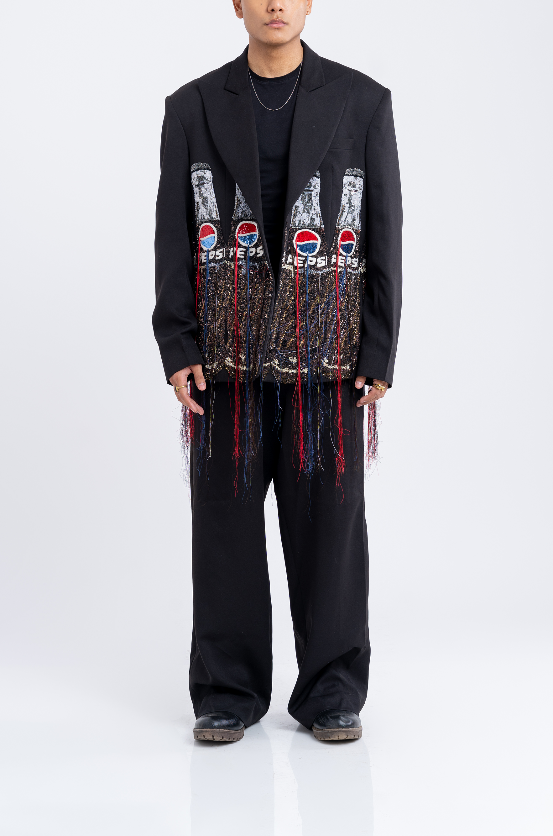Handcrafted Unisex single-breasted blazer in HUEMN classic oversized fit in ultra-luxe banana crepe fabric. The product features an embroidered front panel created with thousands of minute hand-embroidered stitches made in over 150 man-hours, to re-create a street photograph of a 'hand- cart' or 'Haathgaadi' in Bengal.