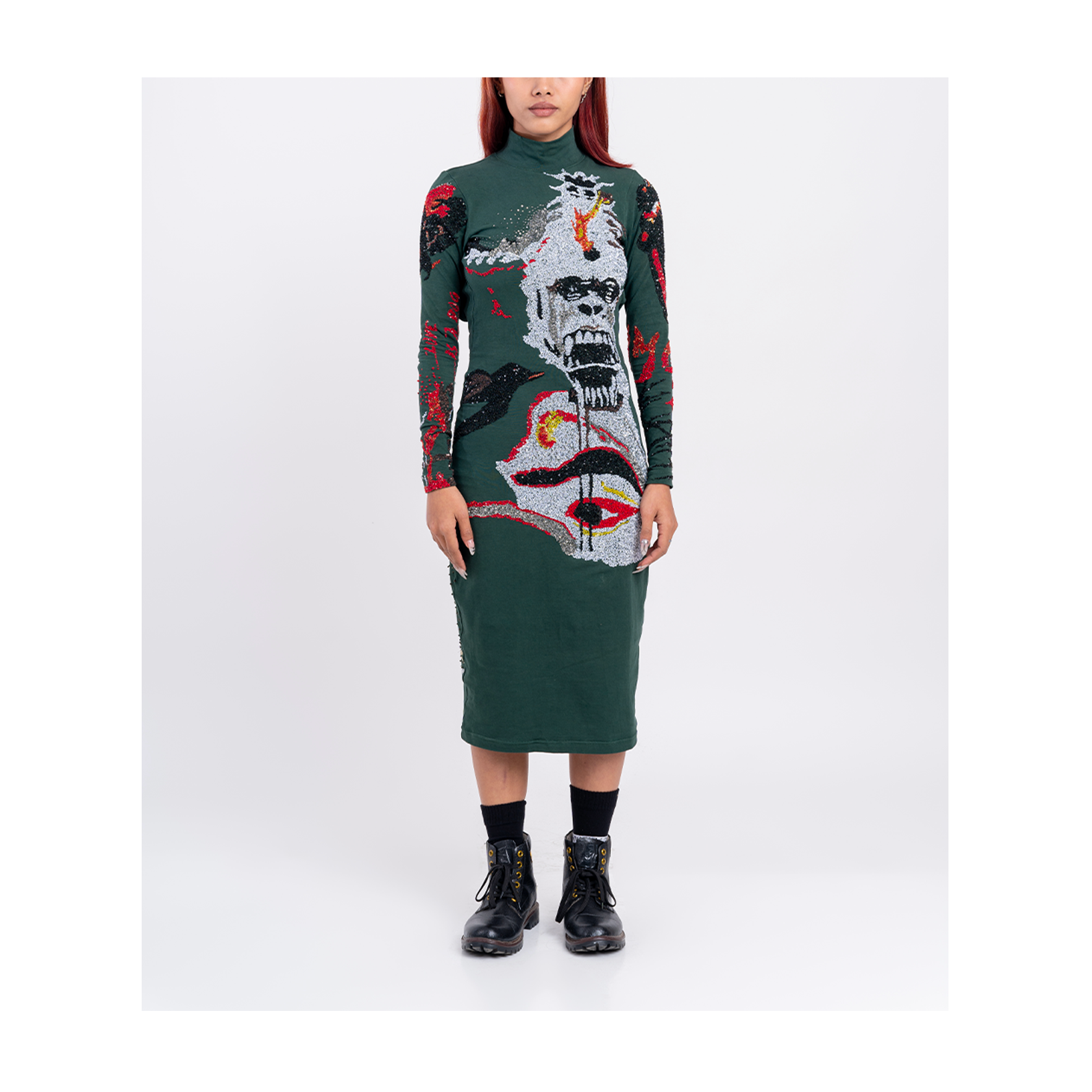 Handcrafted Signature HUEMN silhouette turtleneck full sleeve body-con dress with an open back in 100% hosiery that hugs and molds around your curves.