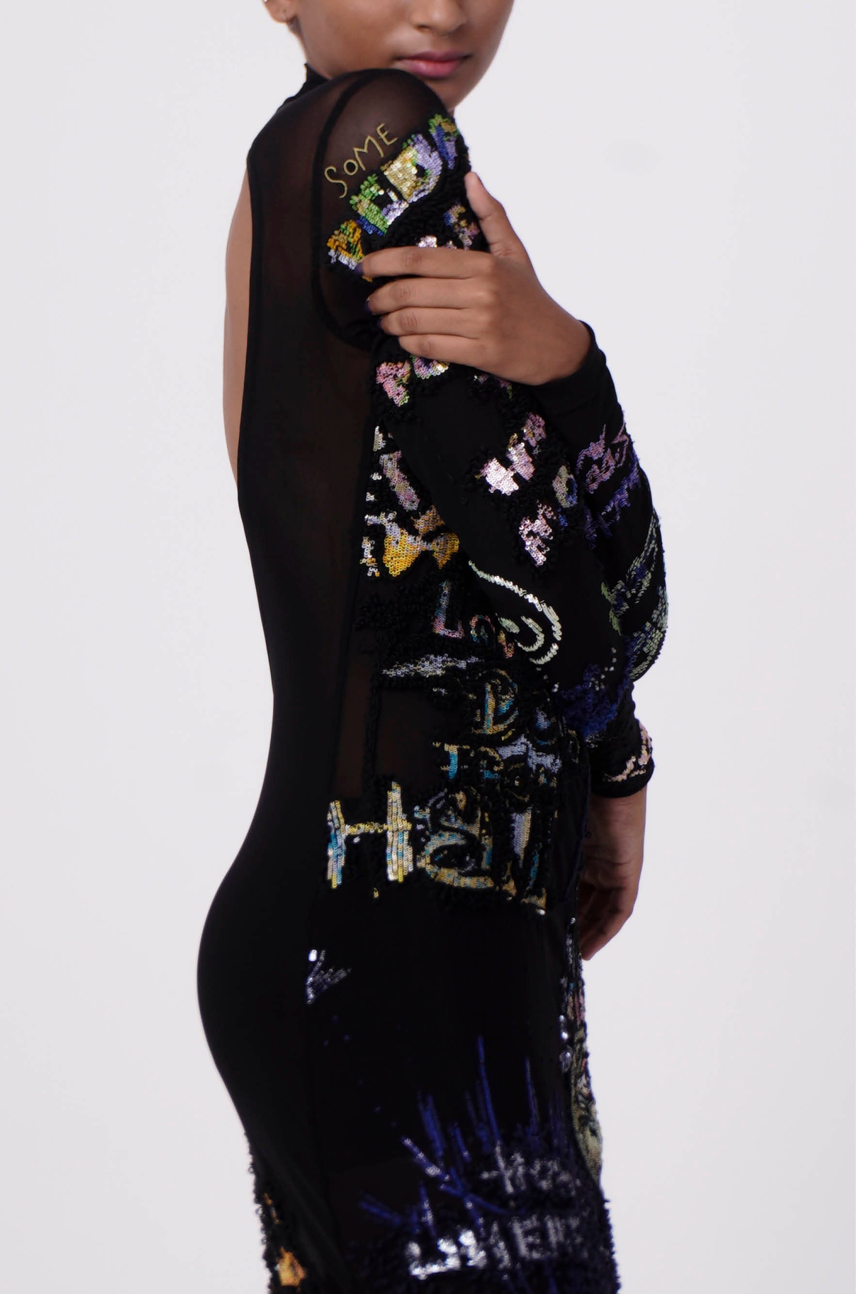 Handcrafted Signature HUEMN silhouette turtleneck full sleeve body-con dress with an open back in 100% Soft Net that hugs and molds around your curves in a stretchable way.