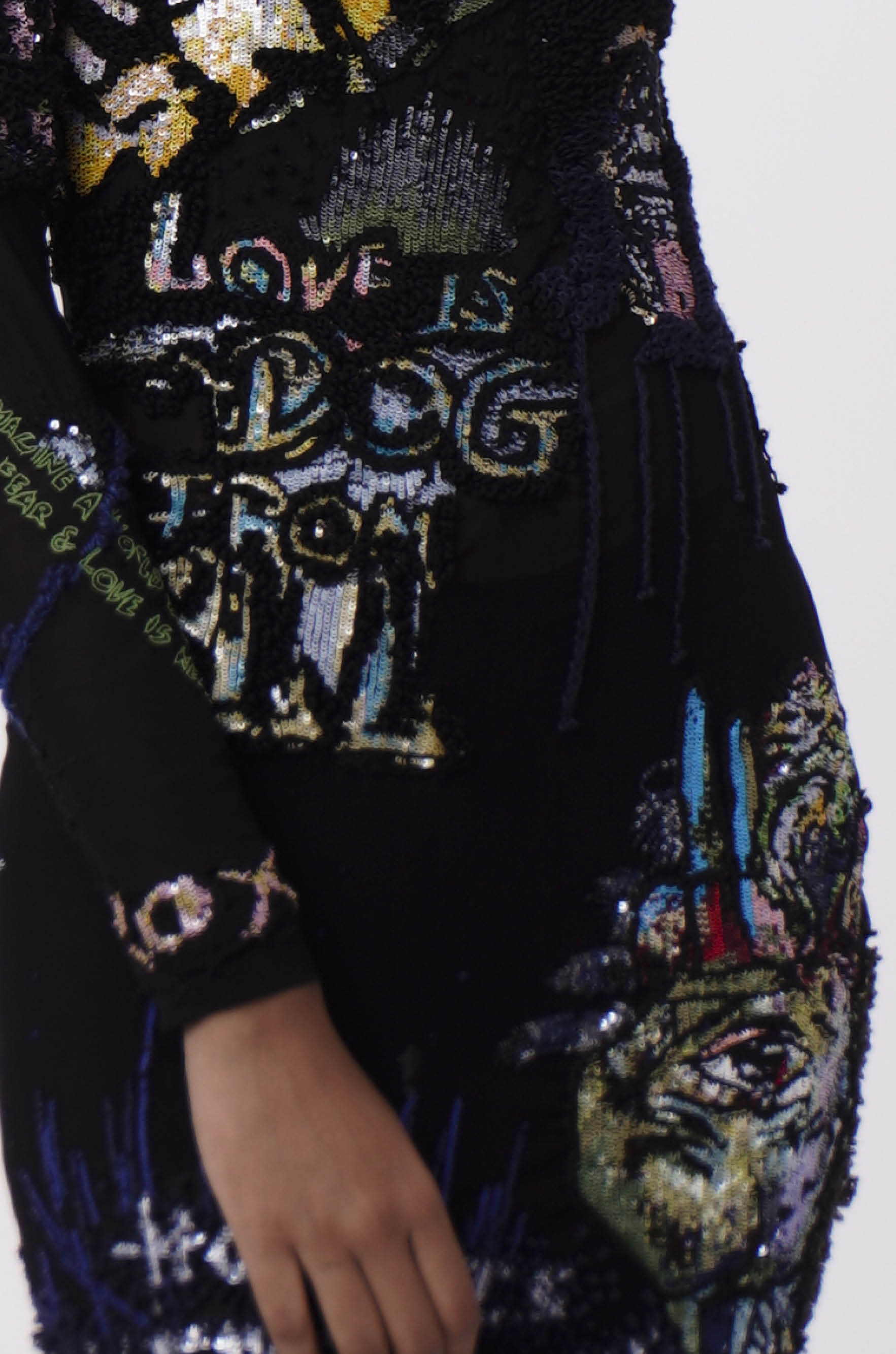 Dress front features colorful embroidered front and back panel created with thousands of minute hand-embroidered stitches with multi colored sequins made in over 150 man-hours.