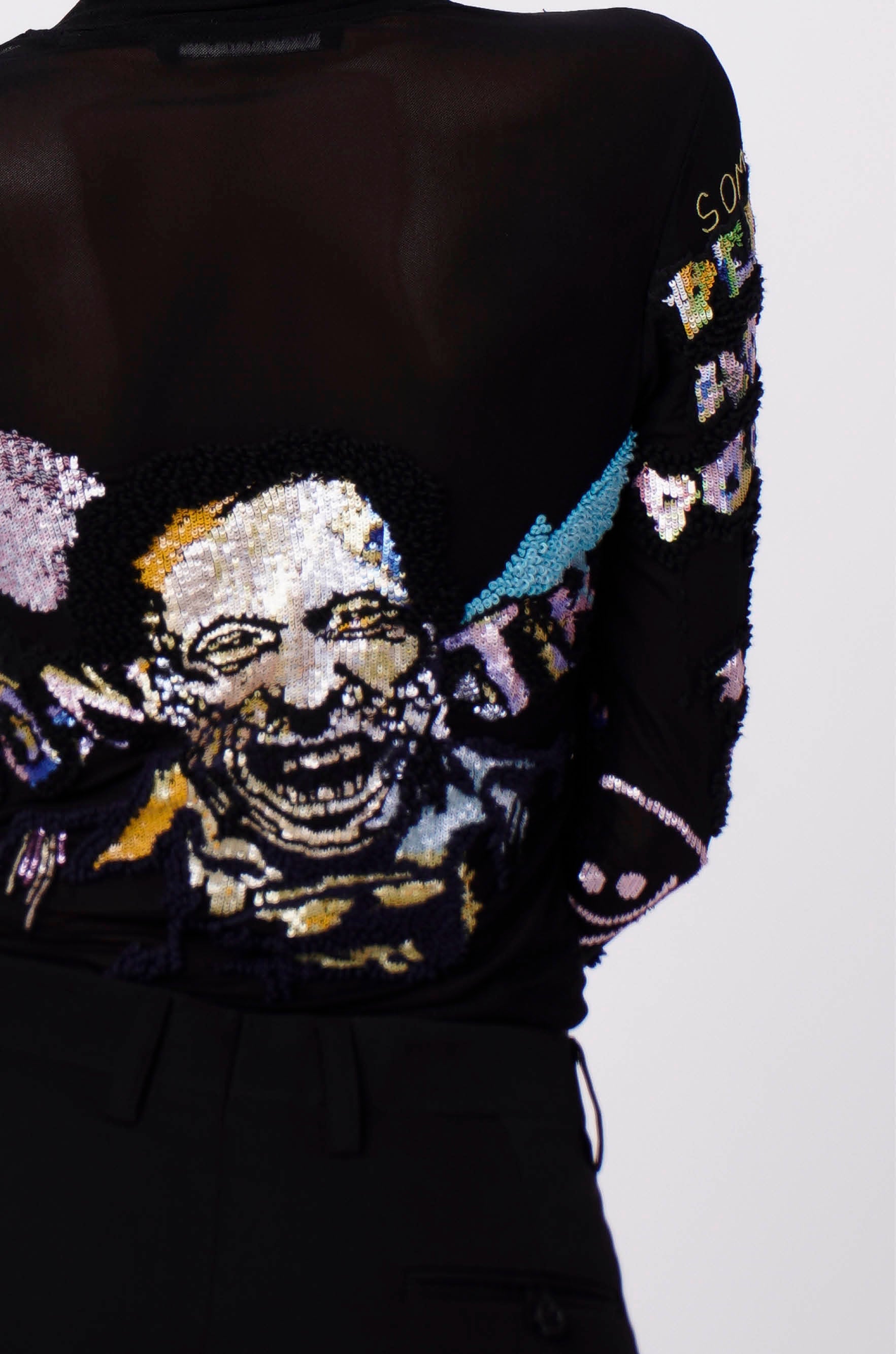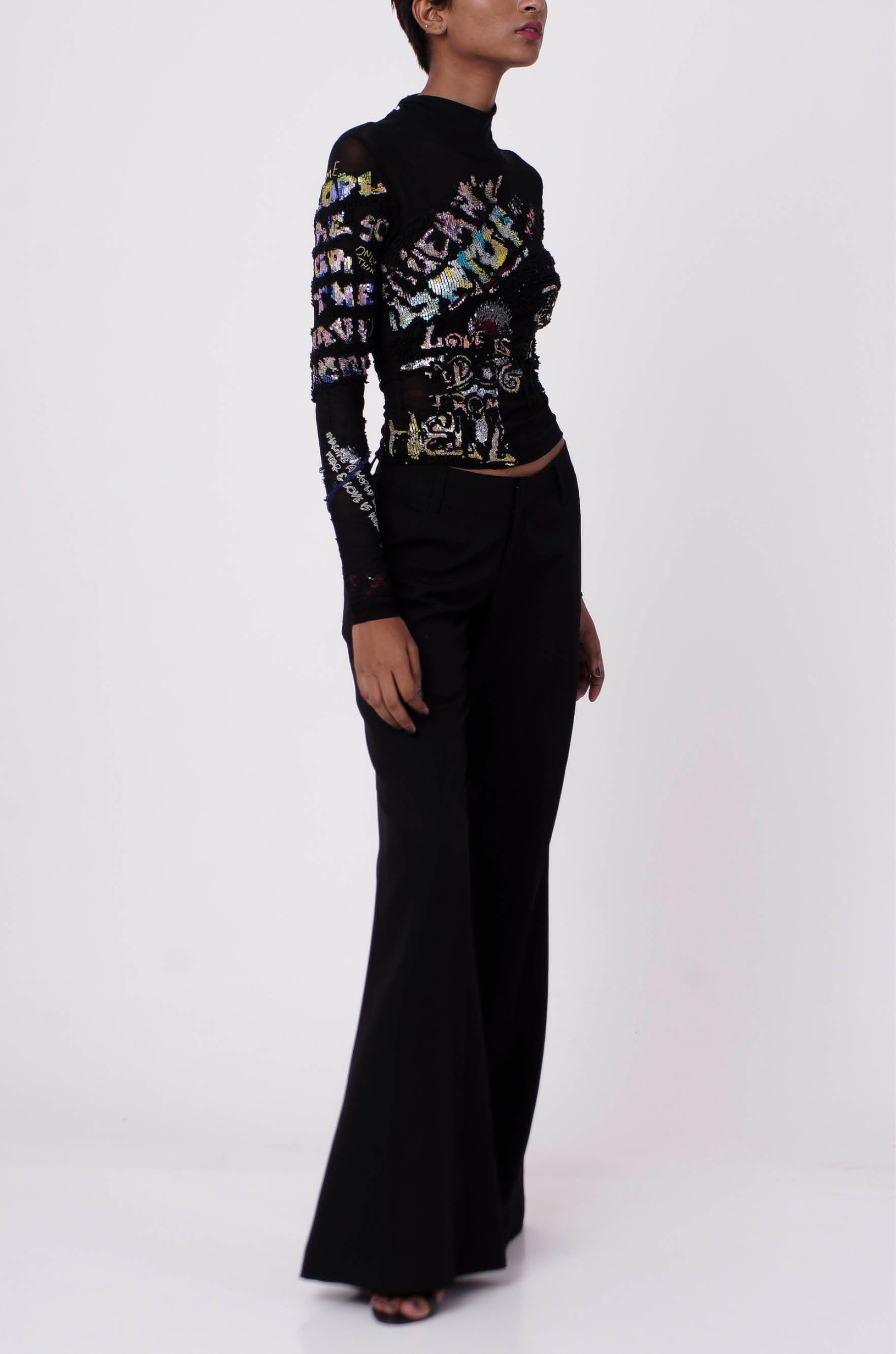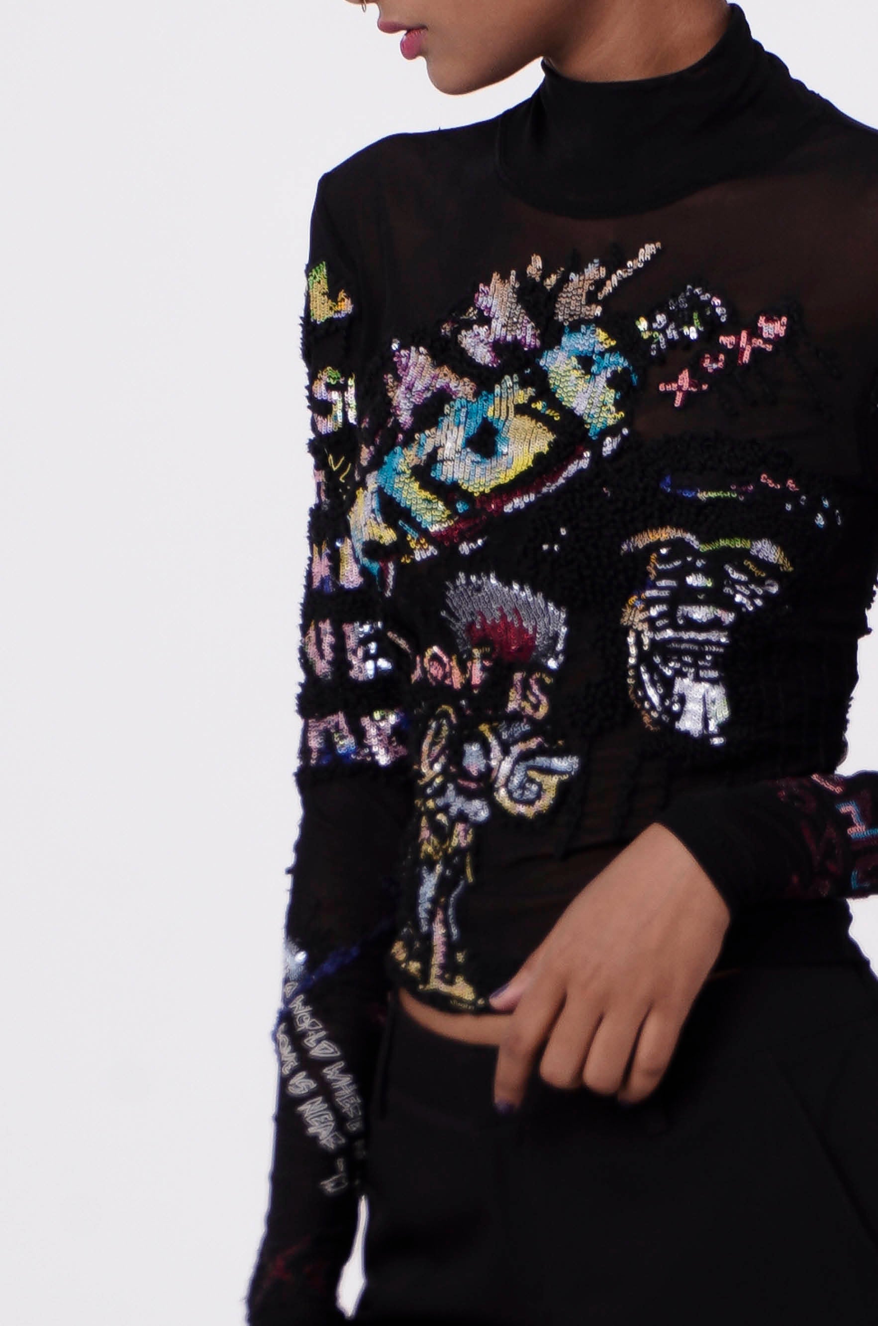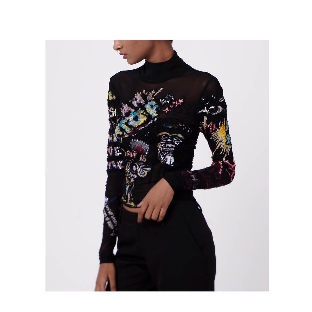 Handcrafted Sheer mesh turtleneck neck top with embroidered front and back panel created with thousands of minute hand-embroidered stitches with multi colored sequins made in over 200 man-hours.