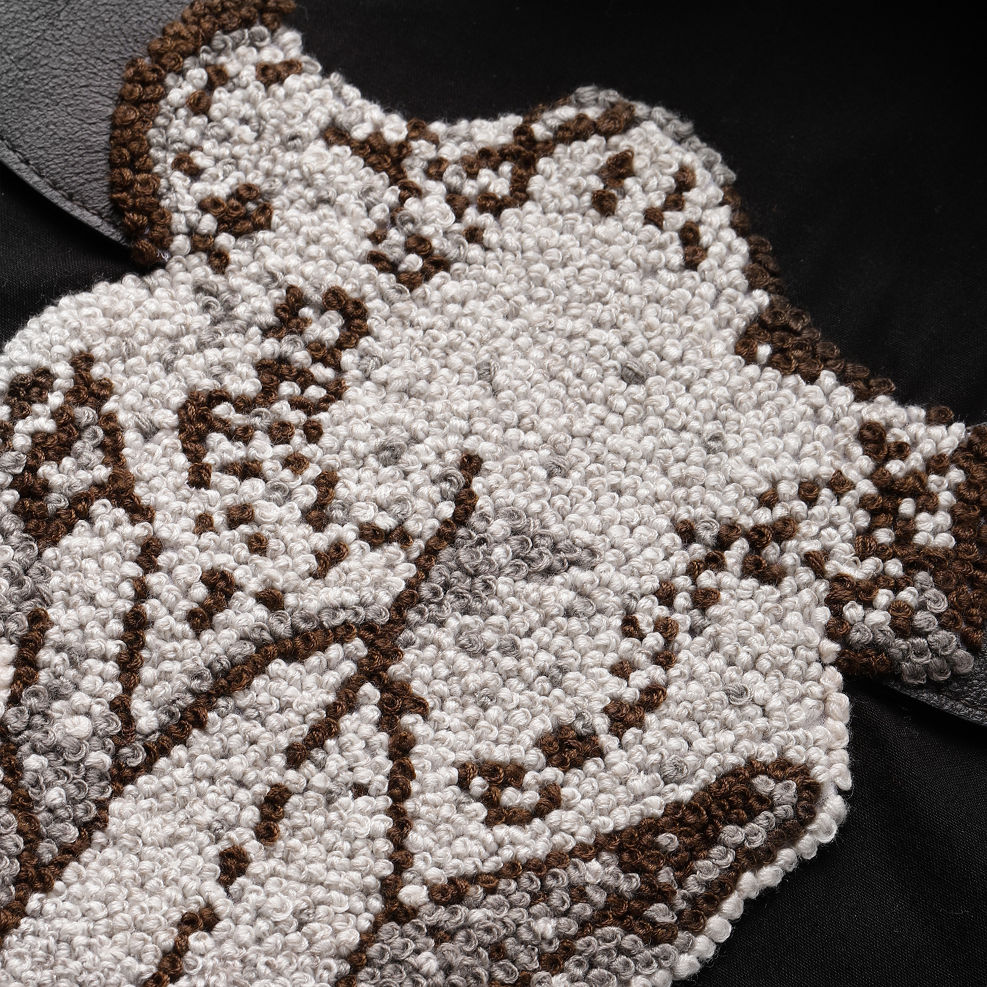 The technique is a signature Huemn handcraft inspired by an age-old practice where embroidery artists re-create the artwork on a frame, on the fabric, with hundreds of minute handmade stitches, made over many days of work. Soft leather shapes are cut and stitched to make this unique detail to frame the created face as a play-on horn structure.