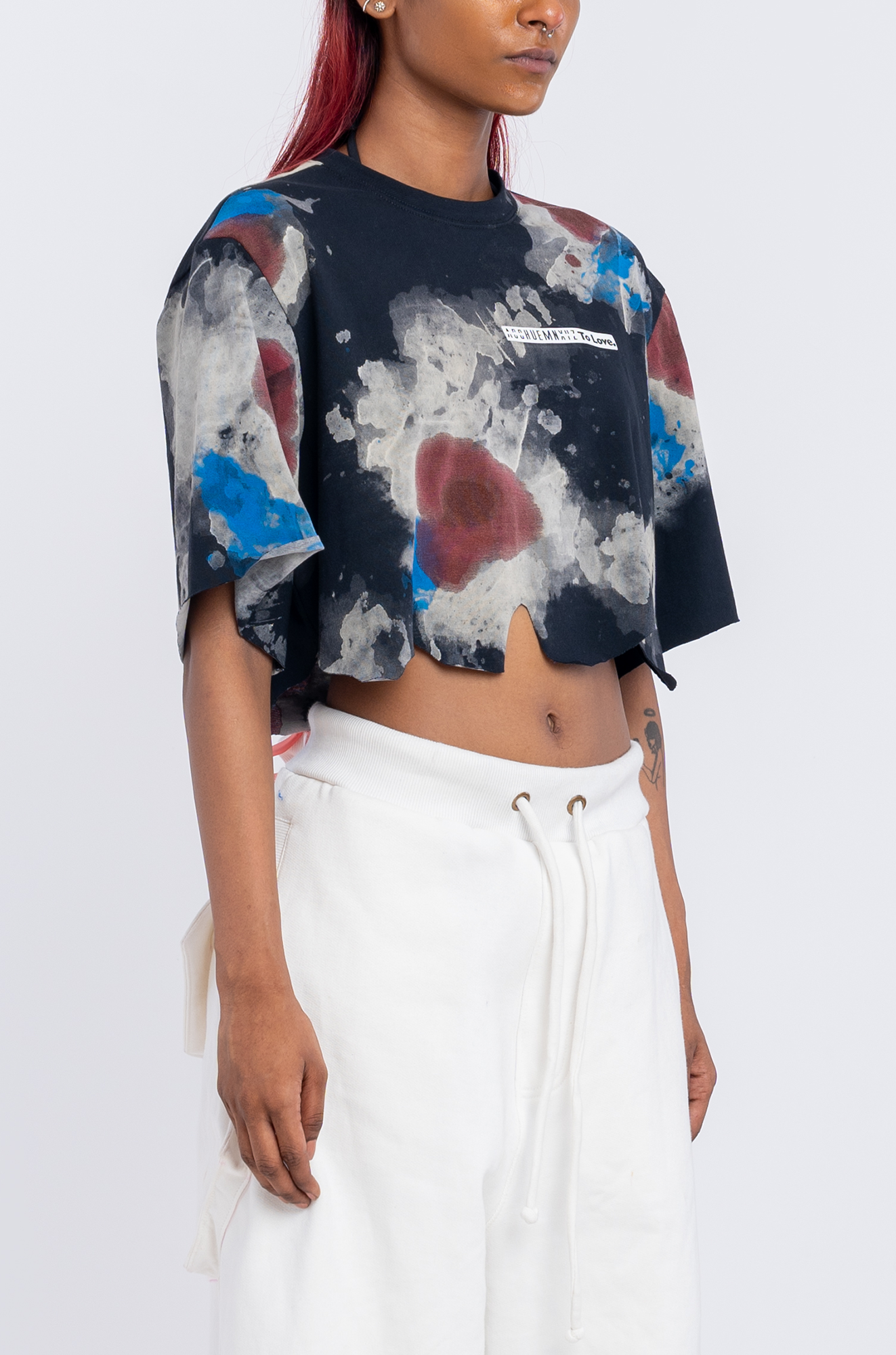 Cut to a cropped silhouette with uneven edges this HUEMN BLOOD Crop Top features a raised rubber screen printed HUEMN To Love logo.