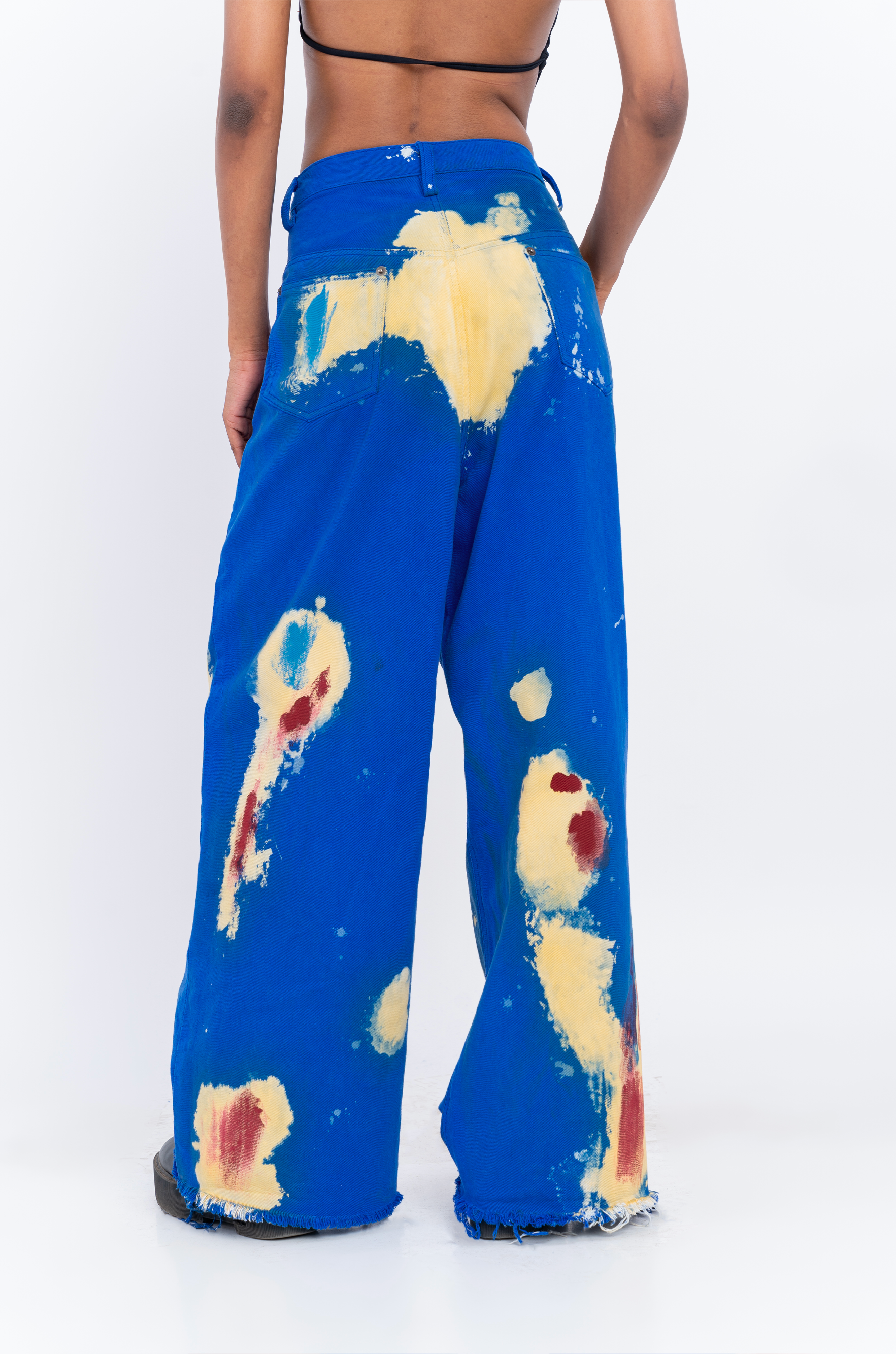 Blood-washed denim in HUEMN wide-legged silhouette with dropped crotch for unrestricted movement.