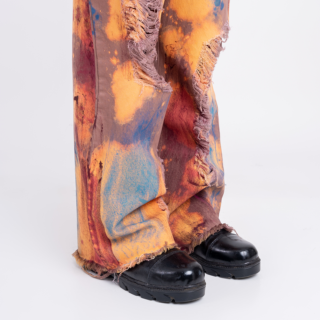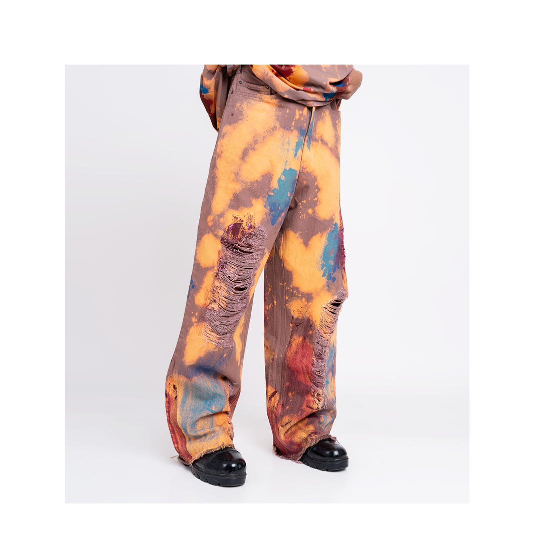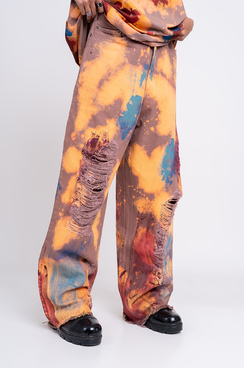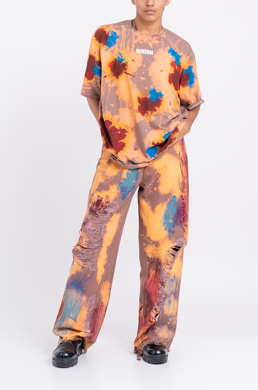 Blood-washed distressed denims in HUEMN wide-legged silhouette with dropped crotch for unrestricted movement.