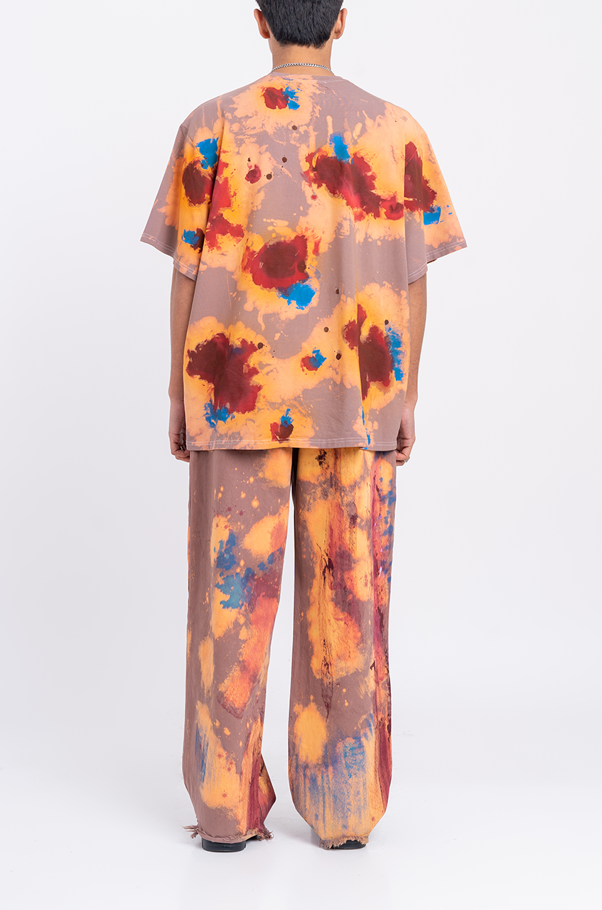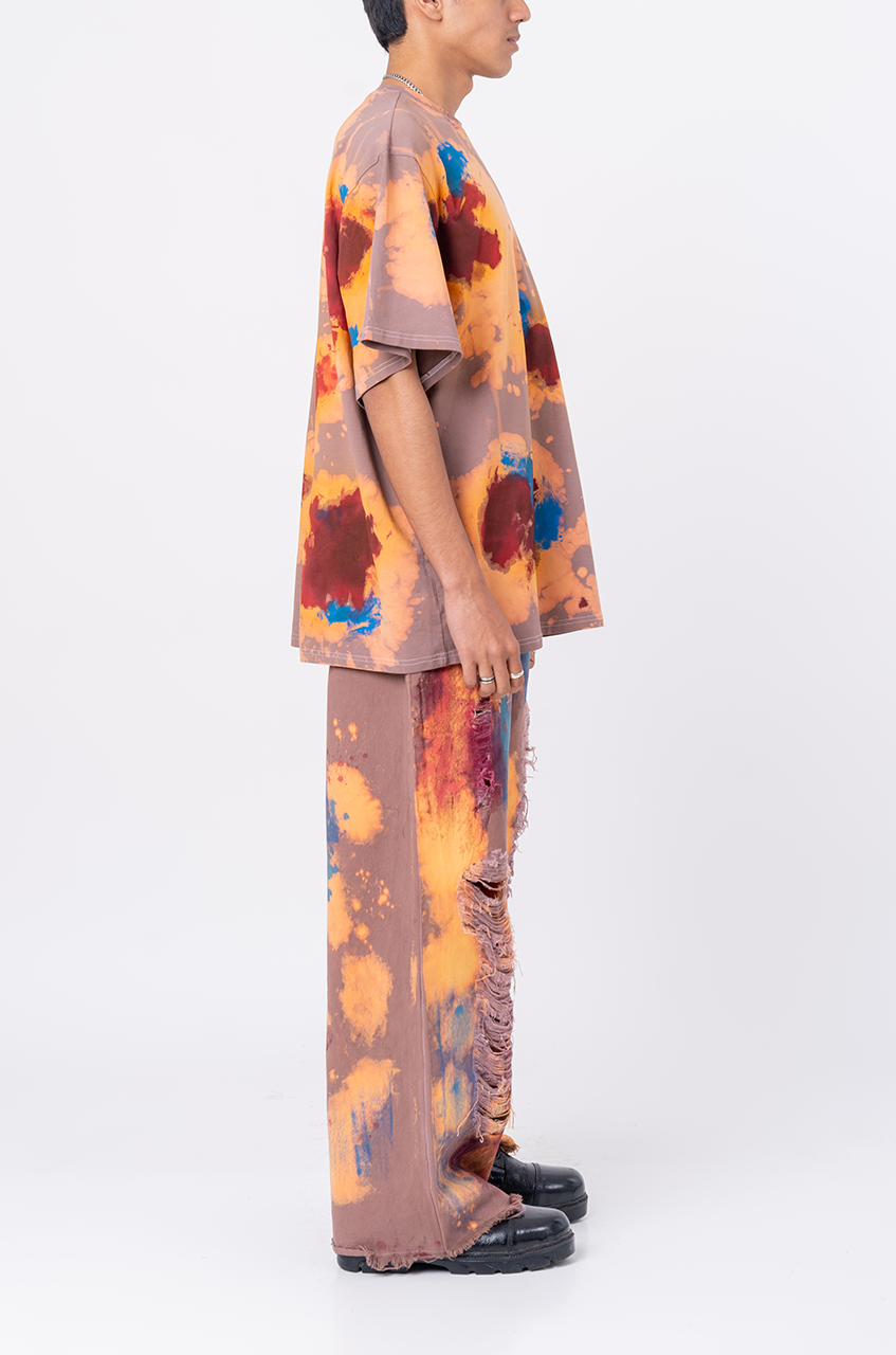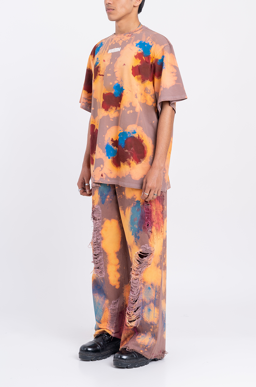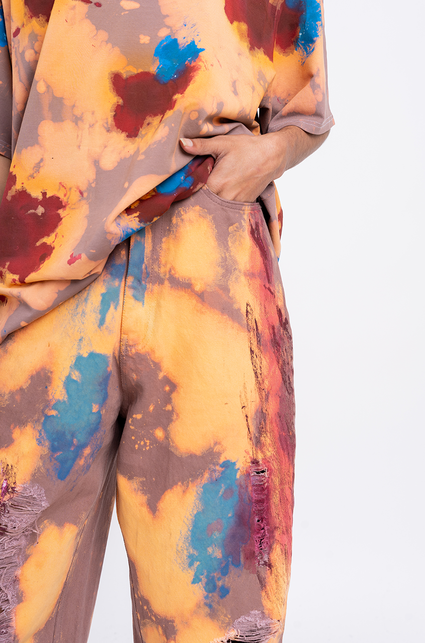 Blood-washed distressed denims in HUEMN wide-legged silhouette with dropped crotch for unrestricted movement.