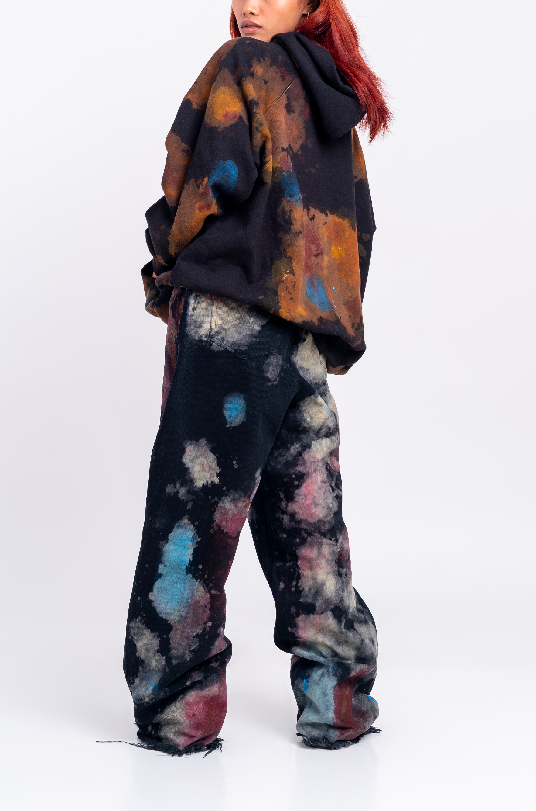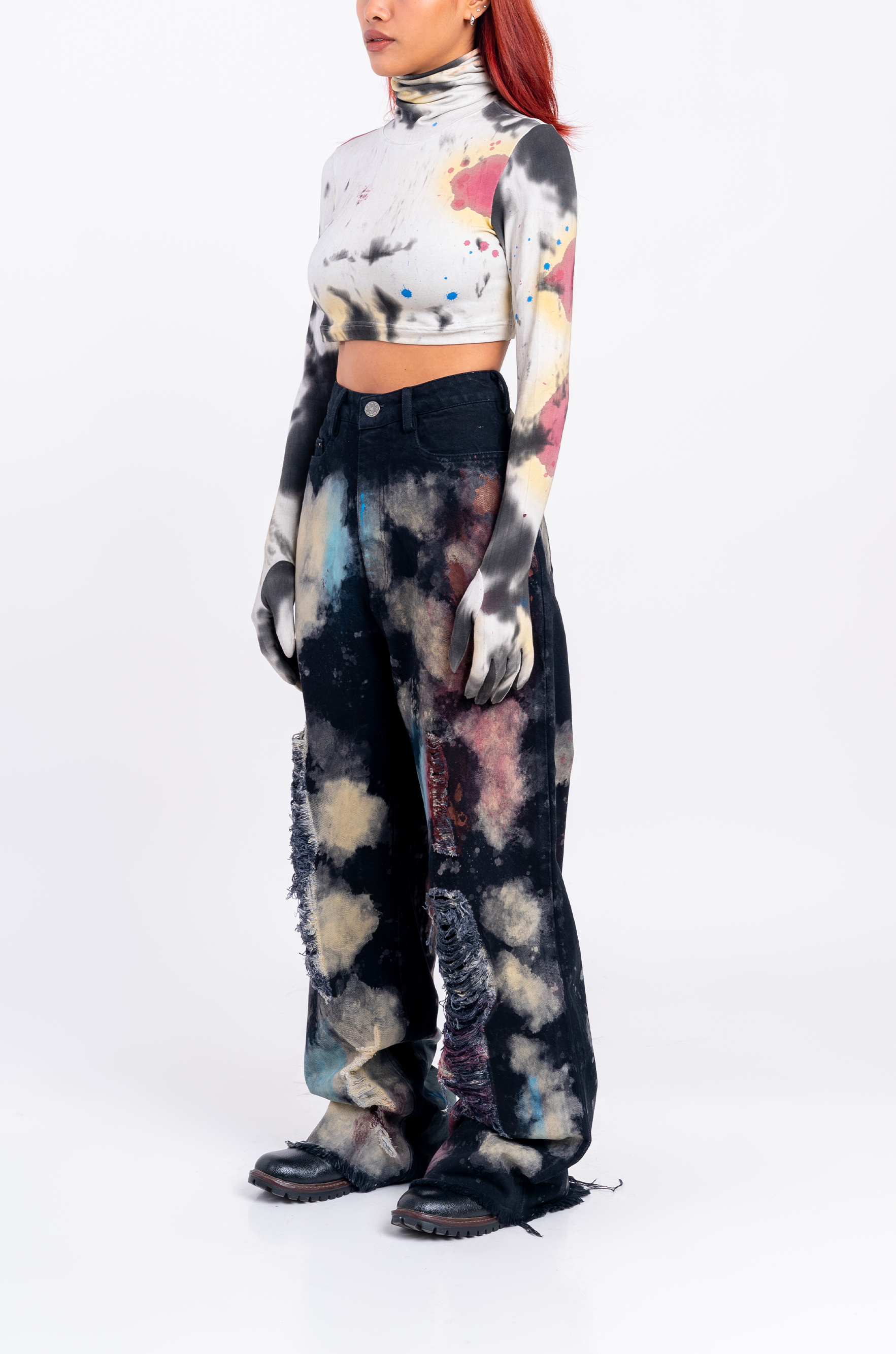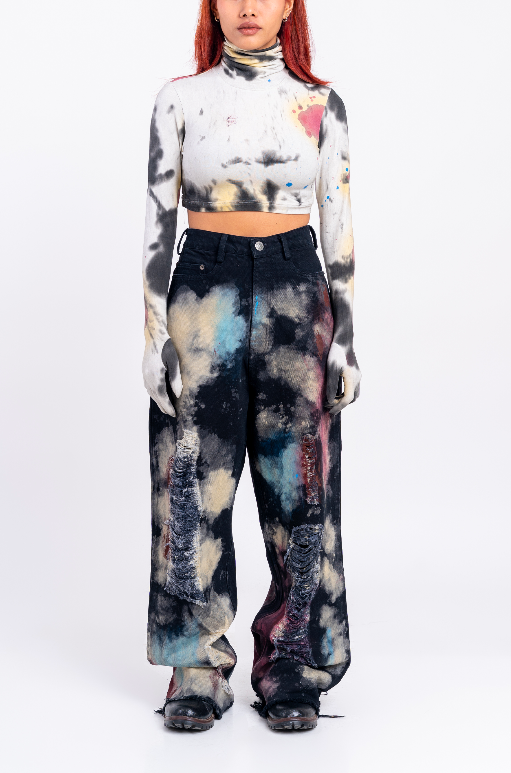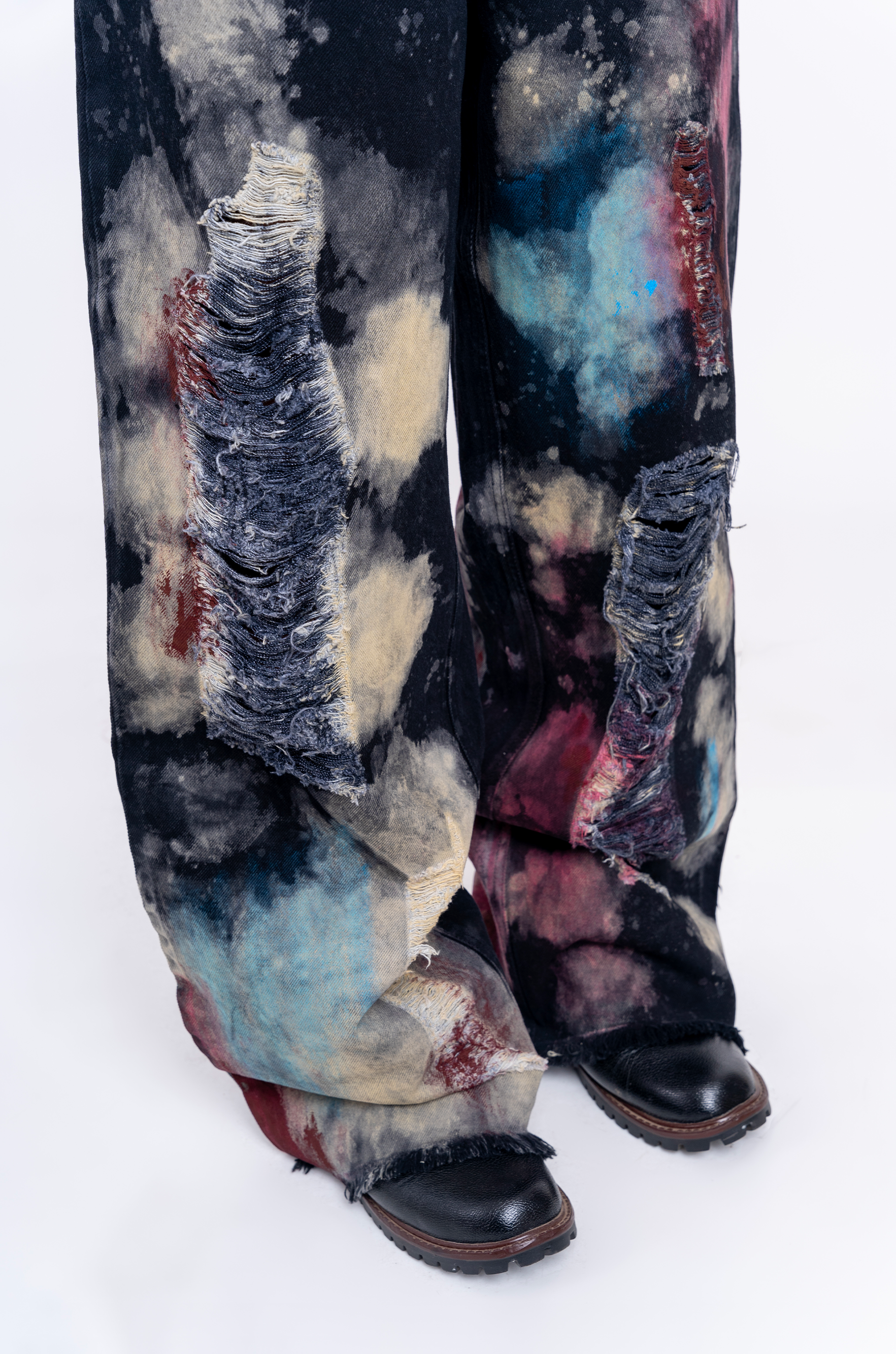 Blood-washed distressed denims in HUEMN wide-legged silhouette with dropped crotch for unrestricted movement.
