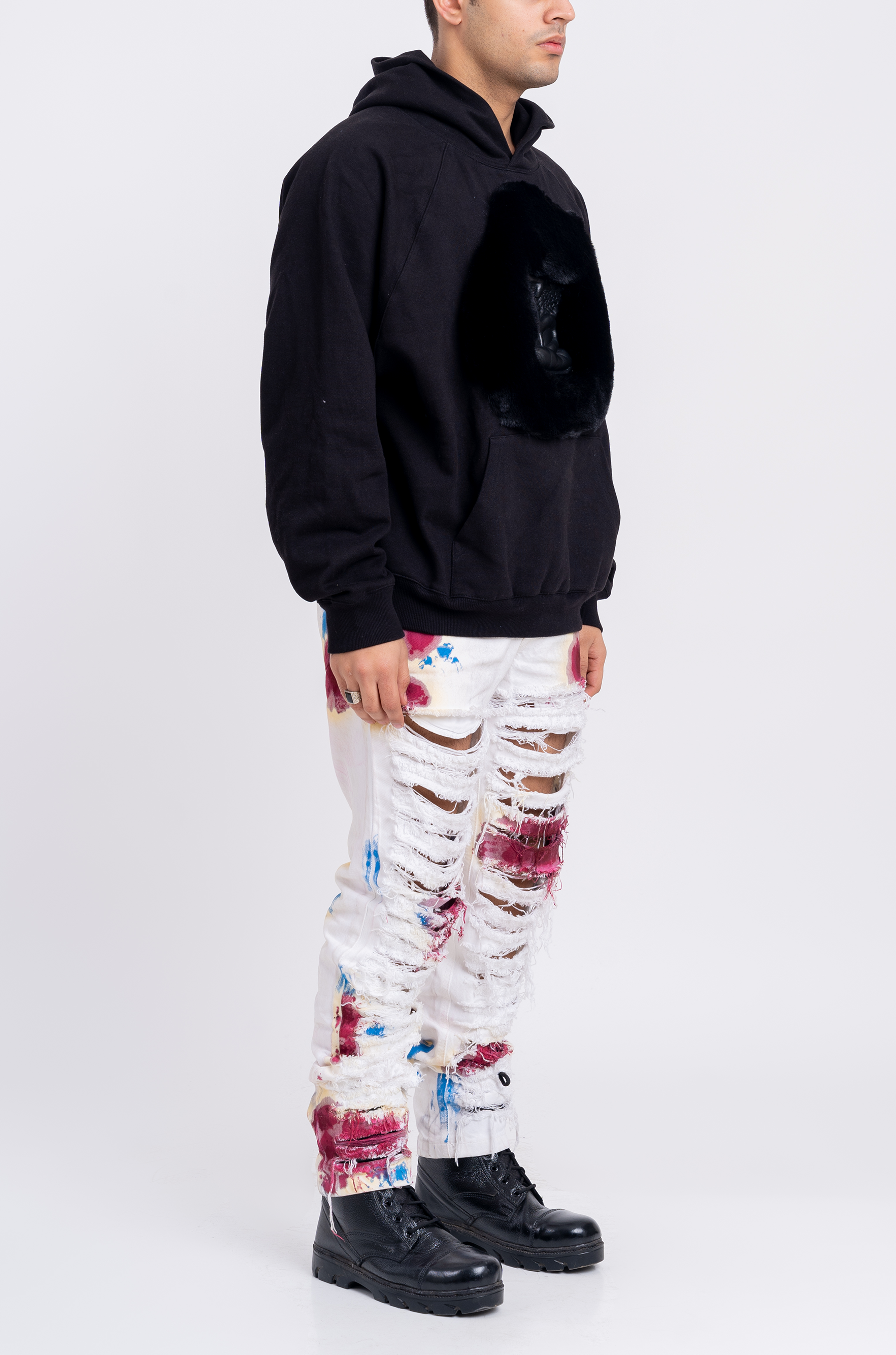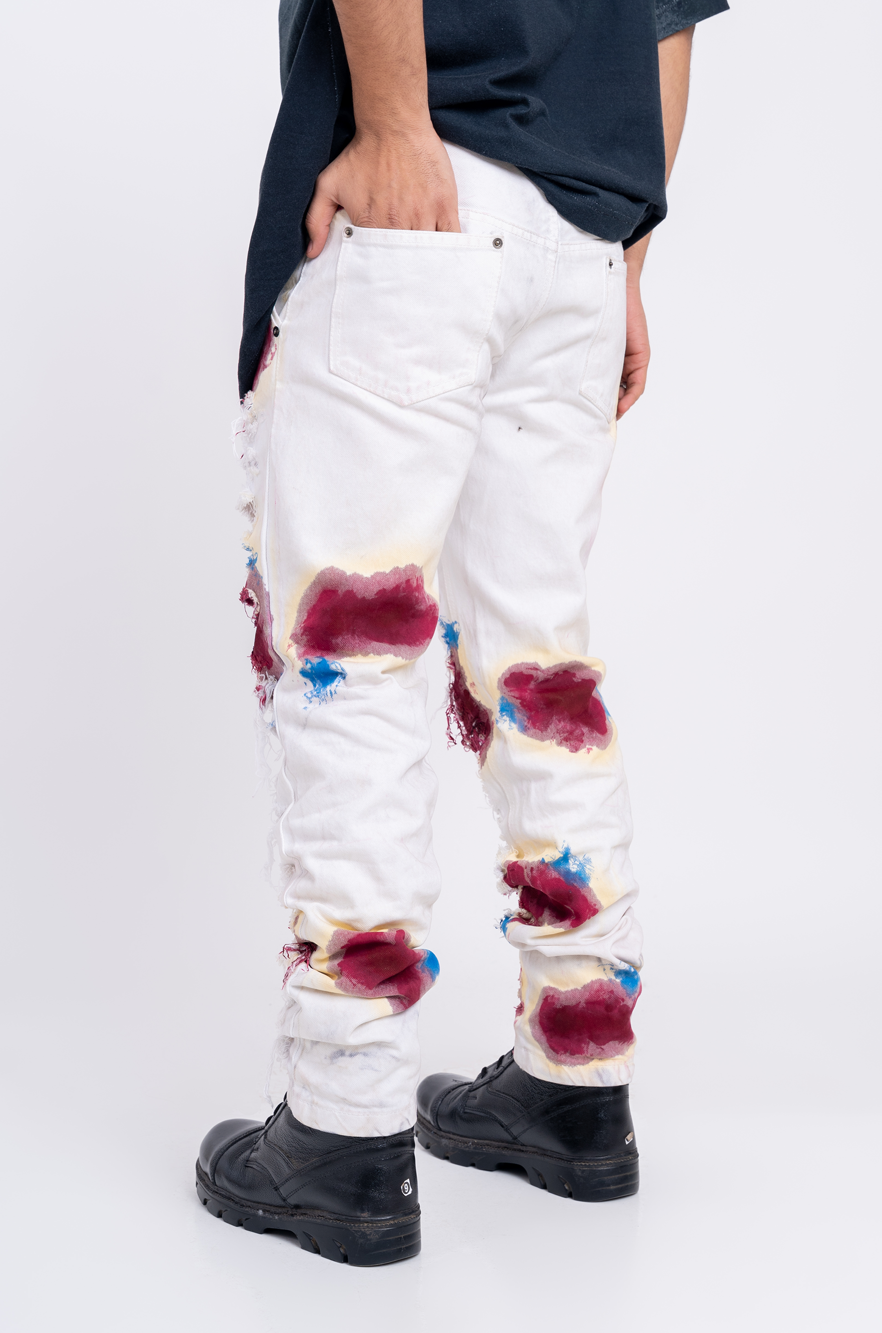 Blood-washed denim in HUEMN skinny fit silhouette with dropped crotch for unrestricted movement.