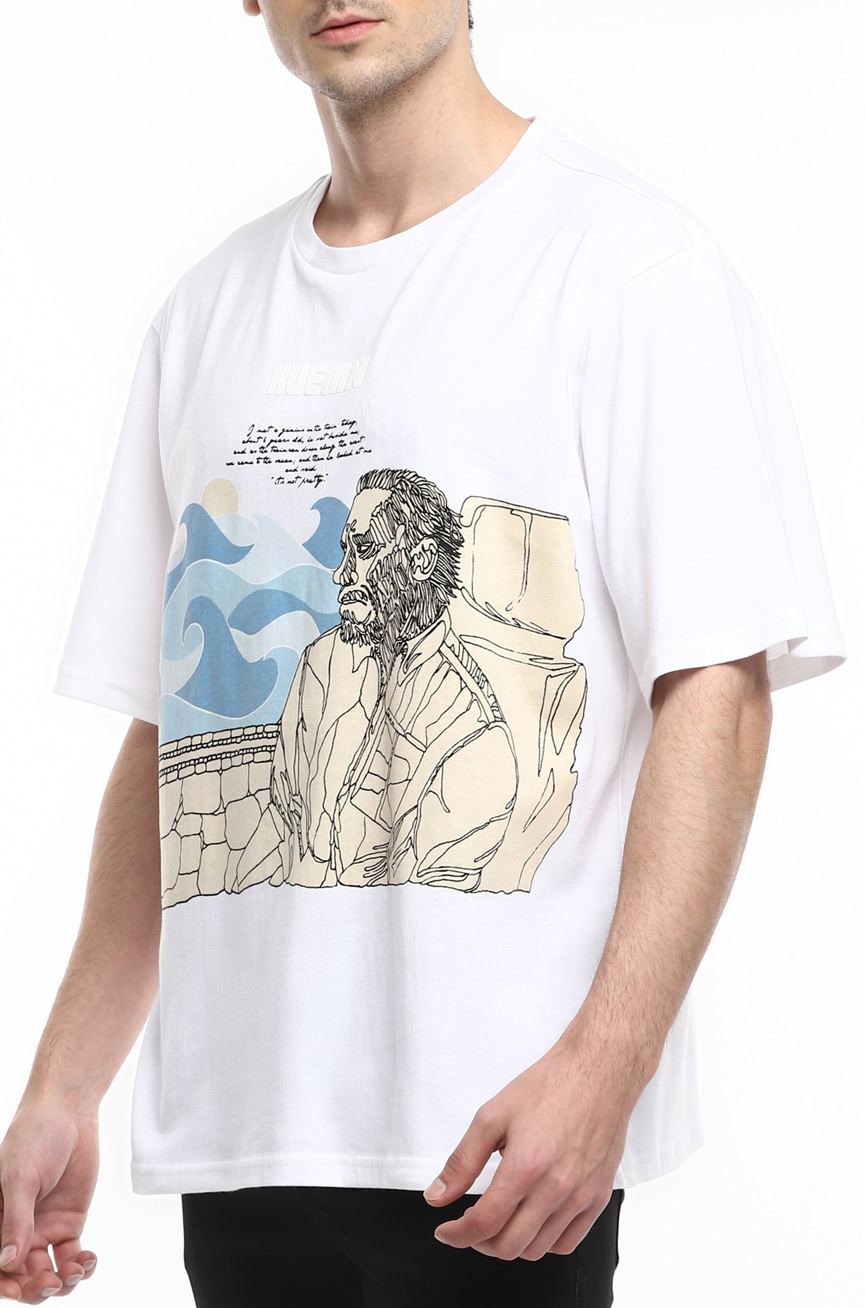 One-size, 100% cotton, white T-shirt with a water-based screen print of a HUEMN ink-illustration on cartridge paper; and a puffed screen-print of 'BUKOWSKI' on front.