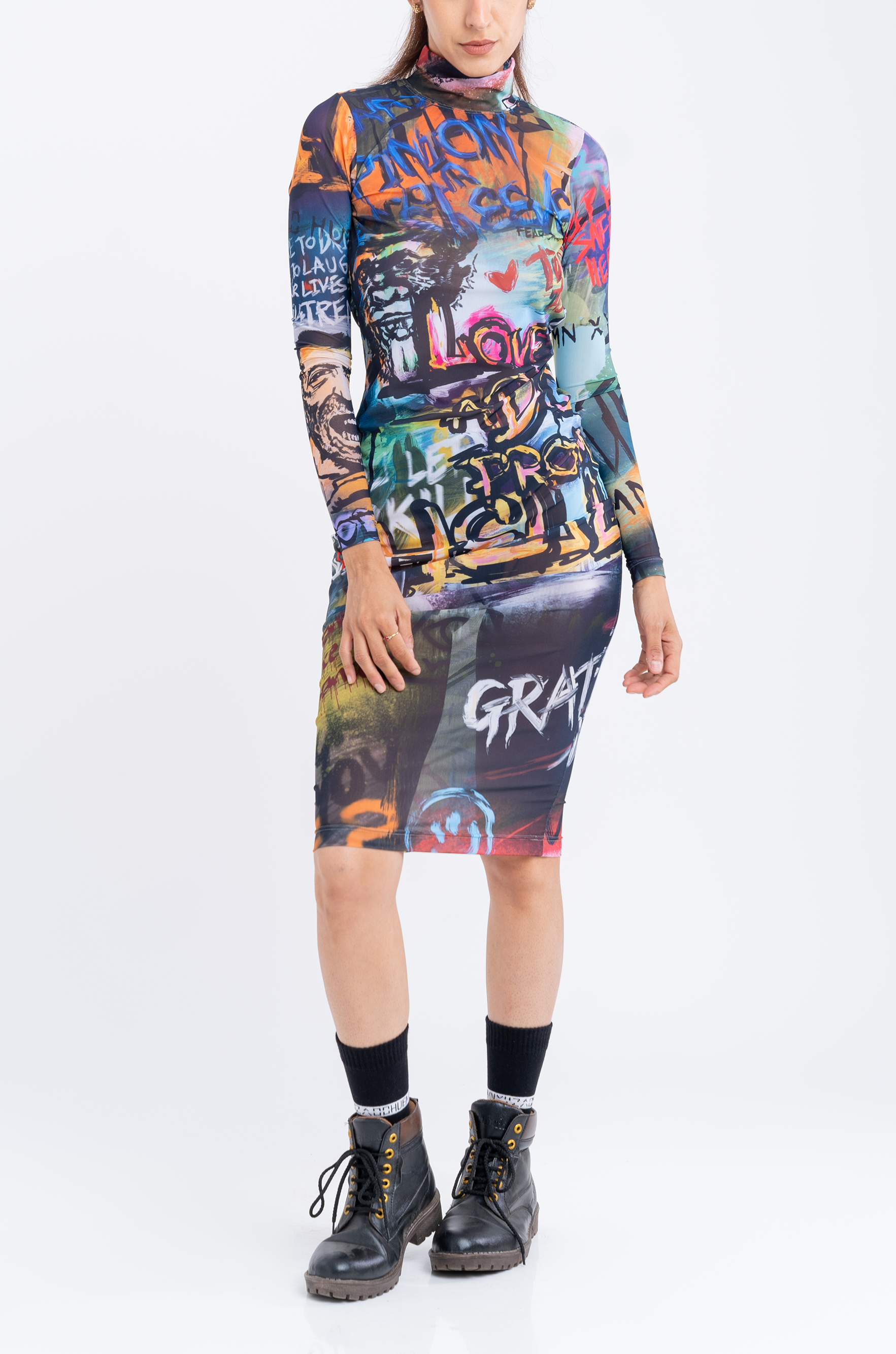 Limited Edition, Unisex 100% Mesh Fabric Long Sleeve Backless Bodycon Net Dress with conceptualized graphically placed print.
