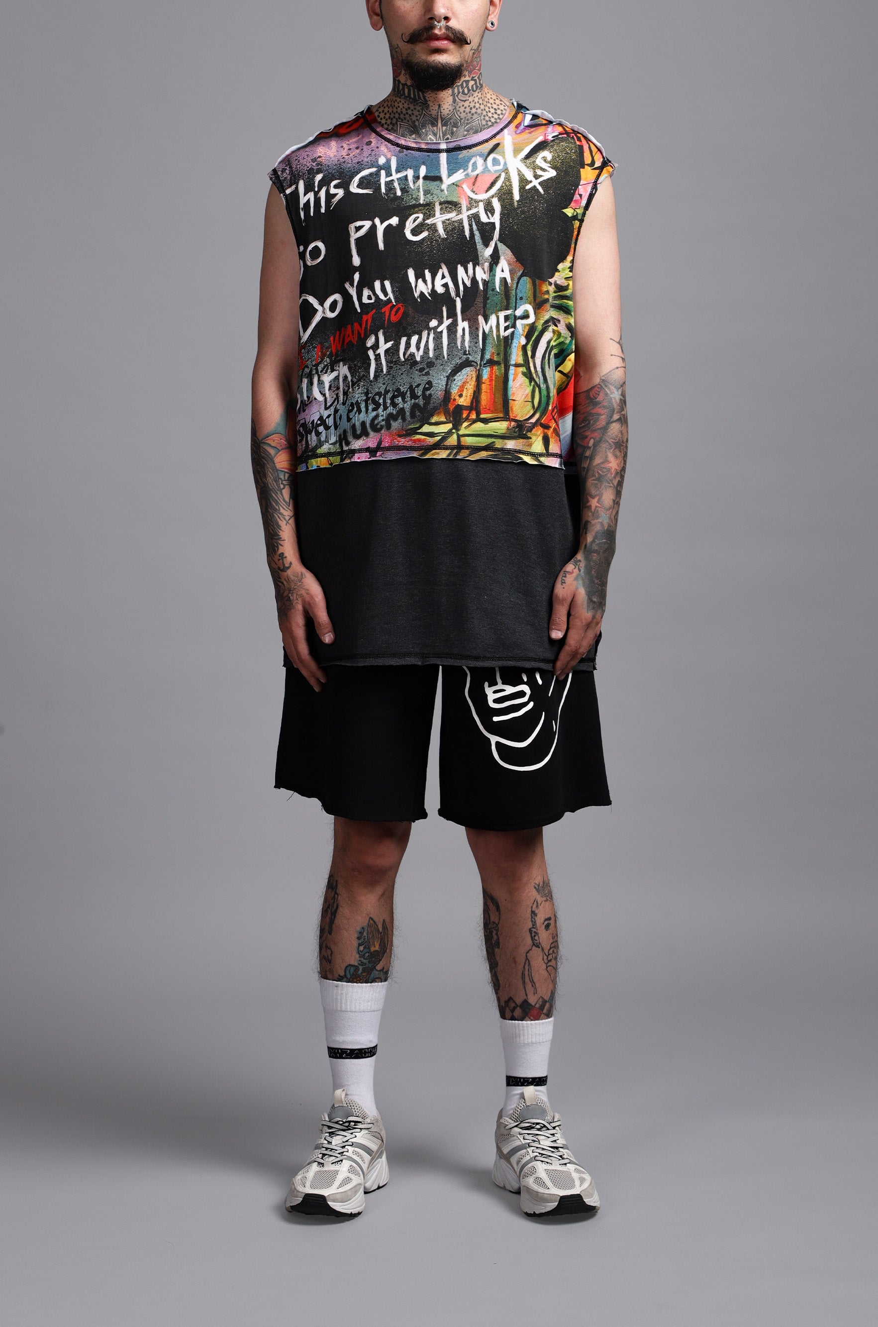 100% Cotton, Sleeveless round-neck T-shirt featuring a dark grey panel, contrasting with the signature HUEMN graffiti print and raw-edged details along the seams.