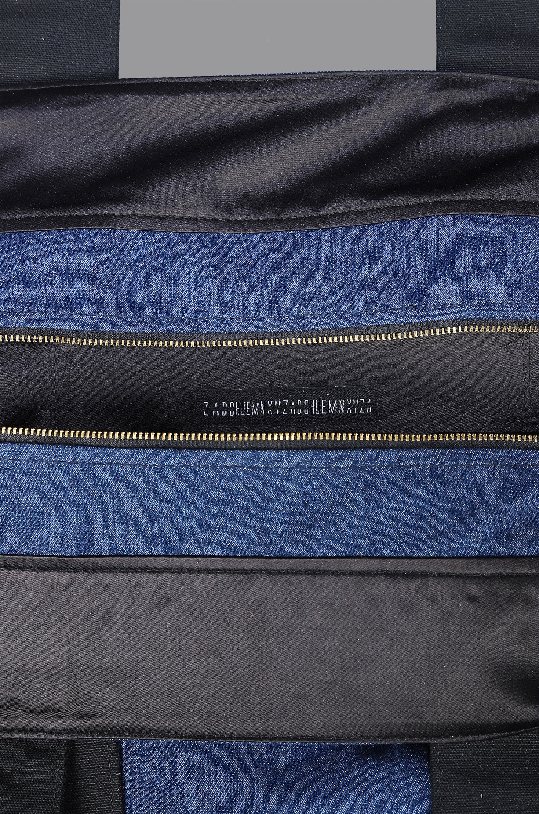 HUEMN Travel Essentials Zippered Tote Bag, handcrafted from 100% cotton denim. The product has an asymmetric handle detail, a slip pocket on the inside, two front pockets, and a zipped pocket on the back for additional storage, and is finished with a 3D printed logo on the front.