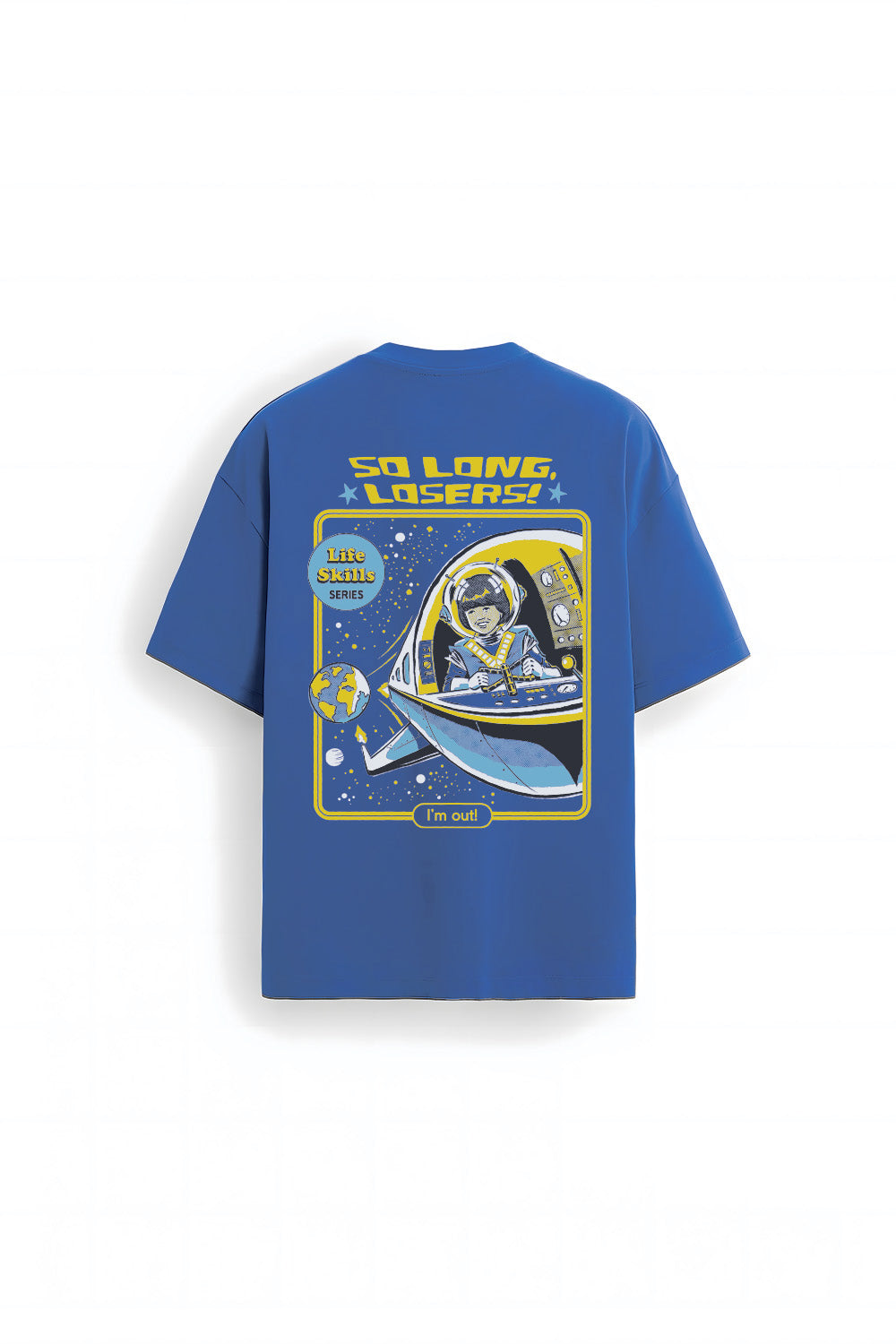 When Earth starts feeling like a group project gone wrong, there’s only one thing left to say: “I’m out.” The "I’m Out Oversized T-shirt" for women beams up your mood with a space-age escape plan printed in full comic-book glory. On the front, it keeps it cool with a minimal chest badge, but the back? That’s where the real lift-off happens—featuring a retro-style astronaut leaving the planet with a smirk and a bold “So long, losers!” farewell. Crafted in 100% cotton and grounded in a rich blue hue, this 240 GSM heavyweight tee is as breathable as it is bold, perfect for anyone ready to leave the chat (and the galaxy). With an oversized fit made for maximum chill and zero emotional baggage, it’s ideal for introverts, over-thinkers, or anyone who's had enough of the group text. Wash cold, skip the bleach unless you’re erasing history, tumble dry low, and iron warm if your alien overlords demand it.