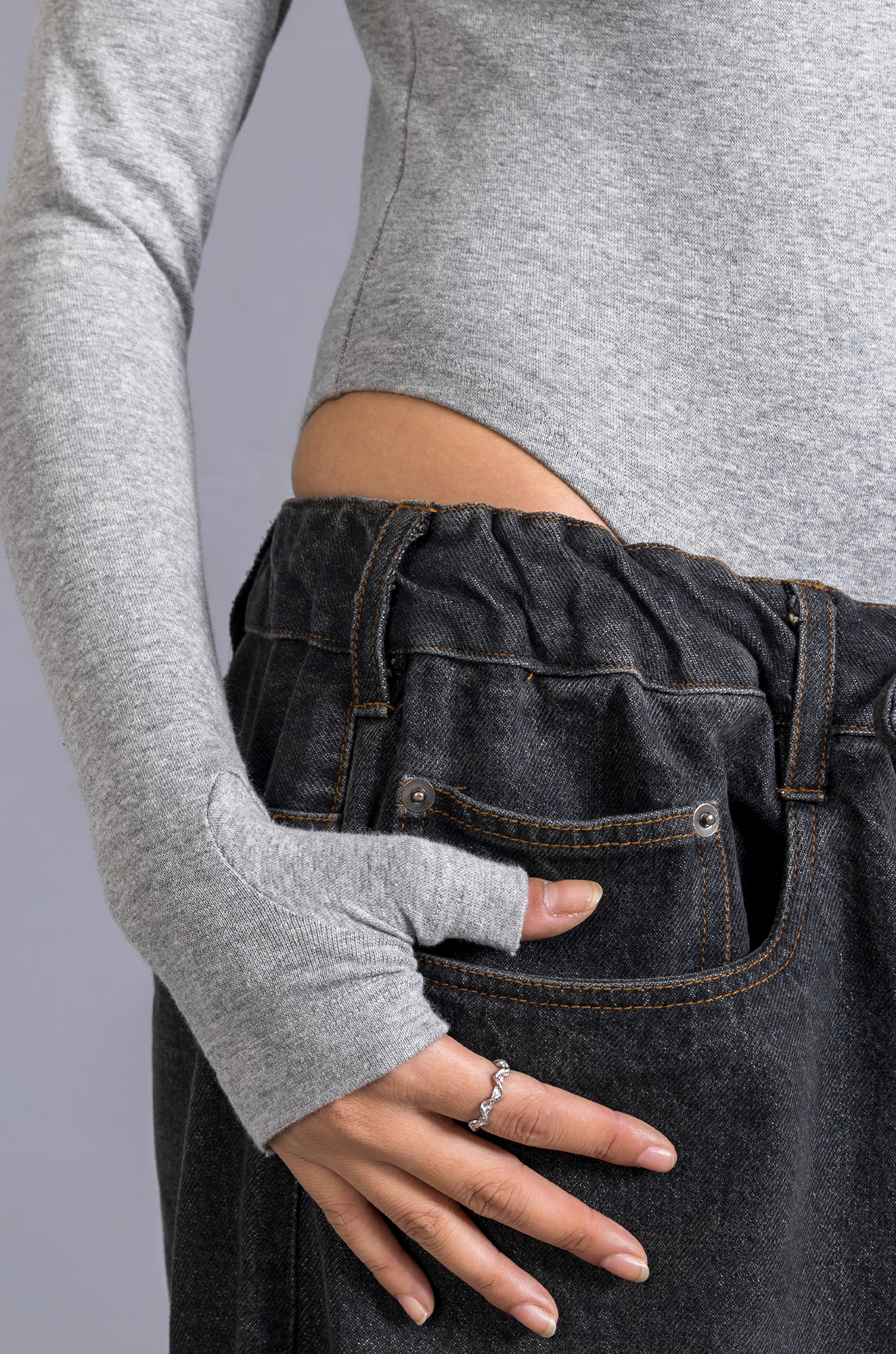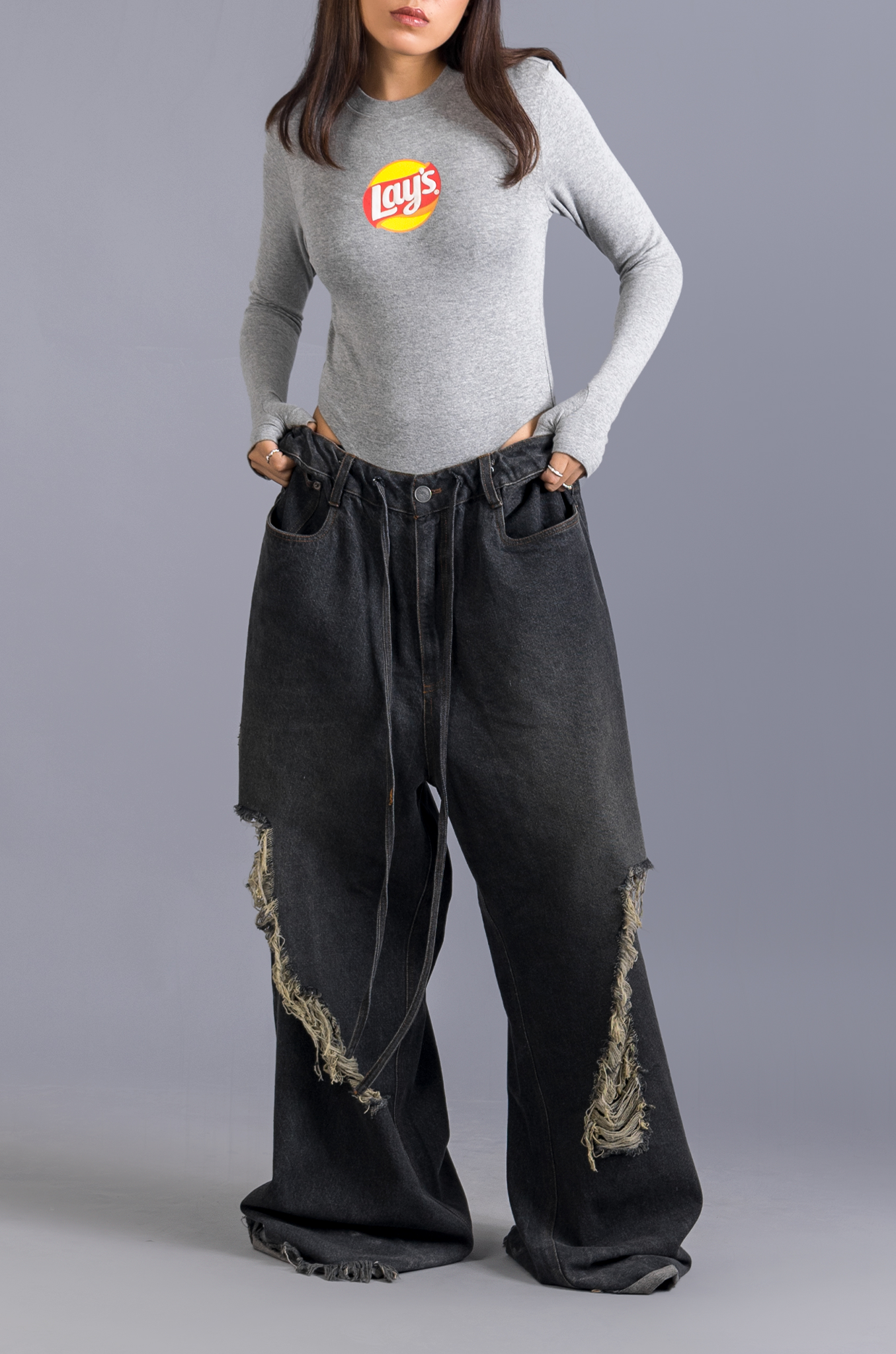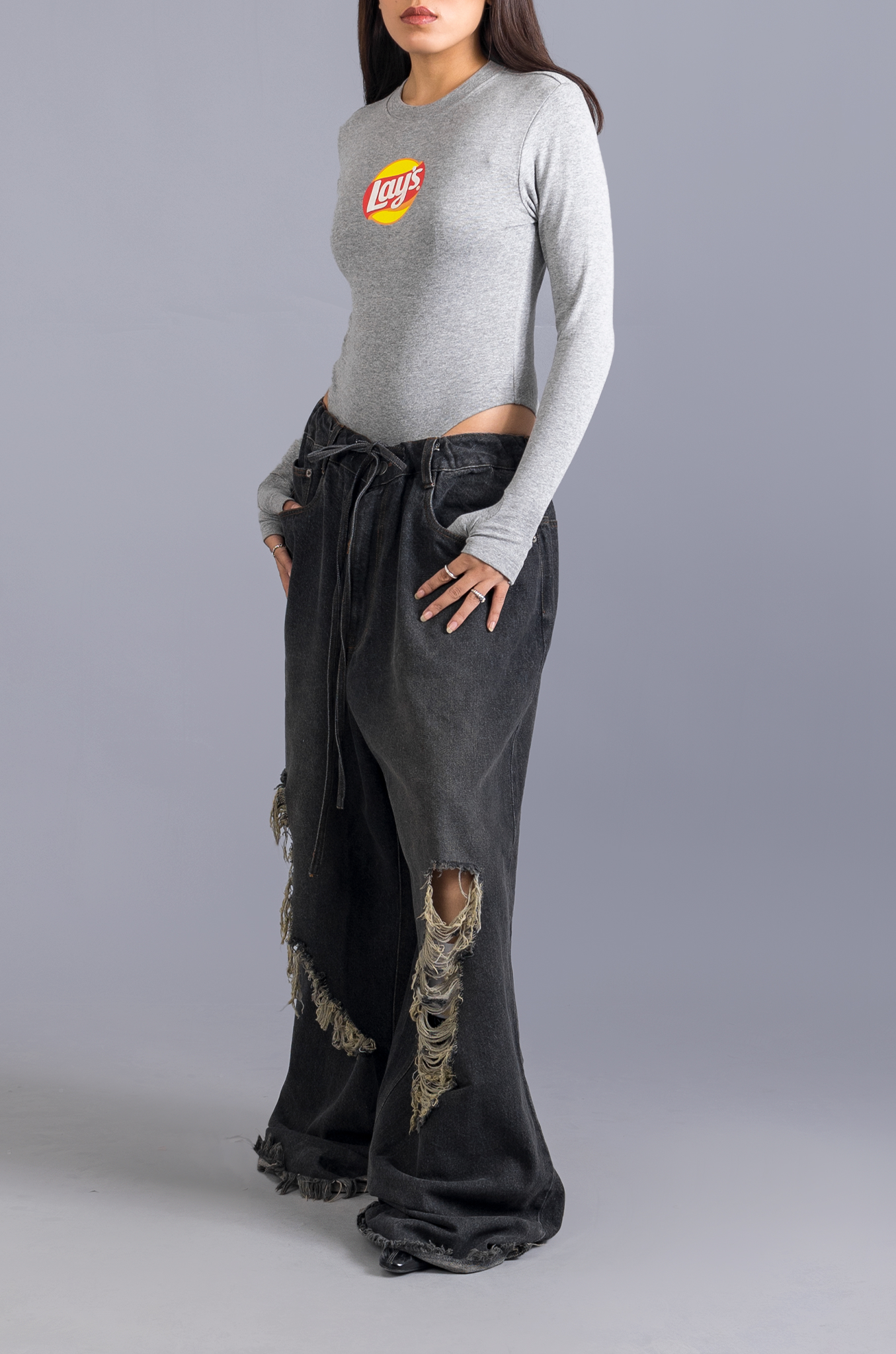 100% cotton HUEMN bodysuit, featuring a thumb-gloved sleeve. Finished with Lay's 3-D rubberized logo.