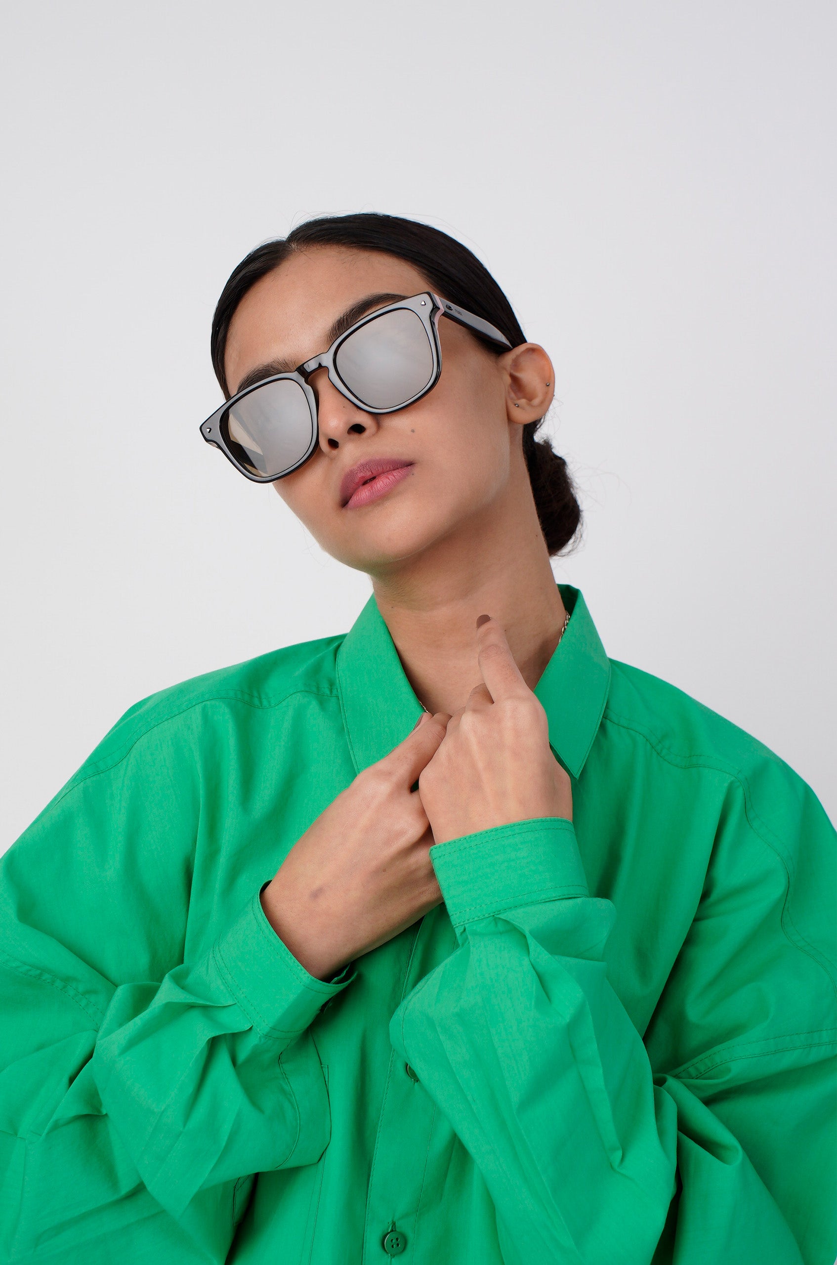 In HUEMN's newest lime green, this shirt features oversized patch pockets and an uneven raw edged asymmetric hemline- a recognizable feature of the entire 'Darwyn' capsule.