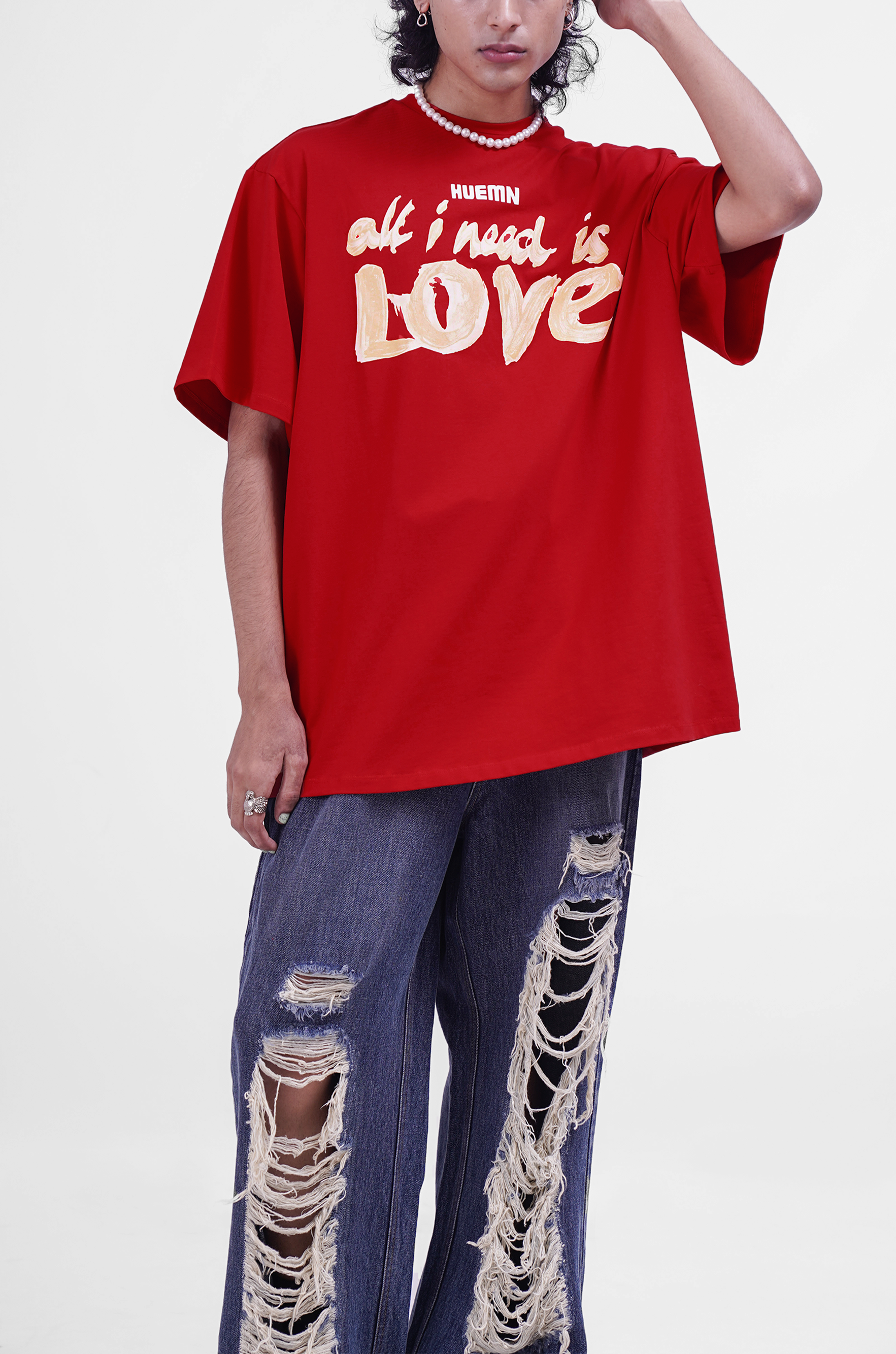 Product features rubberized hand-painted 'All I need is Love' graphic print on front with distinct HUEMN graphic details on front and back.