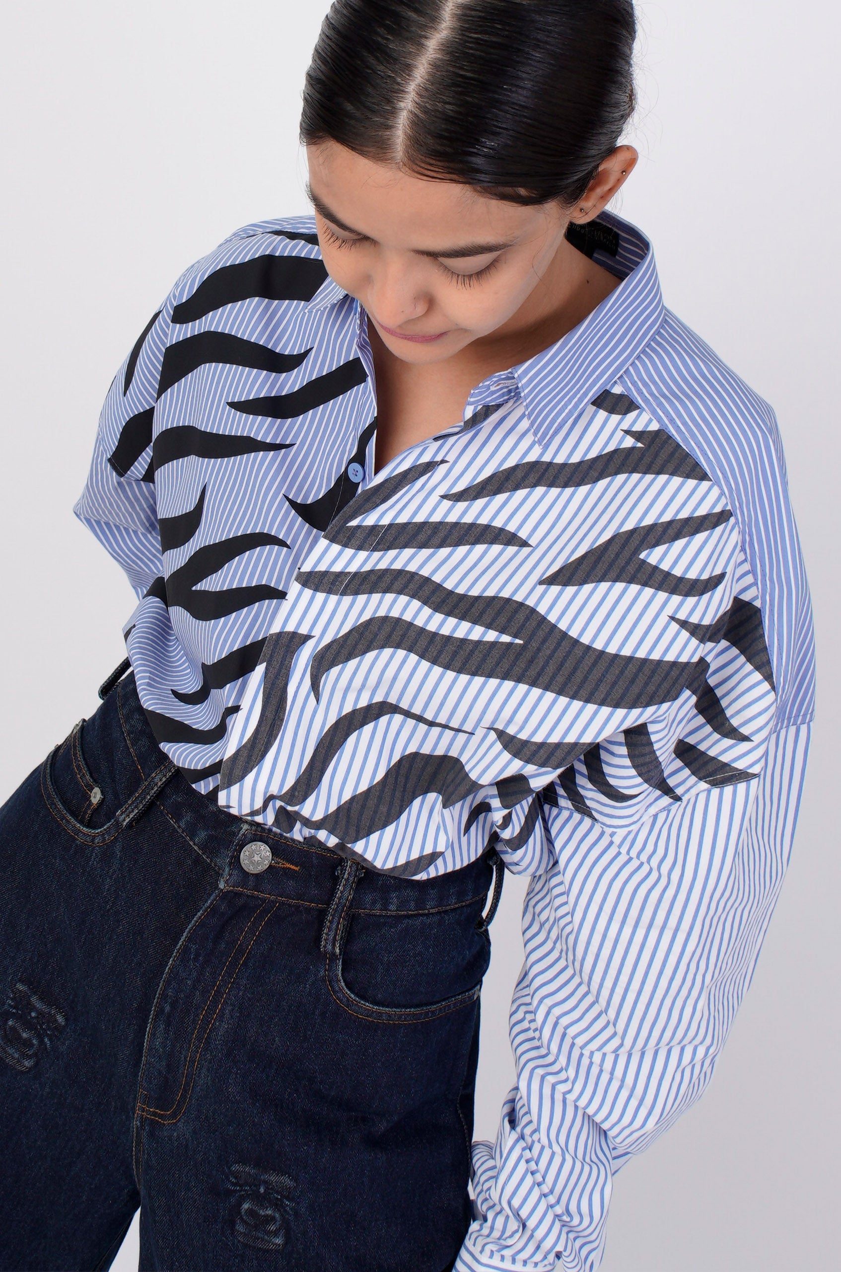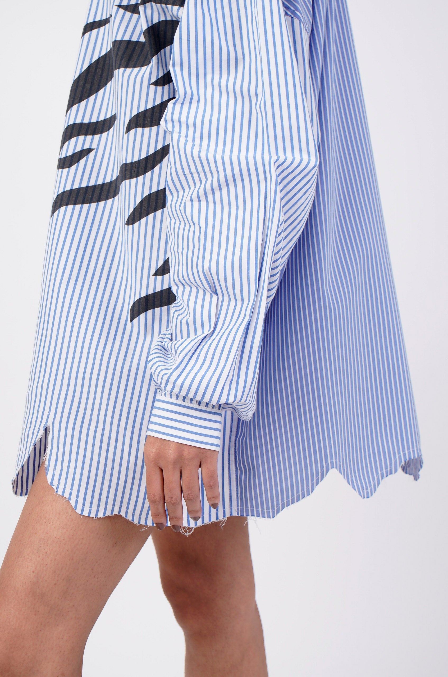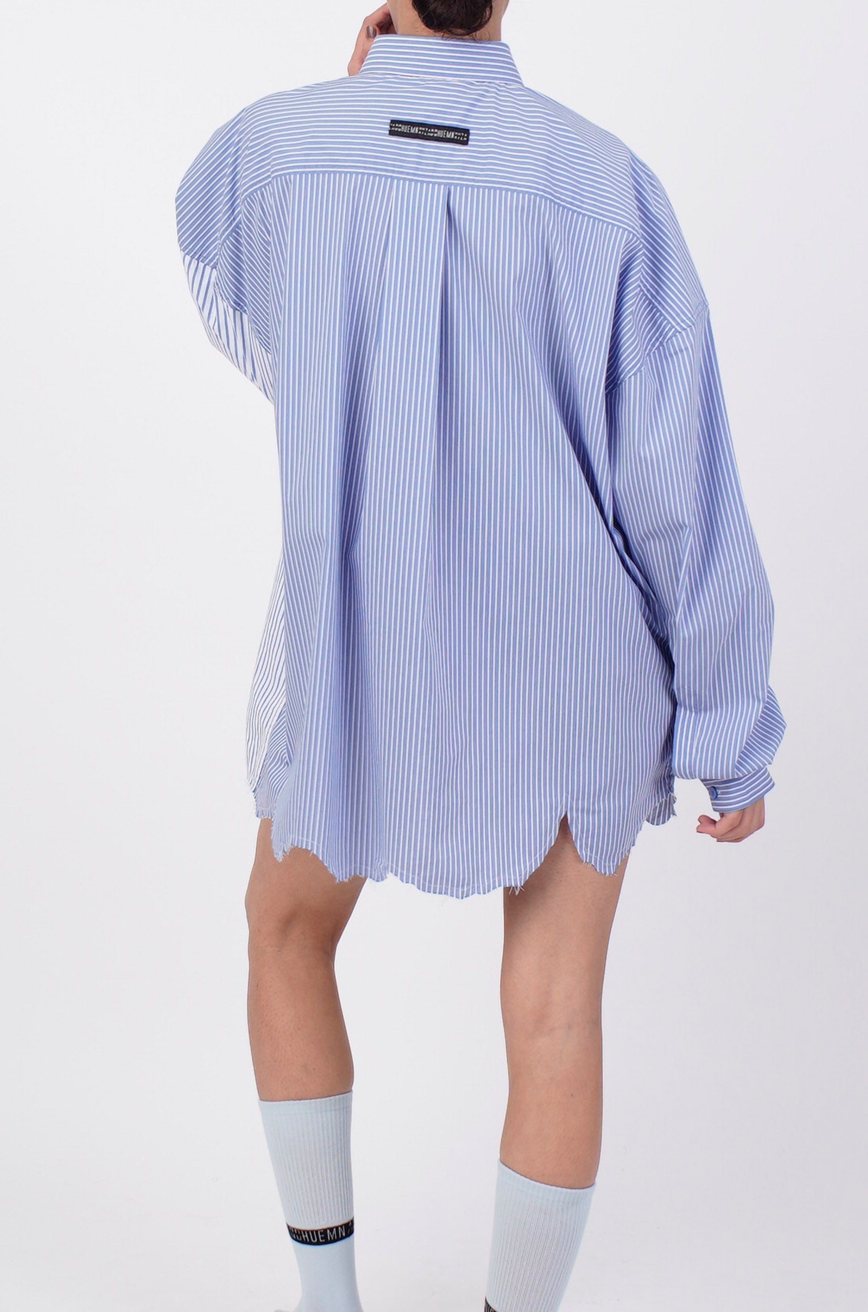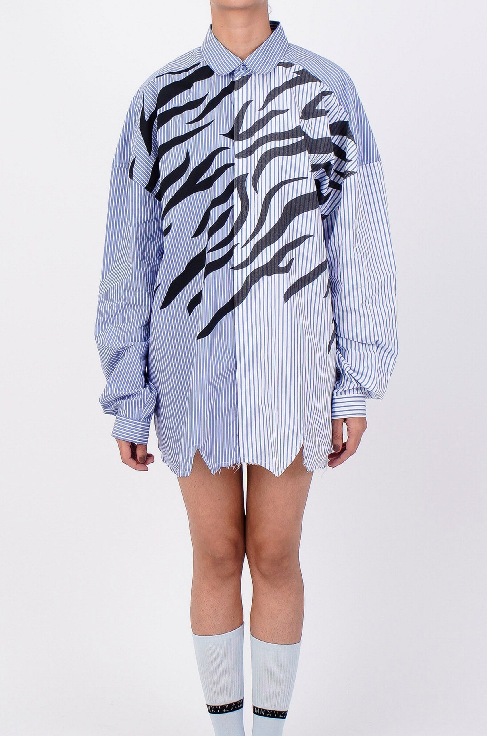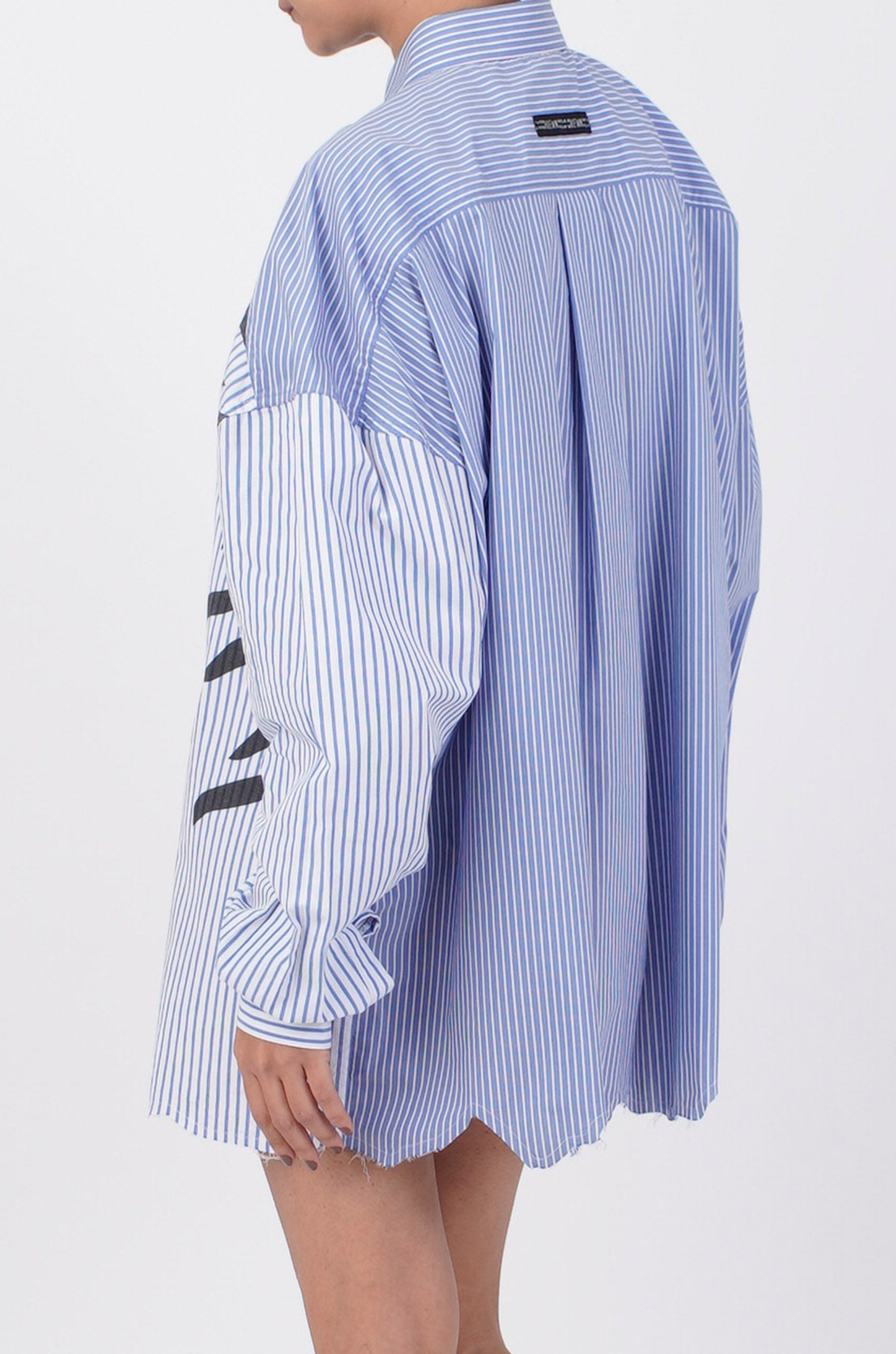 This pinstriped shirt features HUEMN's mutant water-based screen print and an uneven raw edged asymmetric hemline- a recognizable feature of the entire 'Darwyn' capsule.