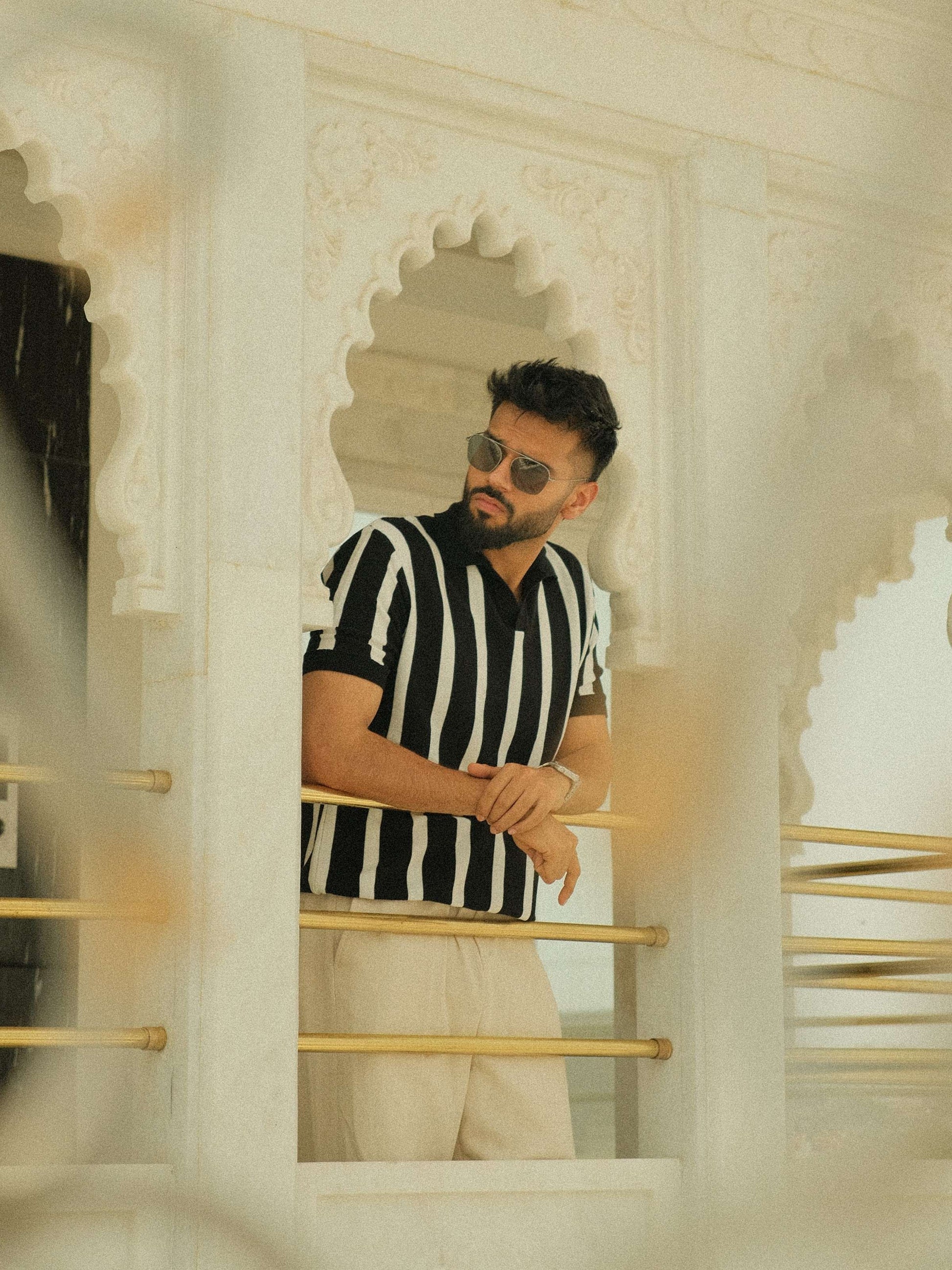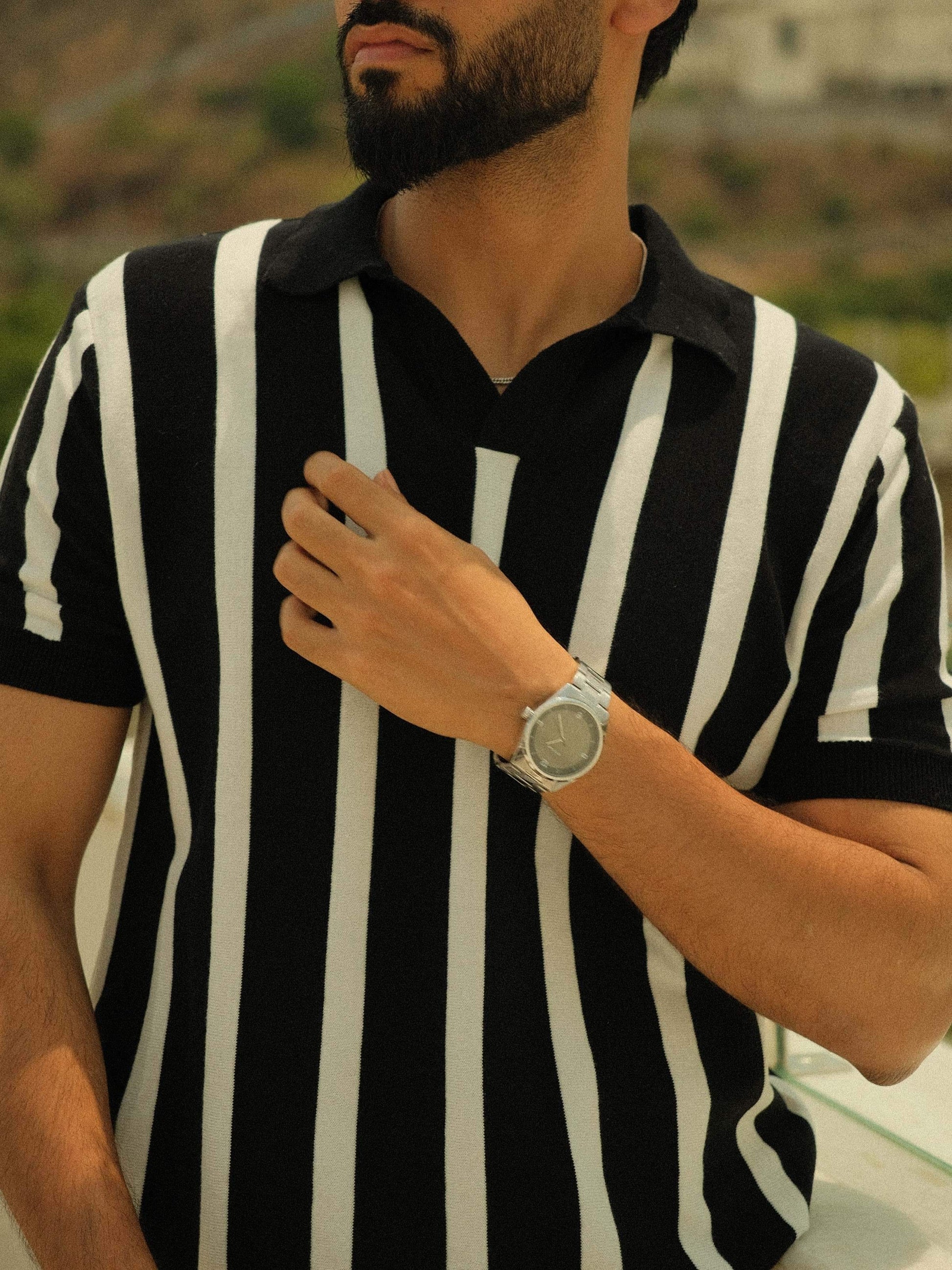Elevate your wardrobe with Contrast, our latest old money stripe polo that exudes quiet luxury. This polo is crafted from a premium knitted textile, ensuring a perfect blend of sophistication and comfort. The slim fit design, combined with timeless black and white vertical stripes, creates a sleek and refined look that's perfect for any occasion.