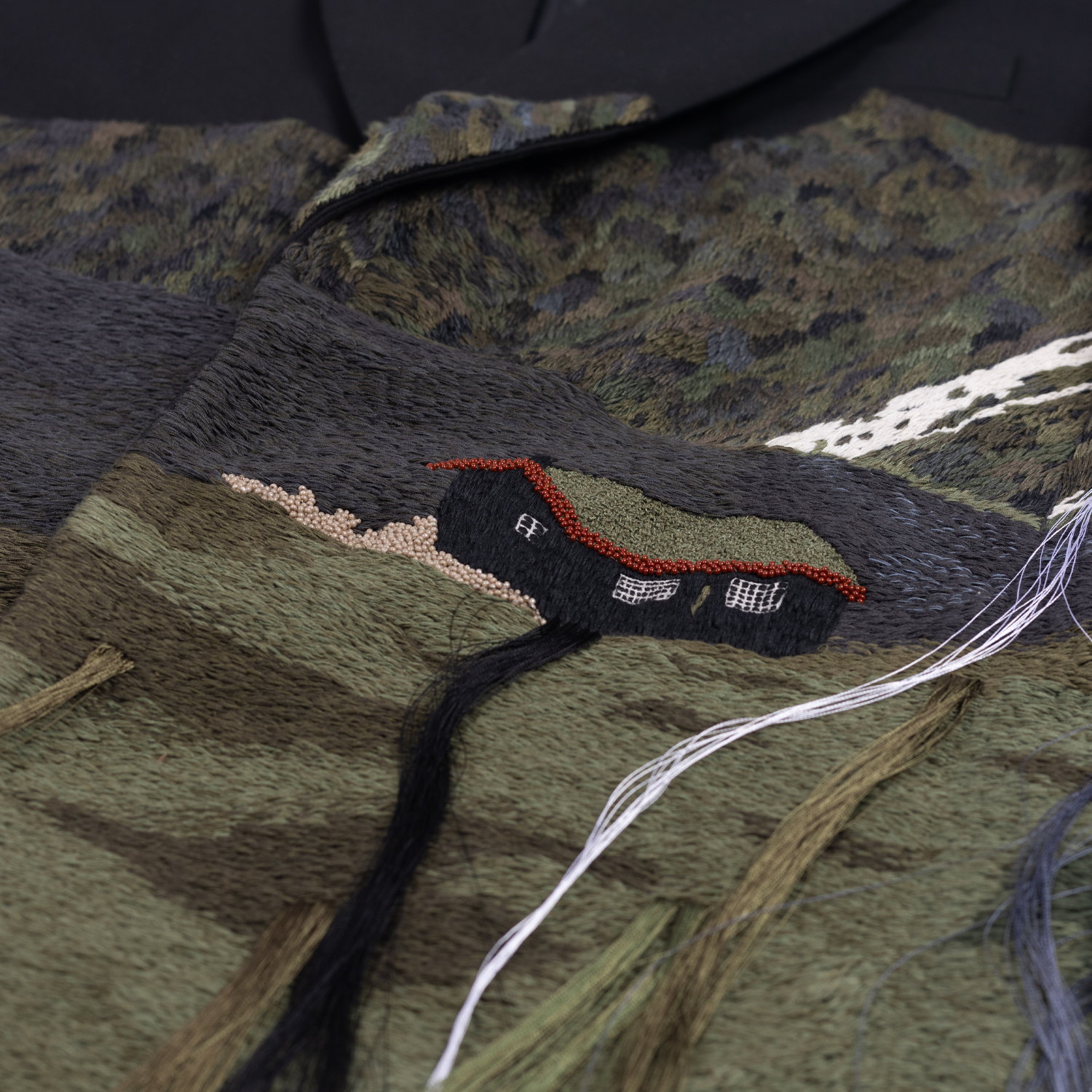Unisex, oversized, single-breasted jacket featuring 'Scandinavian house' embroidery on the chest with silk thread streams. It has notched lapels, button cuffs, and double rear vents.