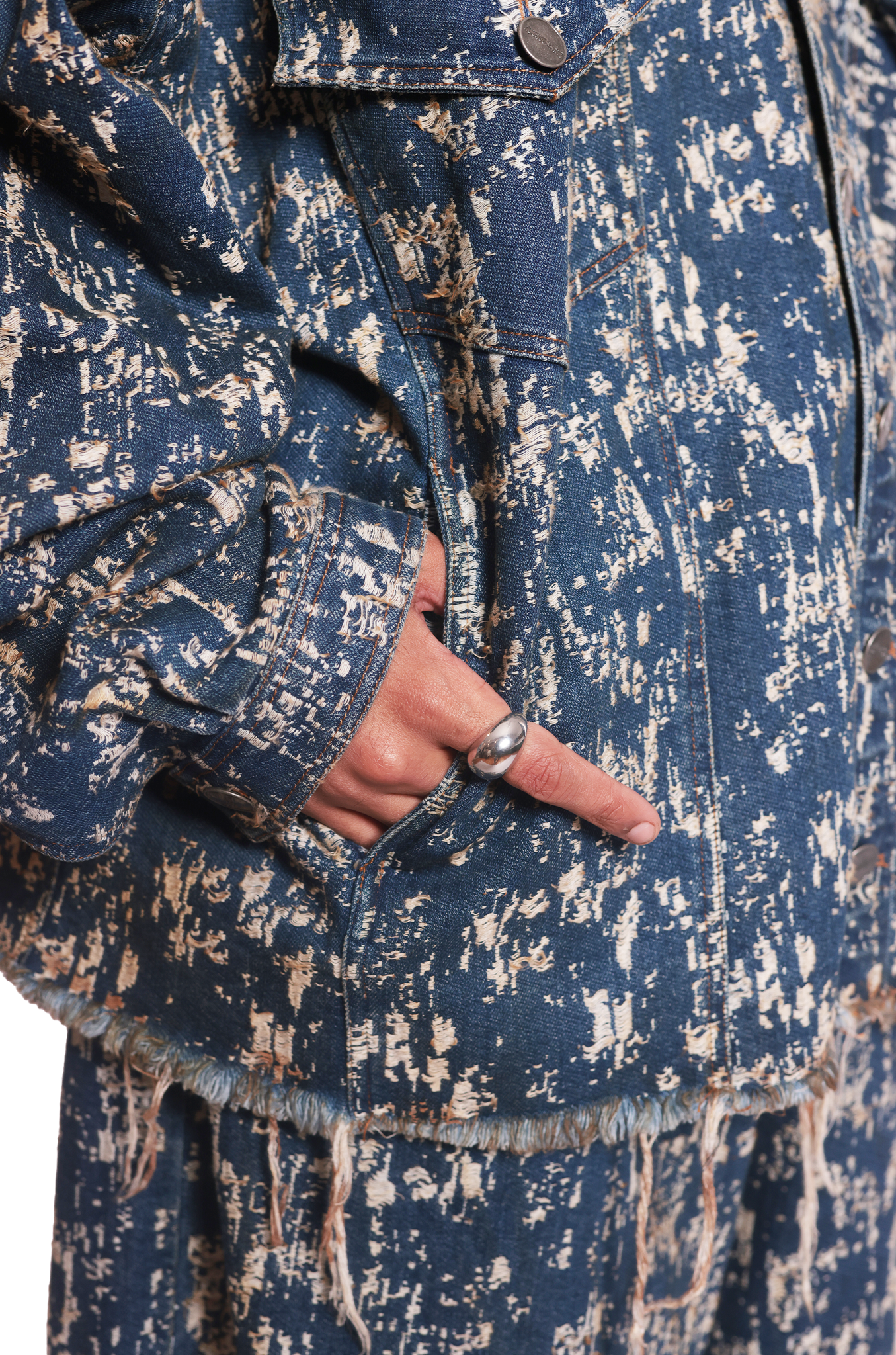This jacket is made using a jacquard weaved denim with a subtle yellow tint throughout. Jacquard fabric is a type of fabric woven on a Jacquard loom.