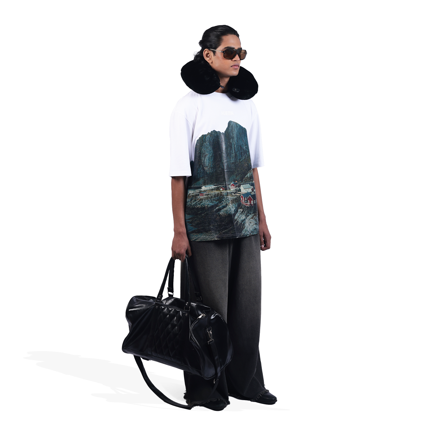 Product features a rubberized print of a 'Scandinavian landscape' on front with distinct HUEMN graphic details on the front and back.