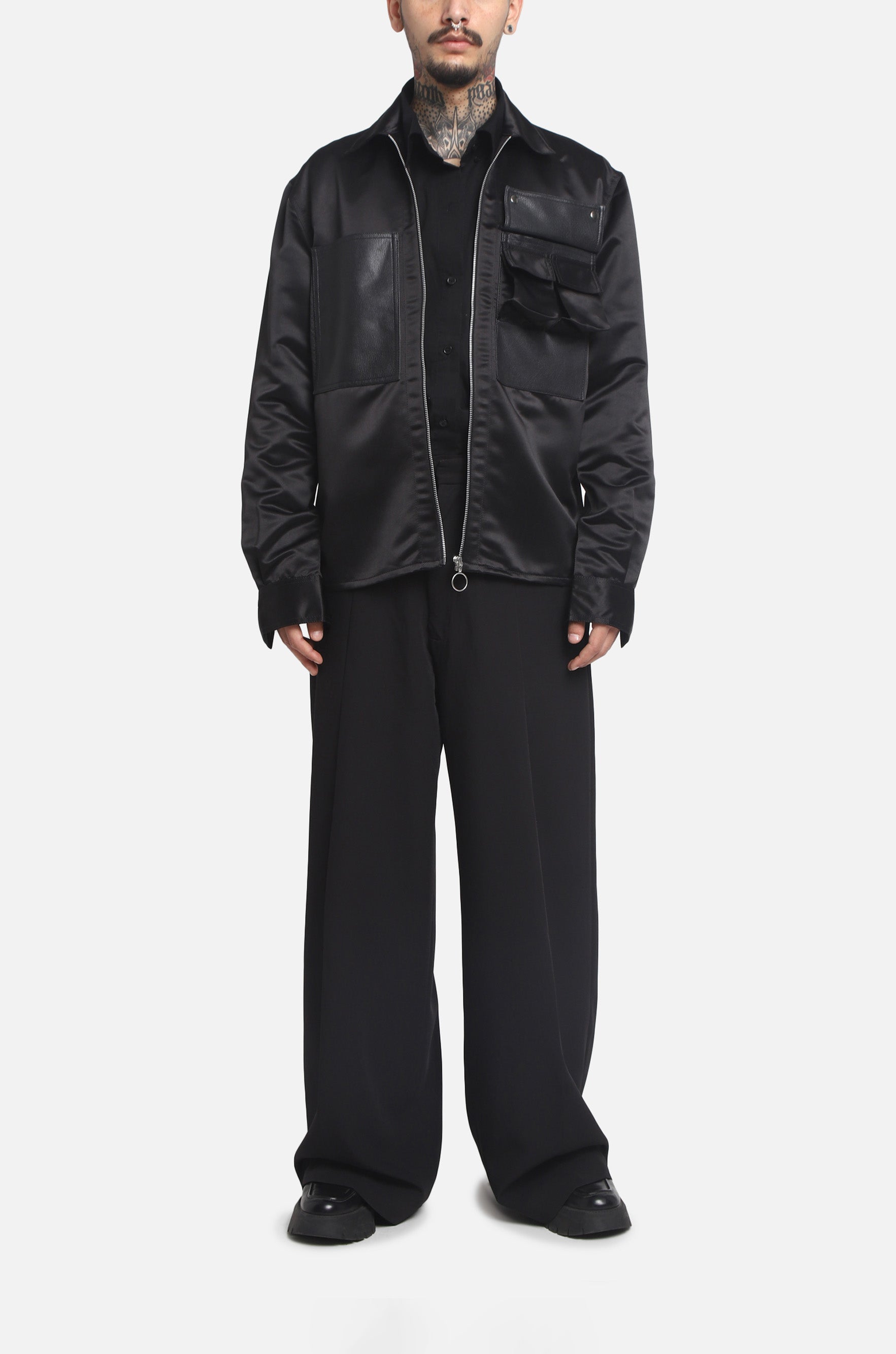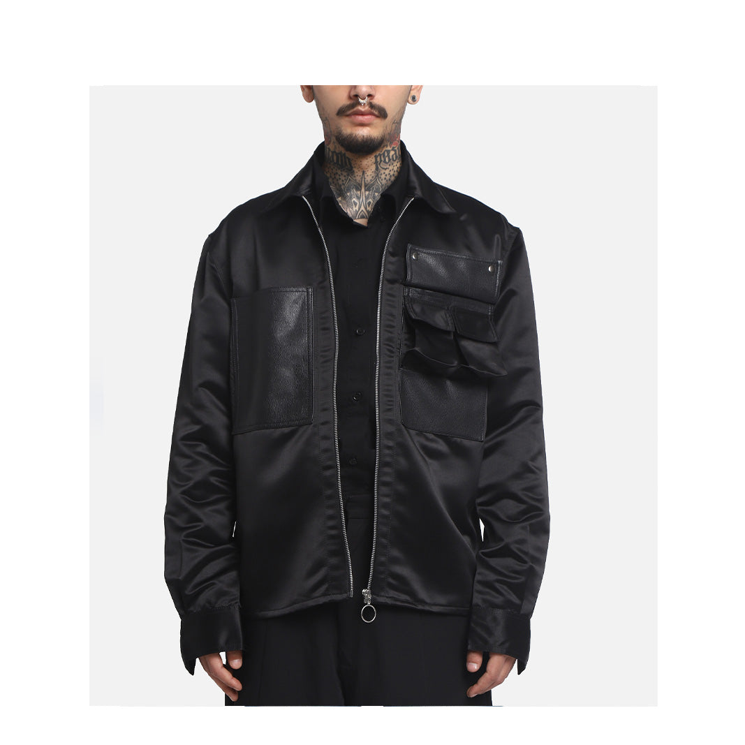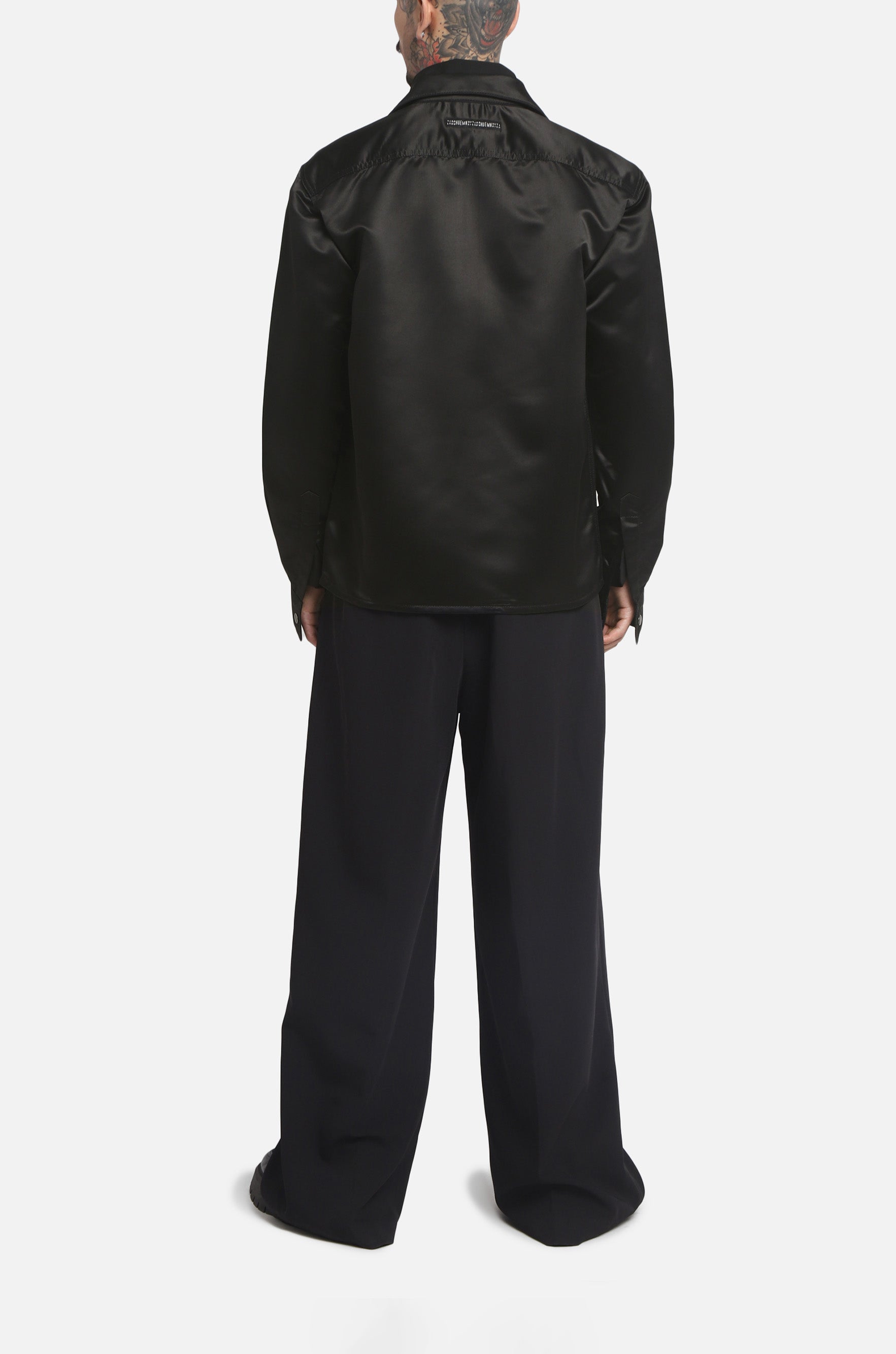 Comfortable and lightweight shirt jacket. Crafted in heavy satin, unisex silhouette, cut for a true-to-size fit with a multi-patched pocket detailing on the front and a puckered edge detailing overall. Perfect on its own or as an outer layer.