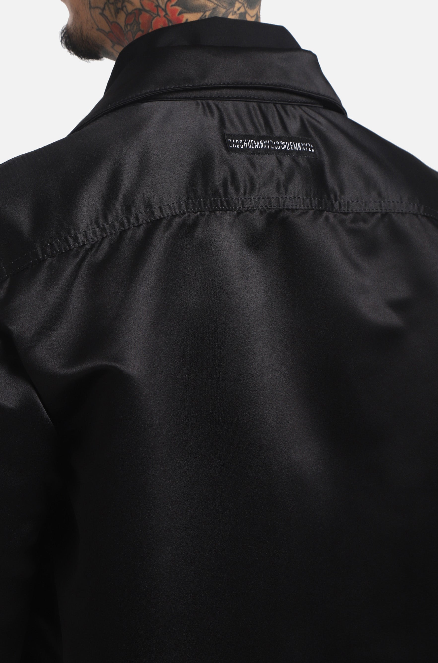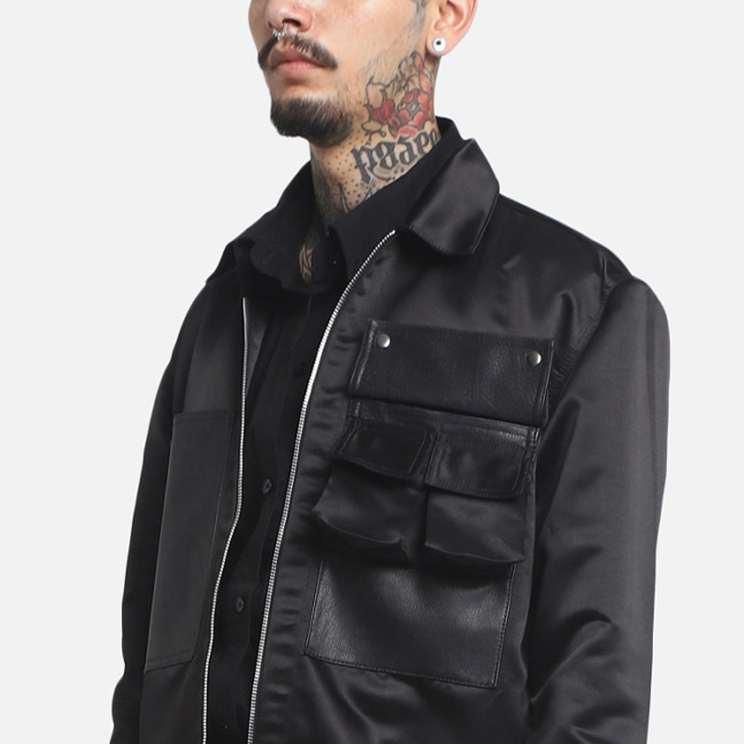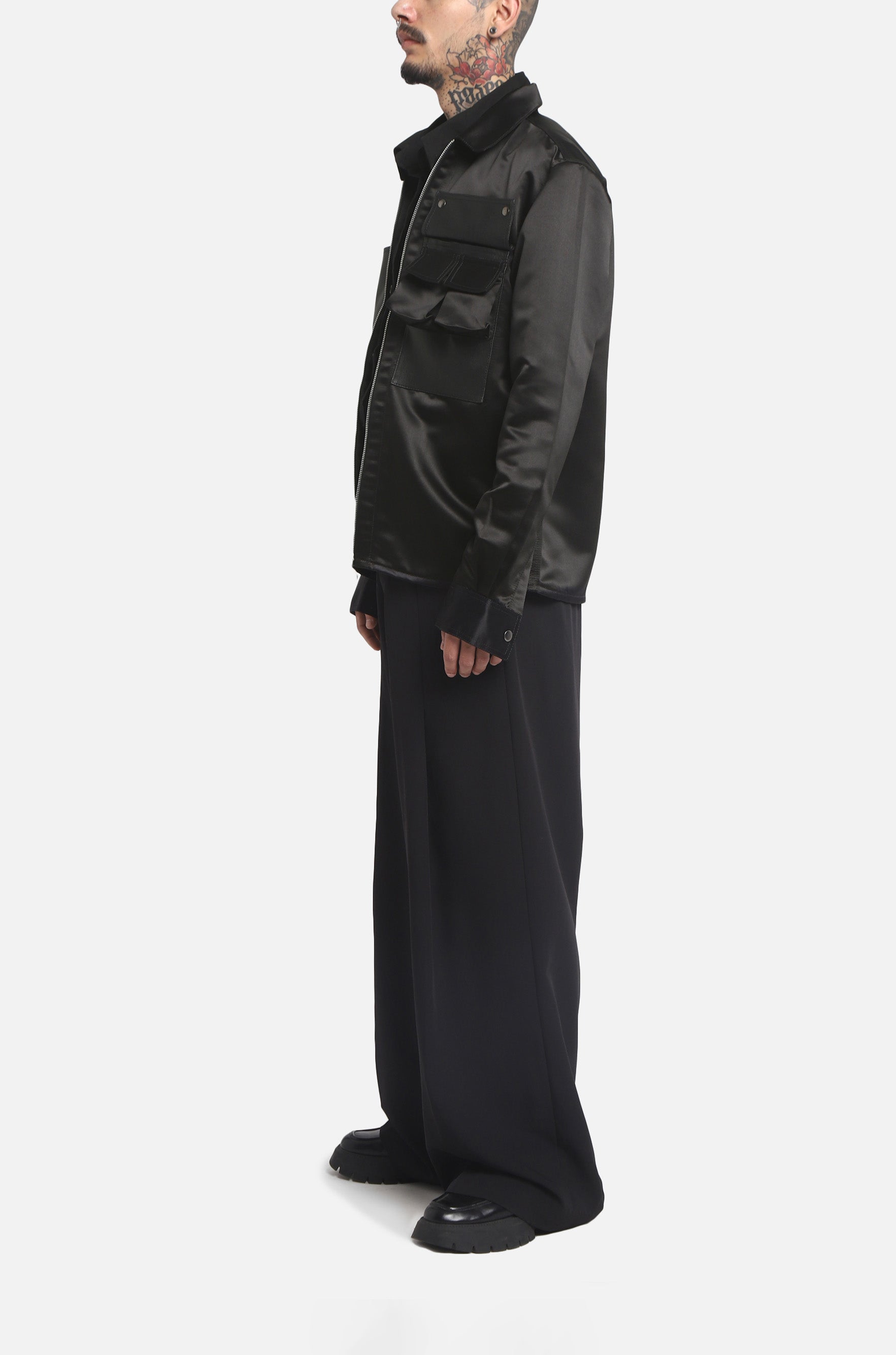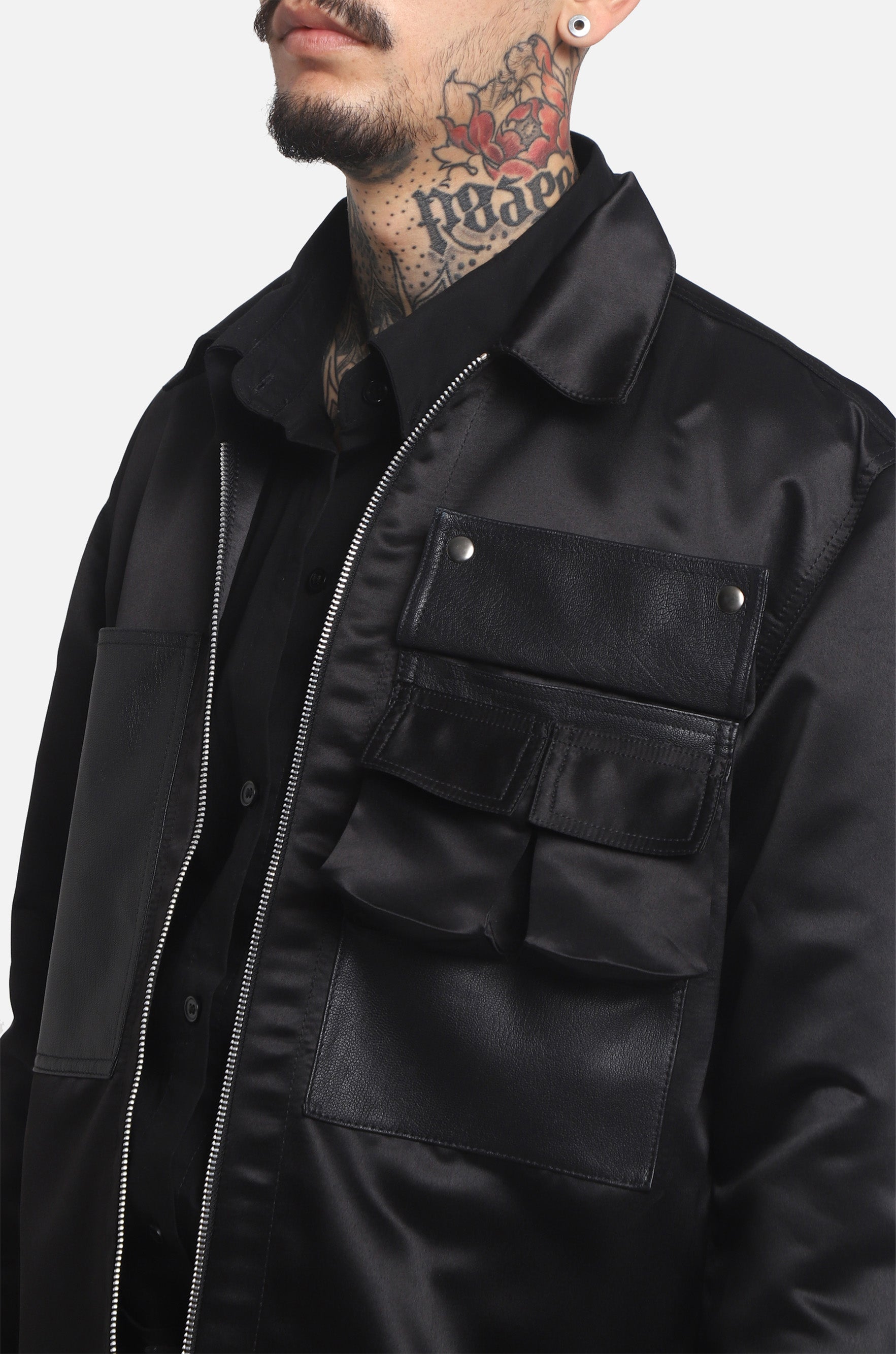 Comfortable and lightweight shirt jacket. Crafted in heavy satin, unisex silhouette, cut for a true-to-size fit with a multi-patched pocket detailing on the front and a puckered edge detailing overall. Perfect on its own or as an outer layer.