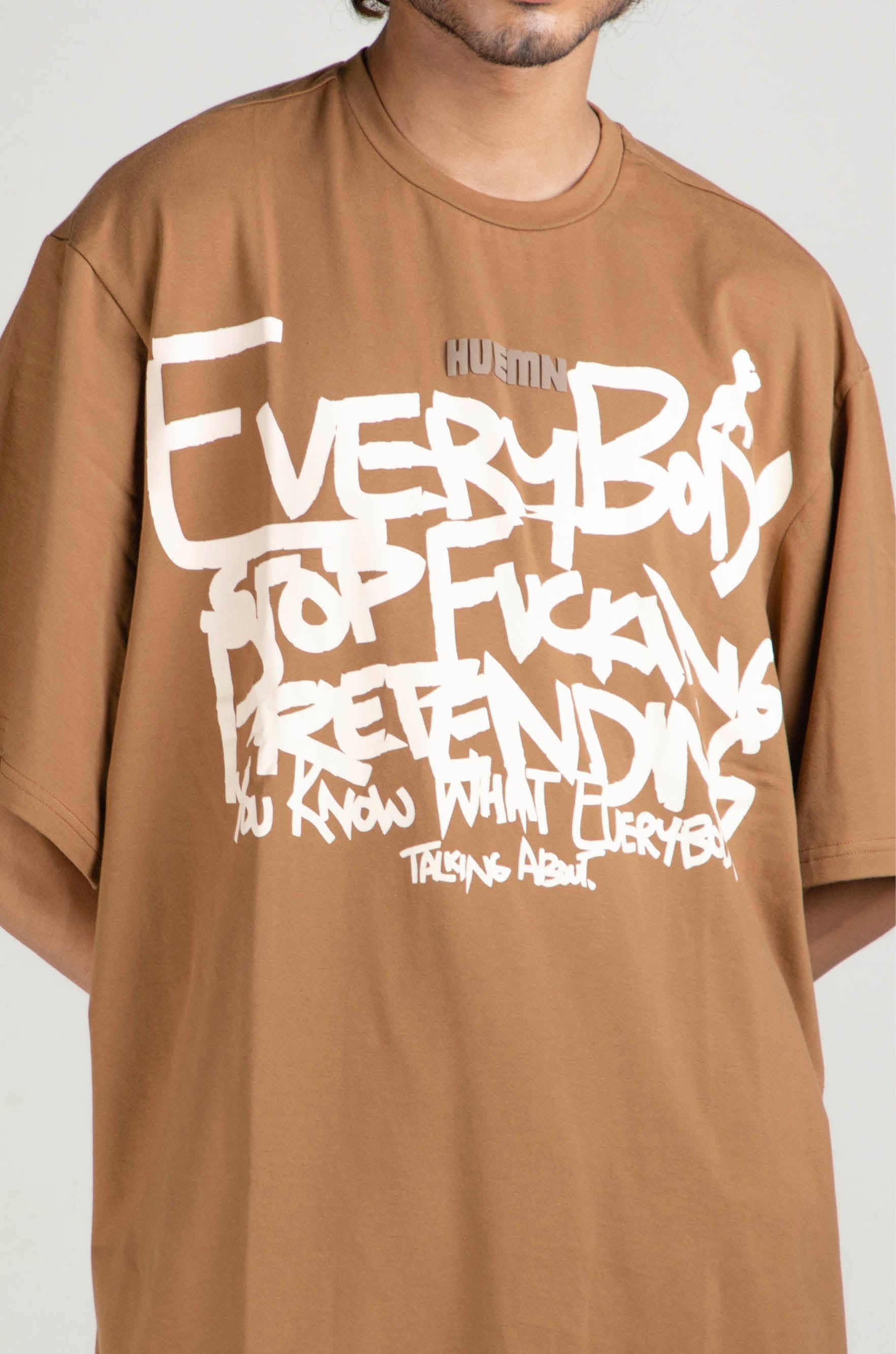 Product features water-based screen print on front with a handwritten text: "Everybody stop fucking pretending you know what everybody's talking about"; and distinct HUEMN graphic details on front and back.