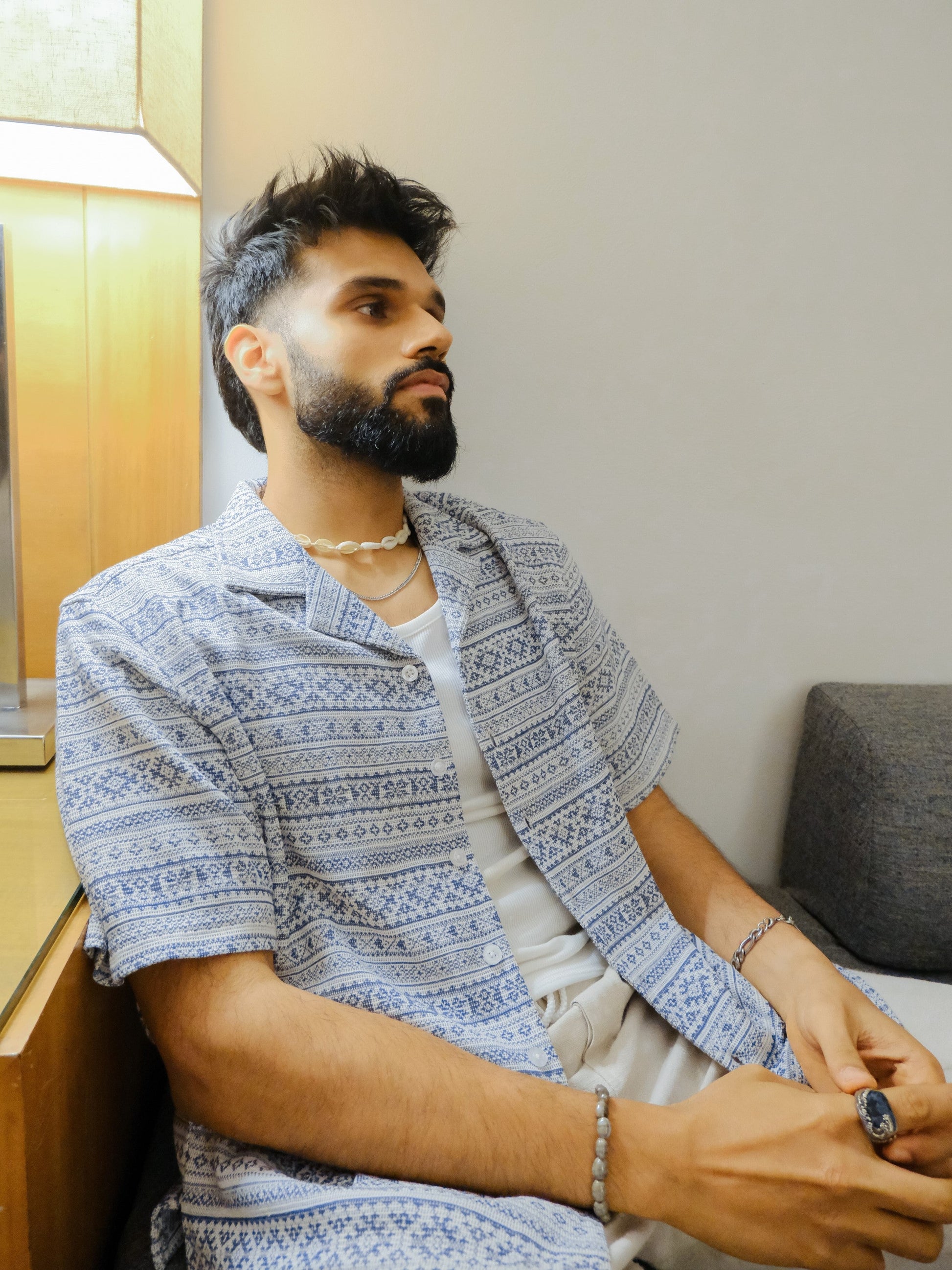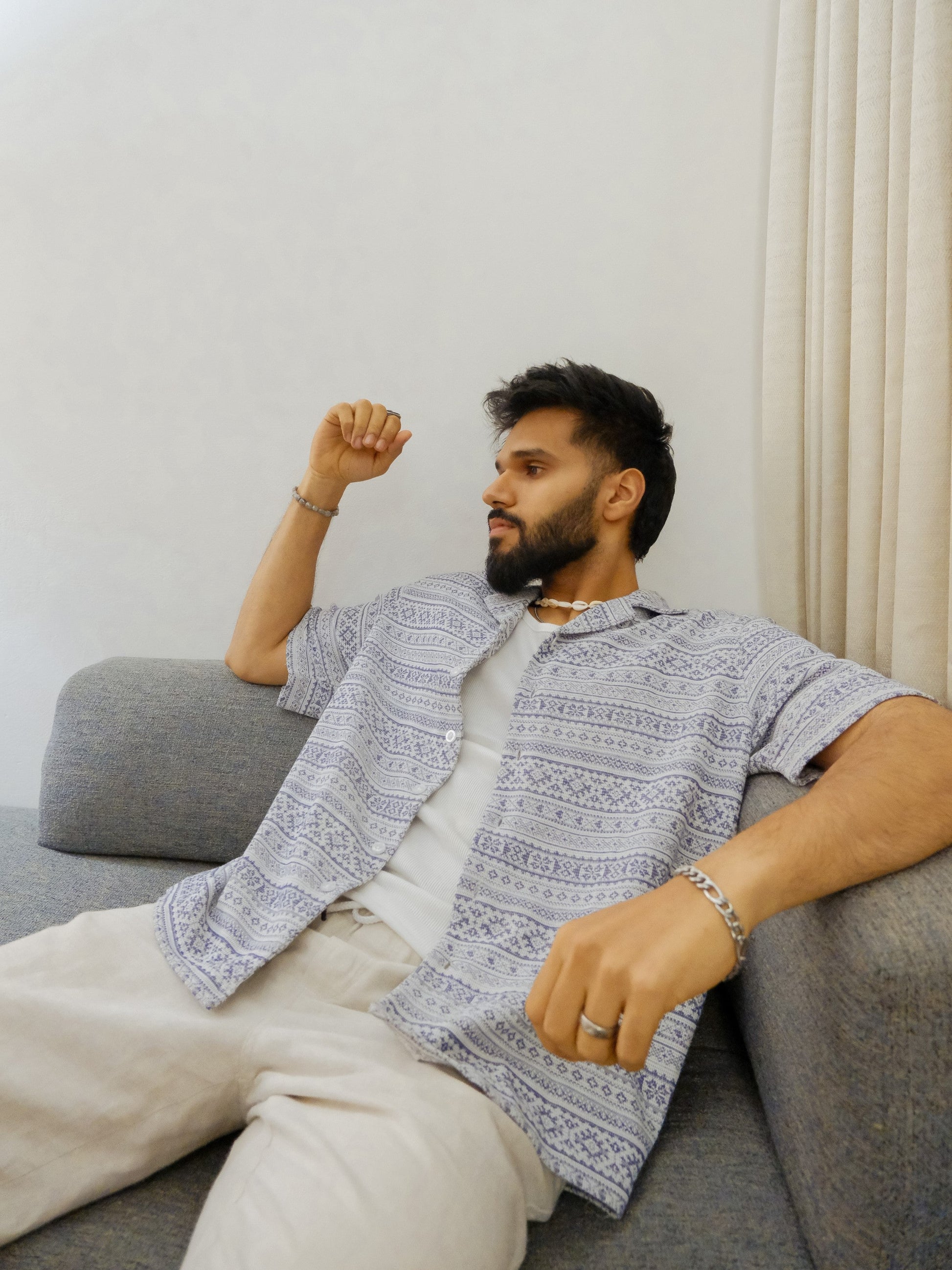 "Introducing our latest must-have for the trendsetting Indian guy: the Aztec Shirt in mesmerizing Ajmer blue! Crafted from the comfiest cotton knitted fabric, it's as stylish as it is comfy. The Aztec design adds a pop of personality, perfect for those who love streetwear with a twist. With its Resort Fit, it's all about laid-back vibes and effortless cool. Whether you're hitting the streets or chilling with friends, this shirt has got you covered. Say hello to your new wardrobe favorite! And hey, not only does it look good, but it feels amazing too. No wonder it's destined to be an instant hit. Grab yours now and level up your style game. After all, why settle for ordinary when you can stand out in Aztec style? Get noticed, get comfy, get the Aztec Shirt today!"