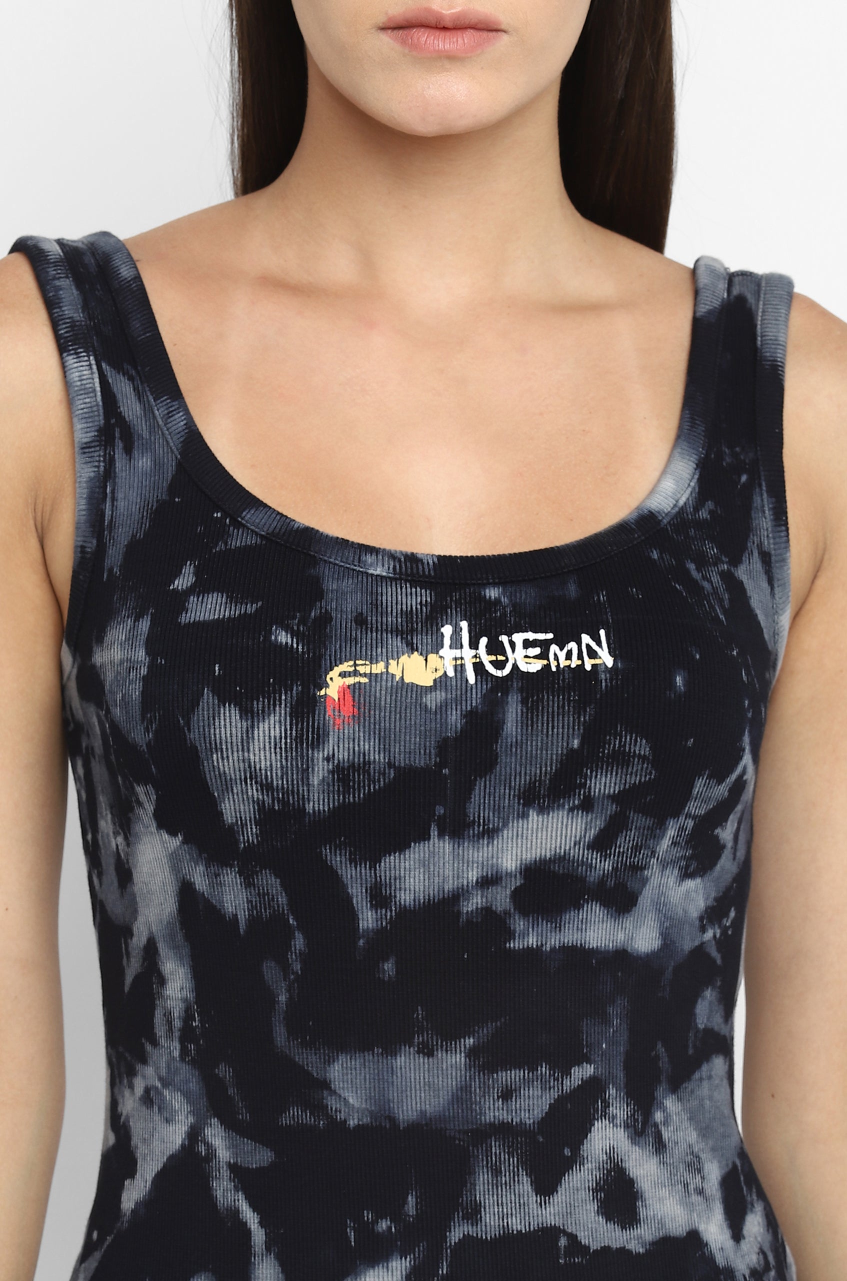 Signature HUEMN silhouette body-con dress in 100% cotton rib that hugs and moulds around your curves in a stretchable knit, with all-over tie & dye denim-wash effect.